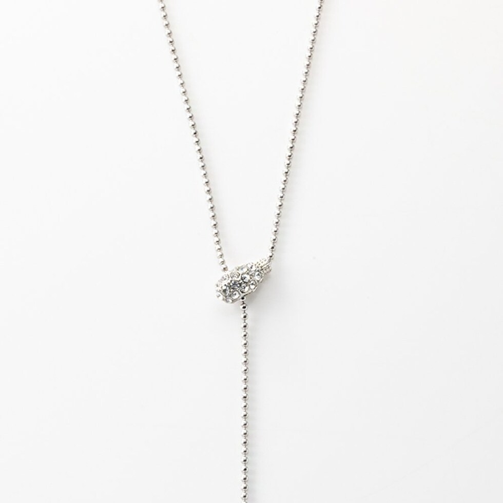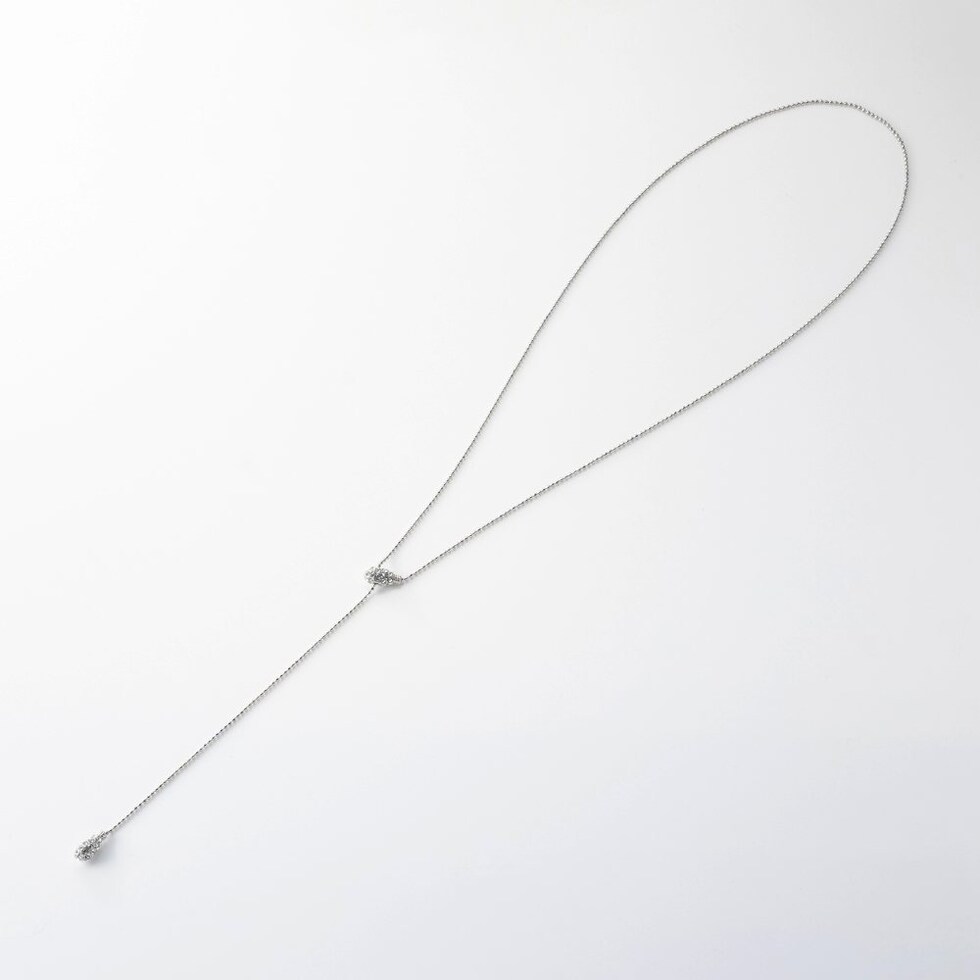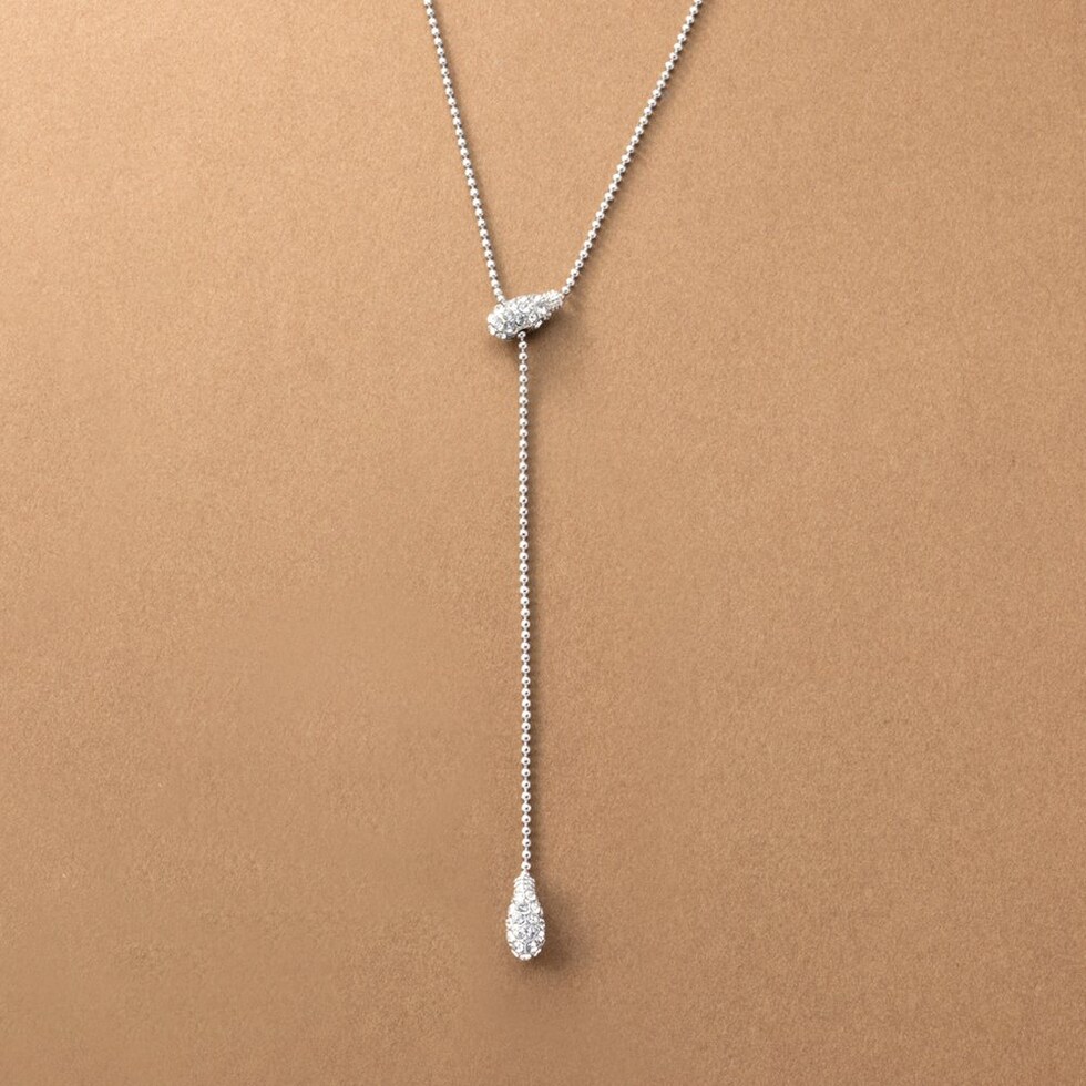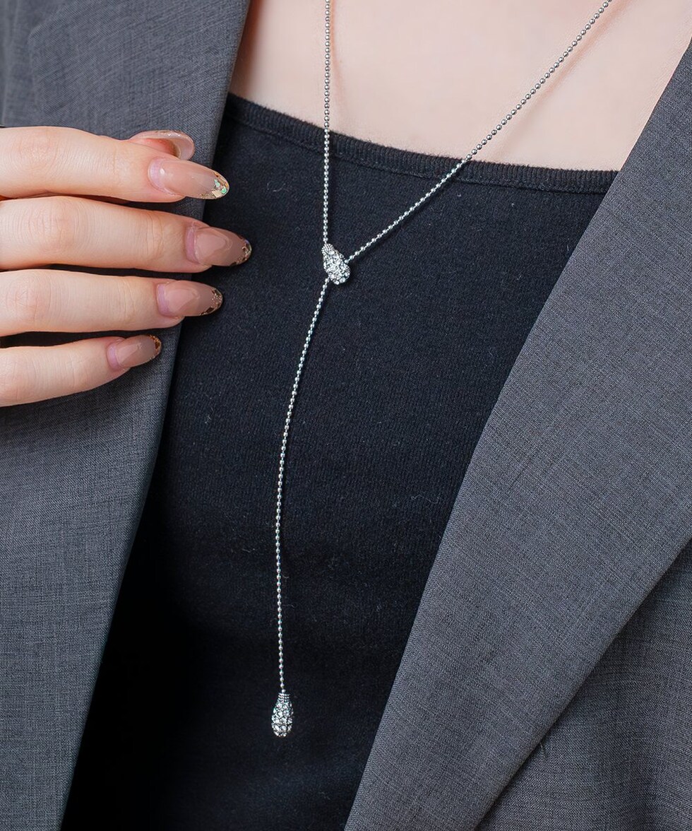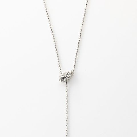 パヴェデザインのドロップモチーフが繊細な煌めきを放つY字ネックレス。華奢なボールチェーンが派手すぎず、さりげないアクセントをプラスします。スライド式アジャスターでお好みのバランスに調節が可能でデイリー使いにぴったりの一品。