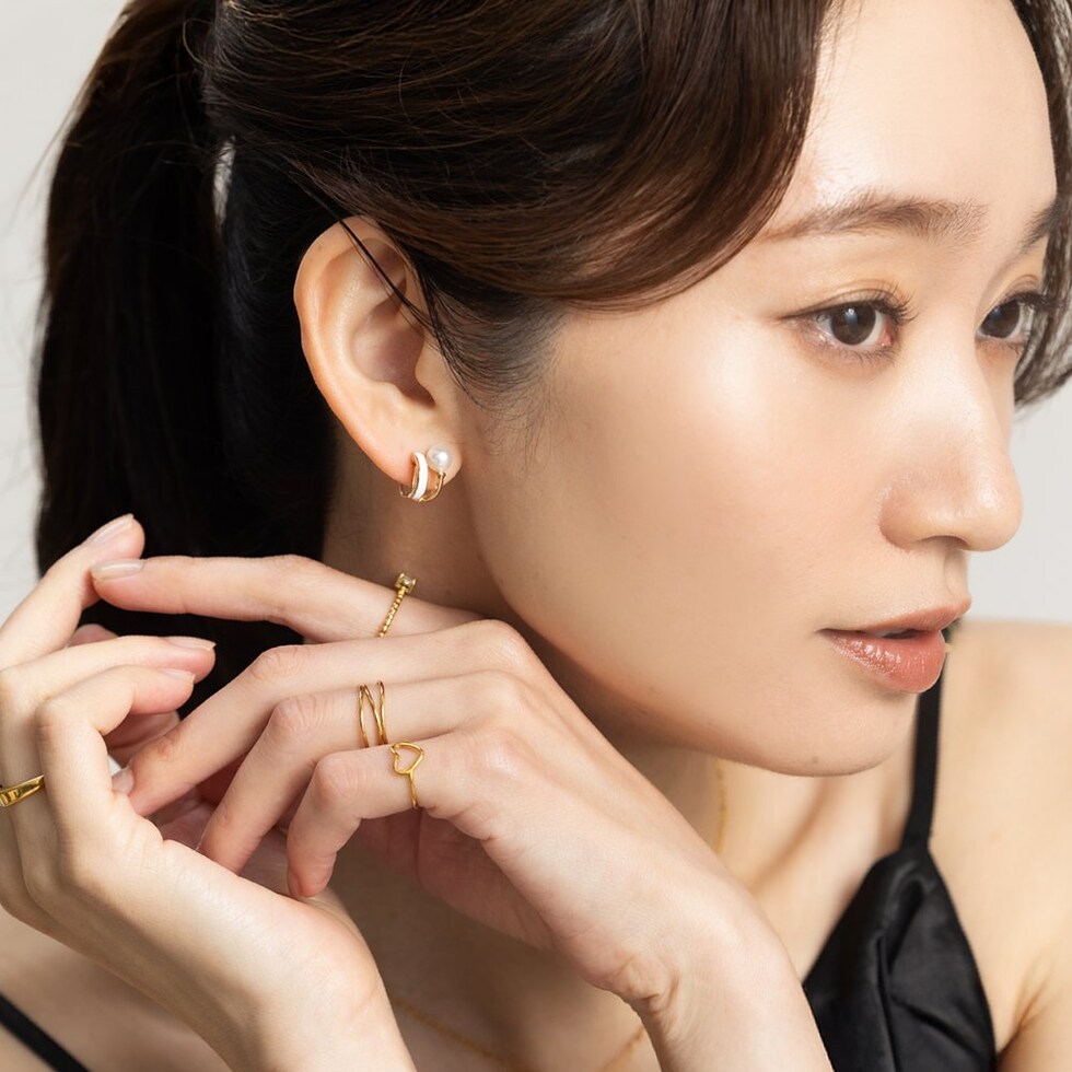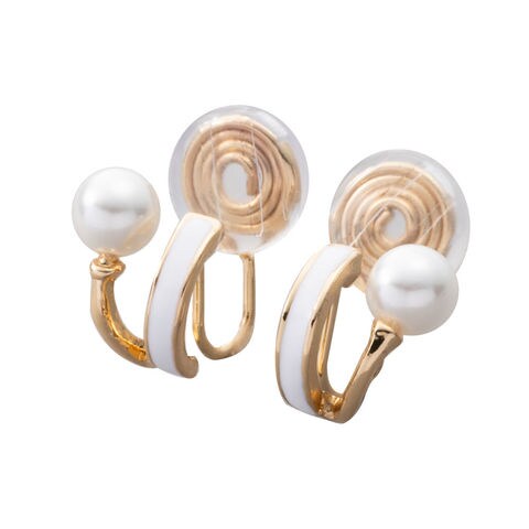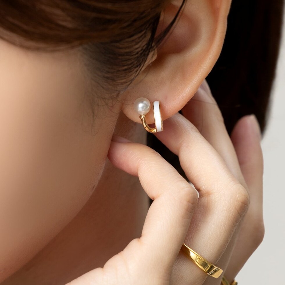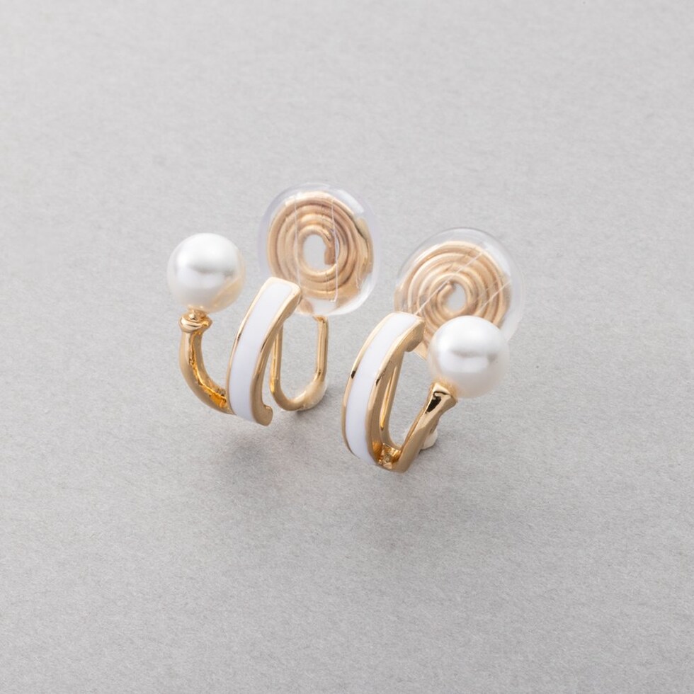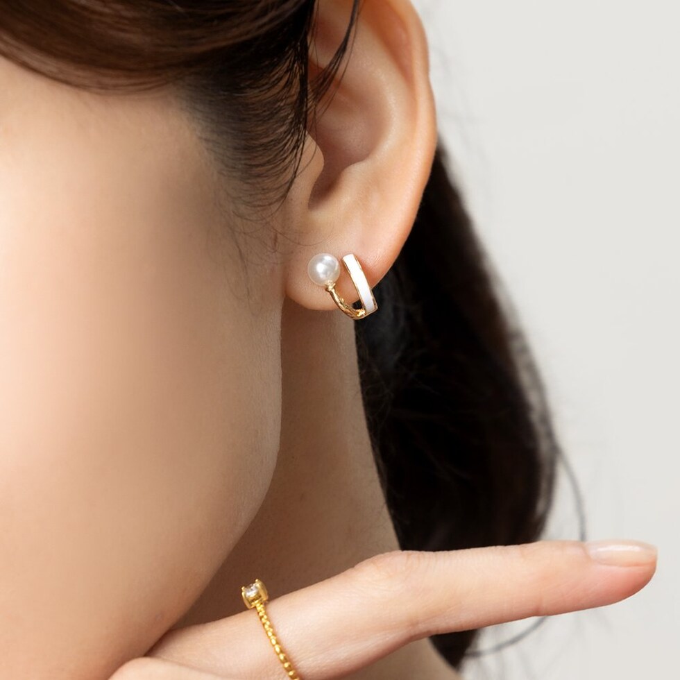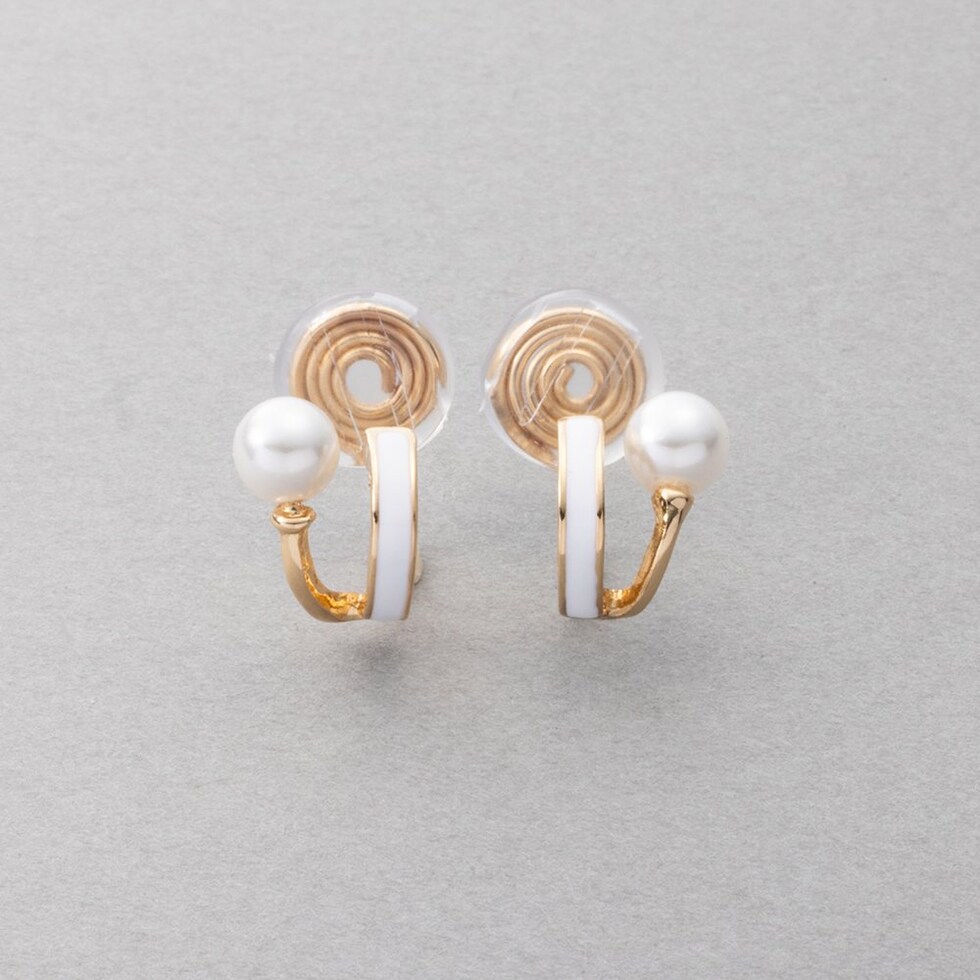 ホワイトカラーのエポキシラインとパールのワイヤーフィットイヤリング。パールをアクセントにしたデザインが大人に似合うひと品。ピアスのようにすっきり見え、様々なシーンにマッチするオススメのアイテムです。