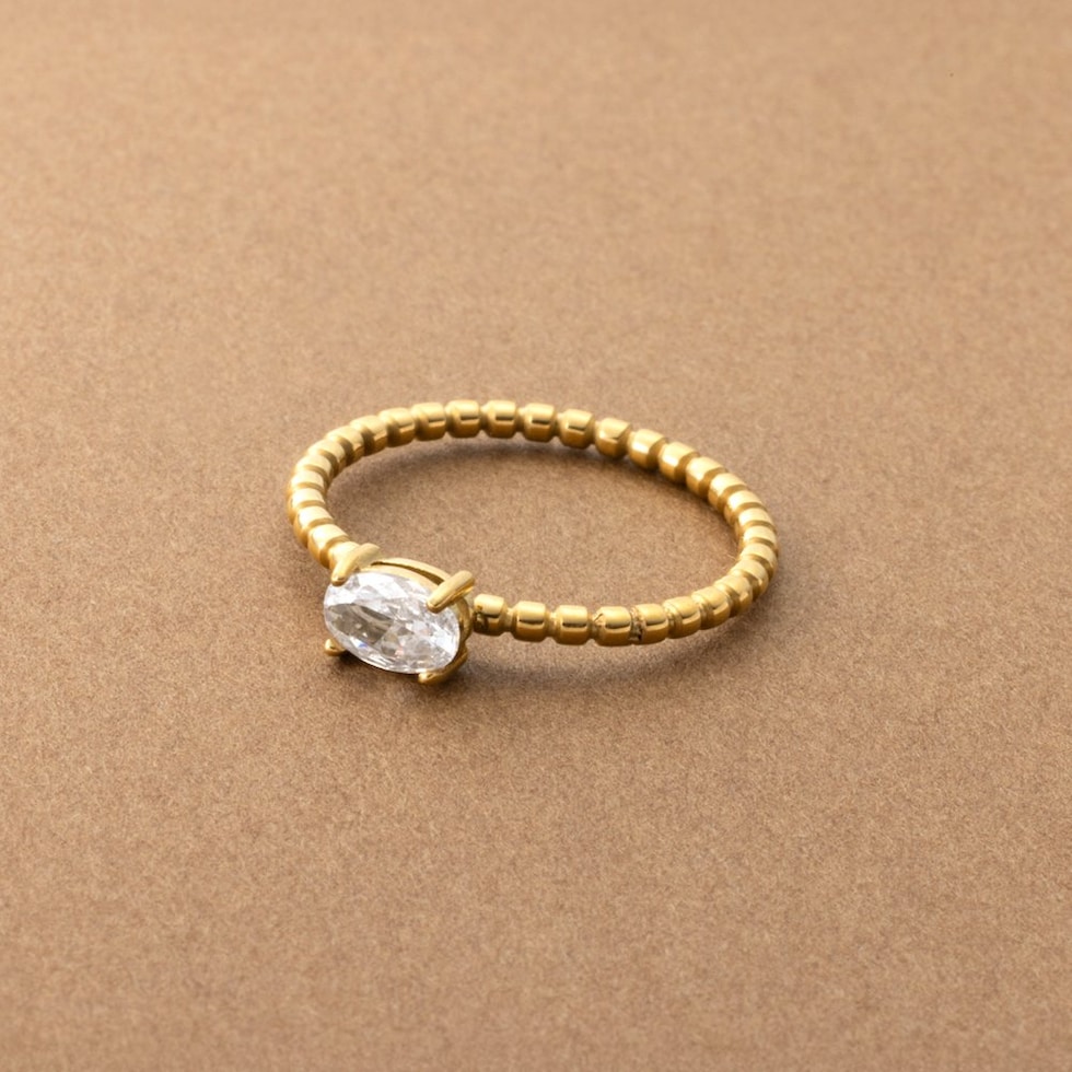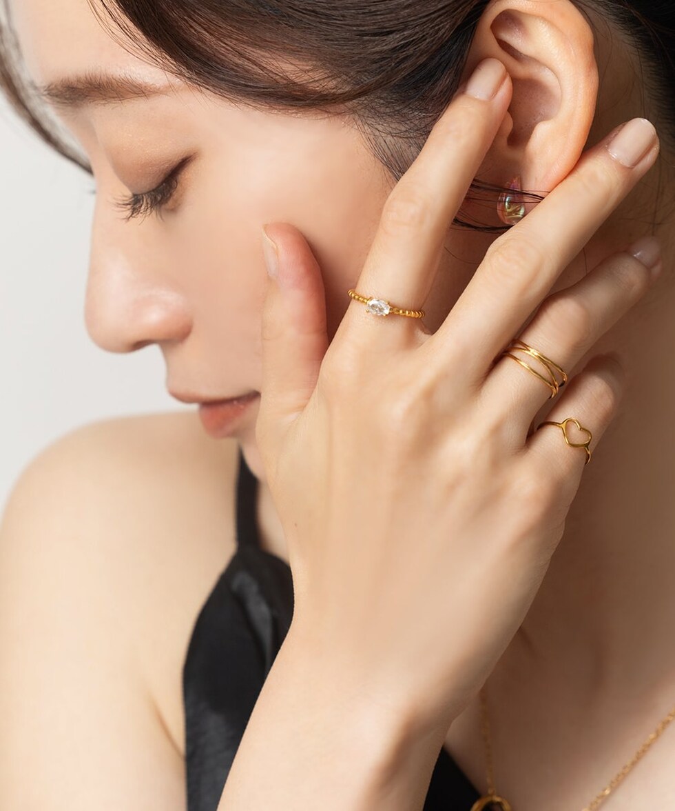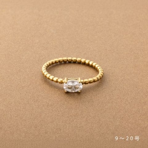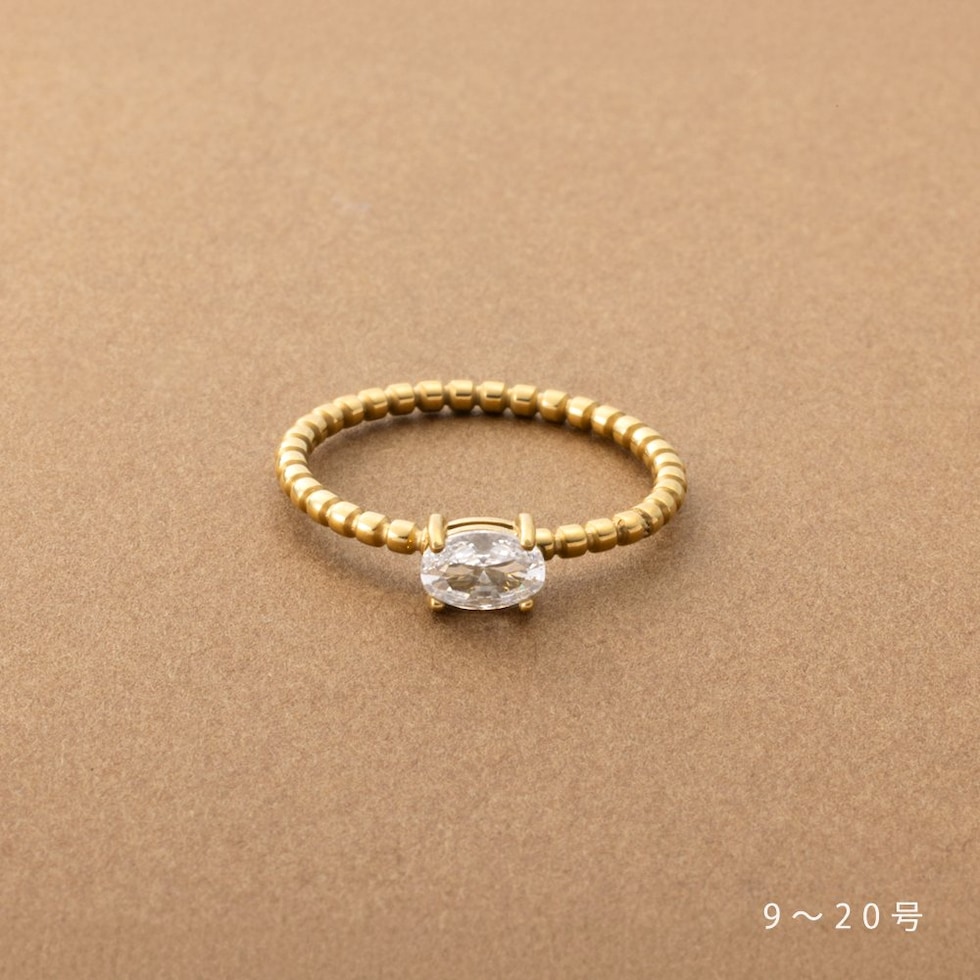 キラキラと煌くオーバル型のビジューを飾ったリング。ミル打ちアームで大人っぽい指先に。他のリングとも合わせやすく、手元コーデのアクセントアイテムにぴったりなデザインです。錆びにくく傷に強いステンレス製だからデイリーに活躍間違いナシ。
