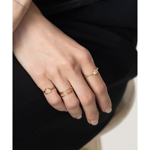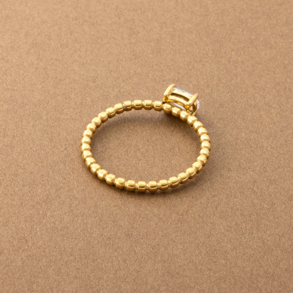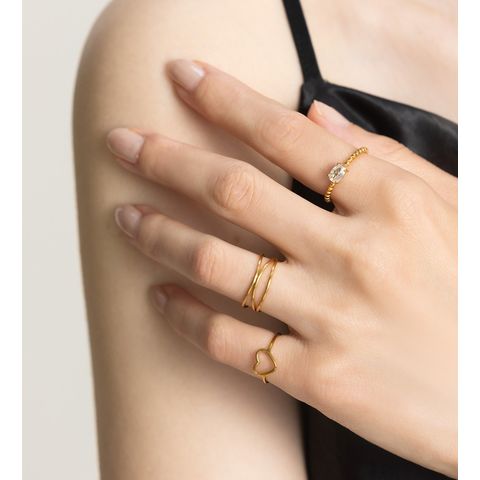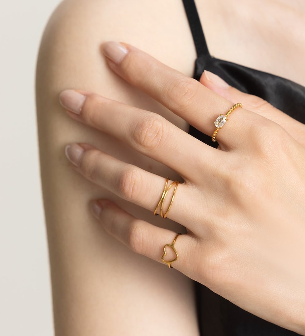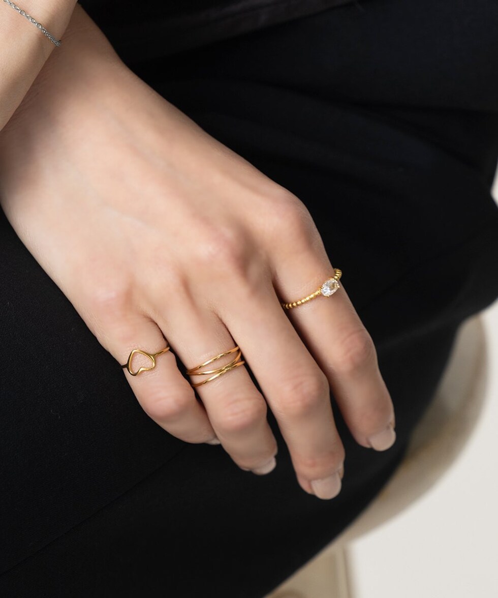 キラキラと煌くオーバル型のビジューを飾ったリング。ミル打ちアームで大人っぽい指先に。他のリングとも合わせやすく、手元コーデのアクセントアイテムにぴったりなデザインです。錆びにくく傷に強いステンレス製だからデイリーに活躍間違いナシ。