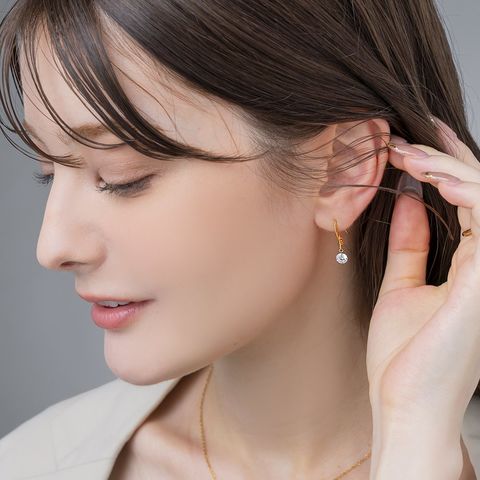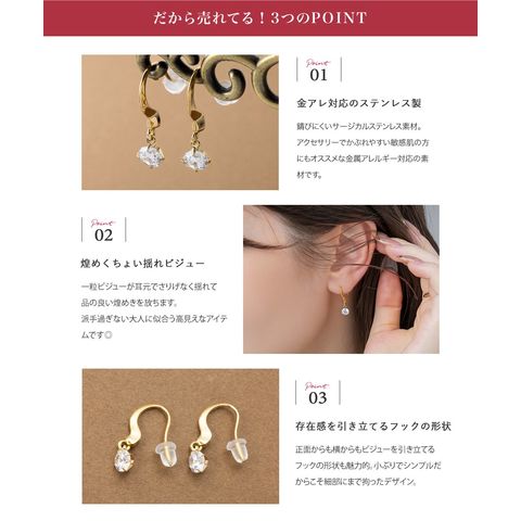 正面からも横からもビジューを引き立てるフックの形状も魅力的。小ぶりでシンプルだからこそ細部にまで拘ったデザイン。