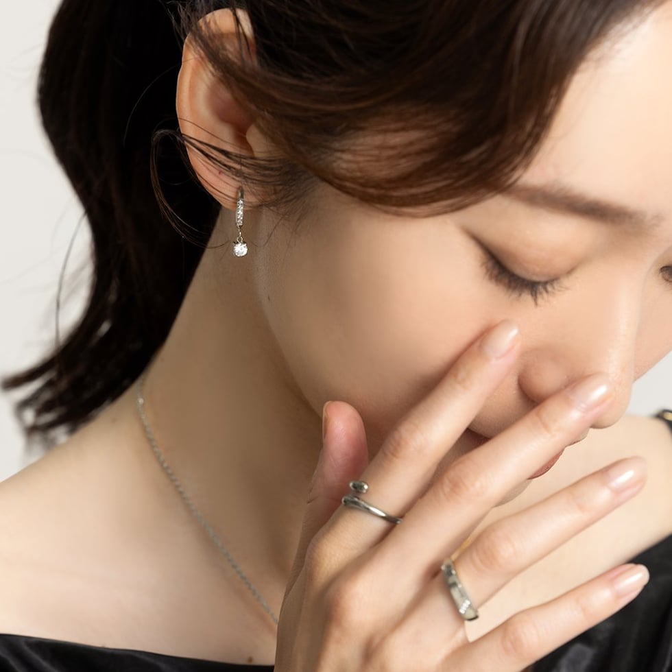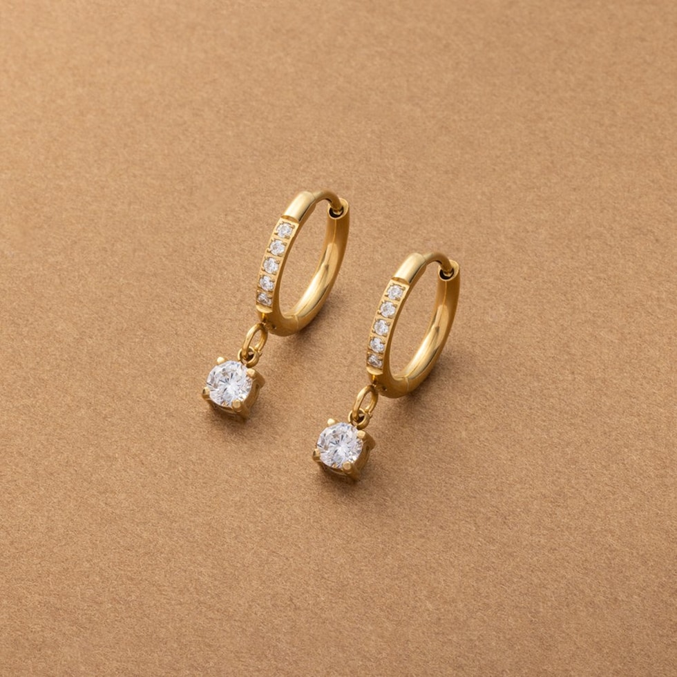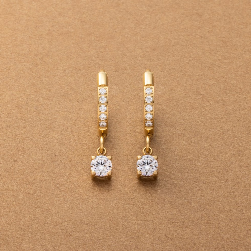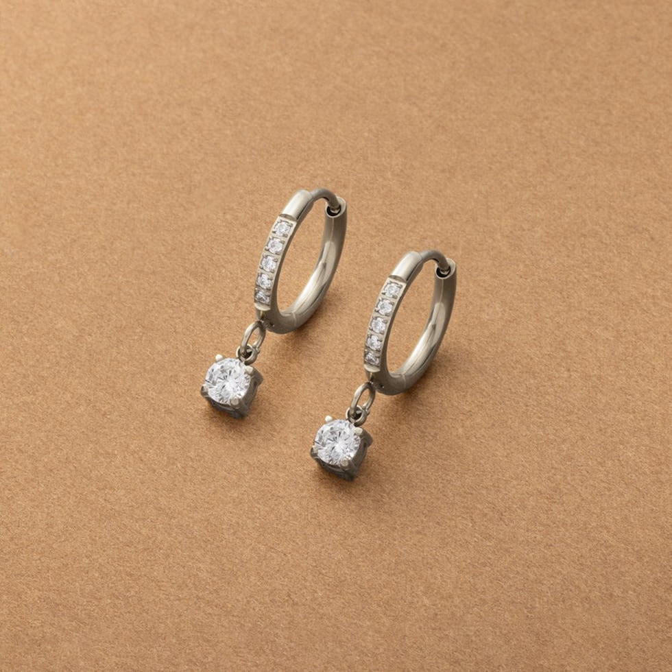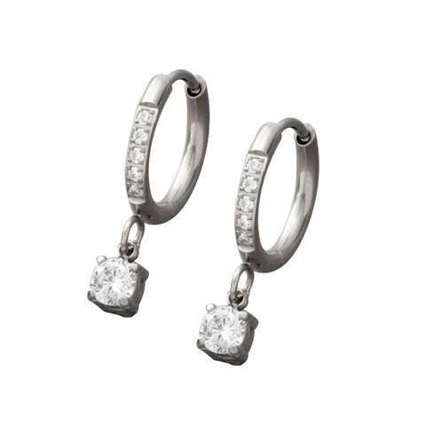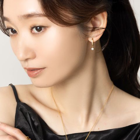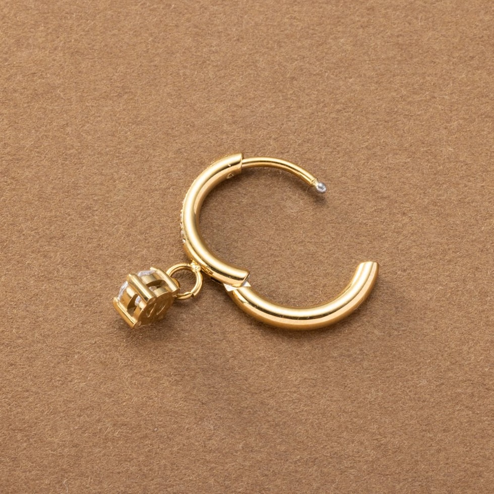 ビジューラインと一粒ビジューが煌めくフープピアス。派手過ぎず流行に左右されないデザインで長くご愛用頂けるひと品。長時間の着用にもオススメなステンレス製でギフトにもピッタリなアイテムです。