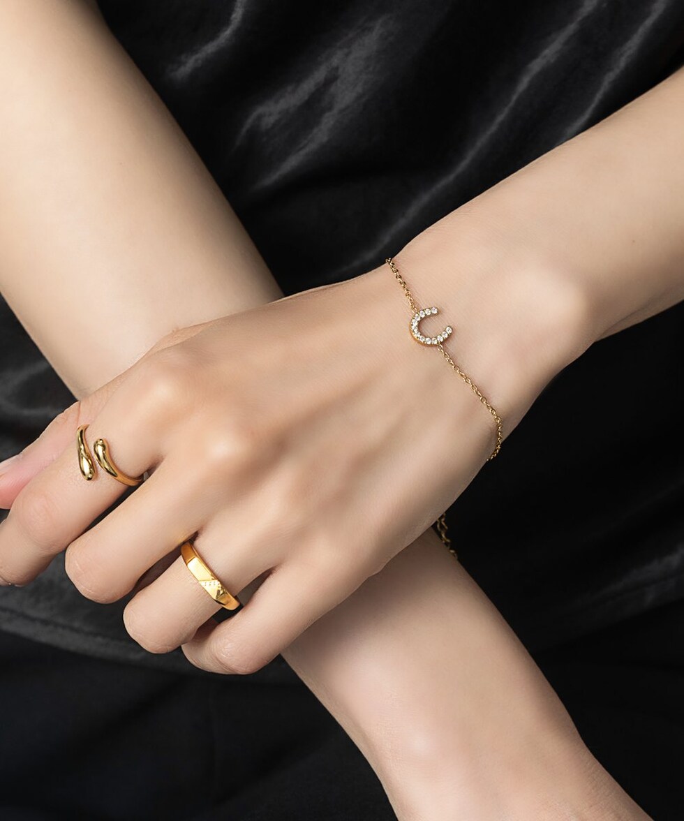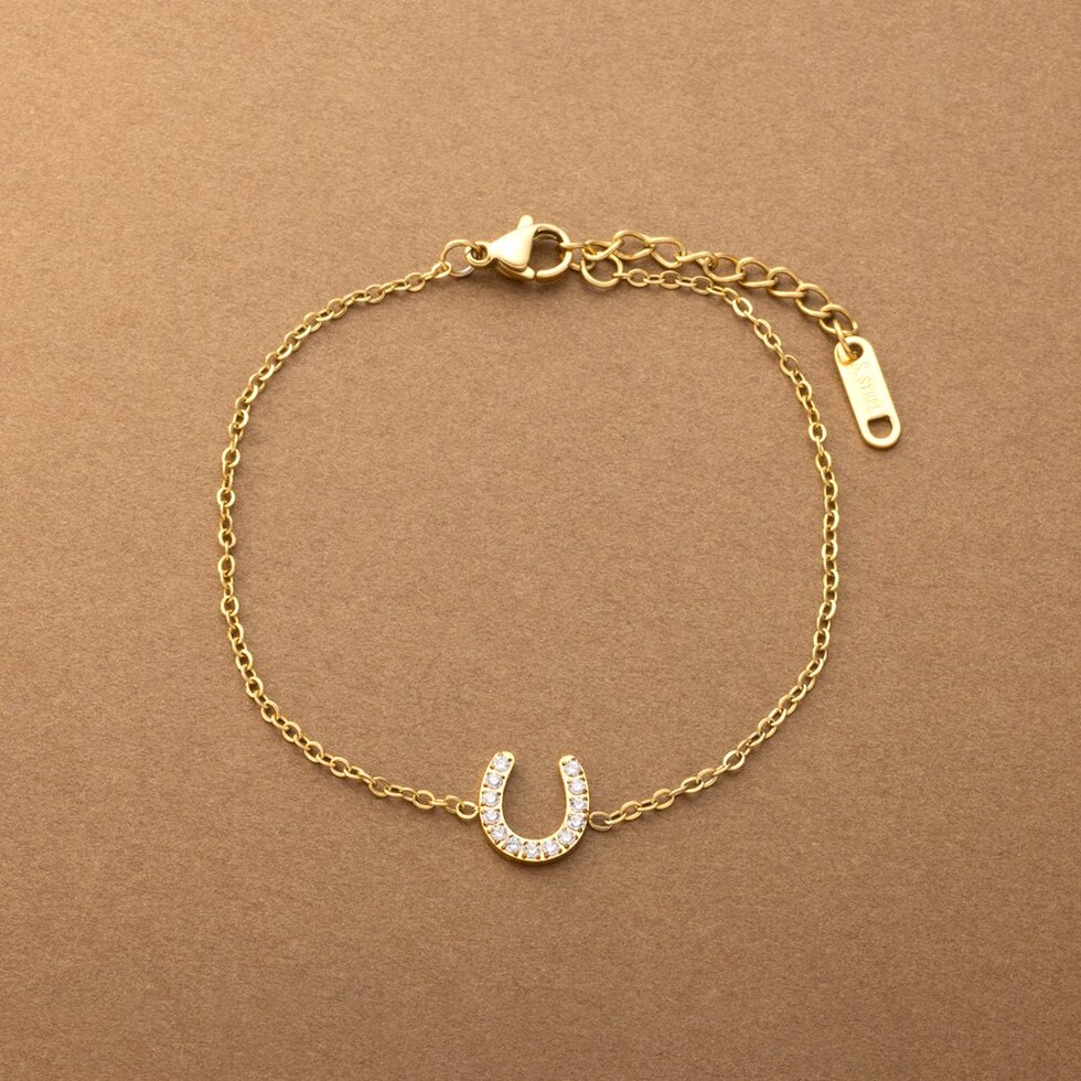 品よく煌めくホースシューのブレスレット。ビジューをあしらった馬蹄型モチーフと華奢なチェーンが、手元に上品な輝きを添えてくれます。シンプルなデザインでどんな装いにもすっと馴染む。錆びにくいステンレス素材だからデイリーにもぴったりな一品です。