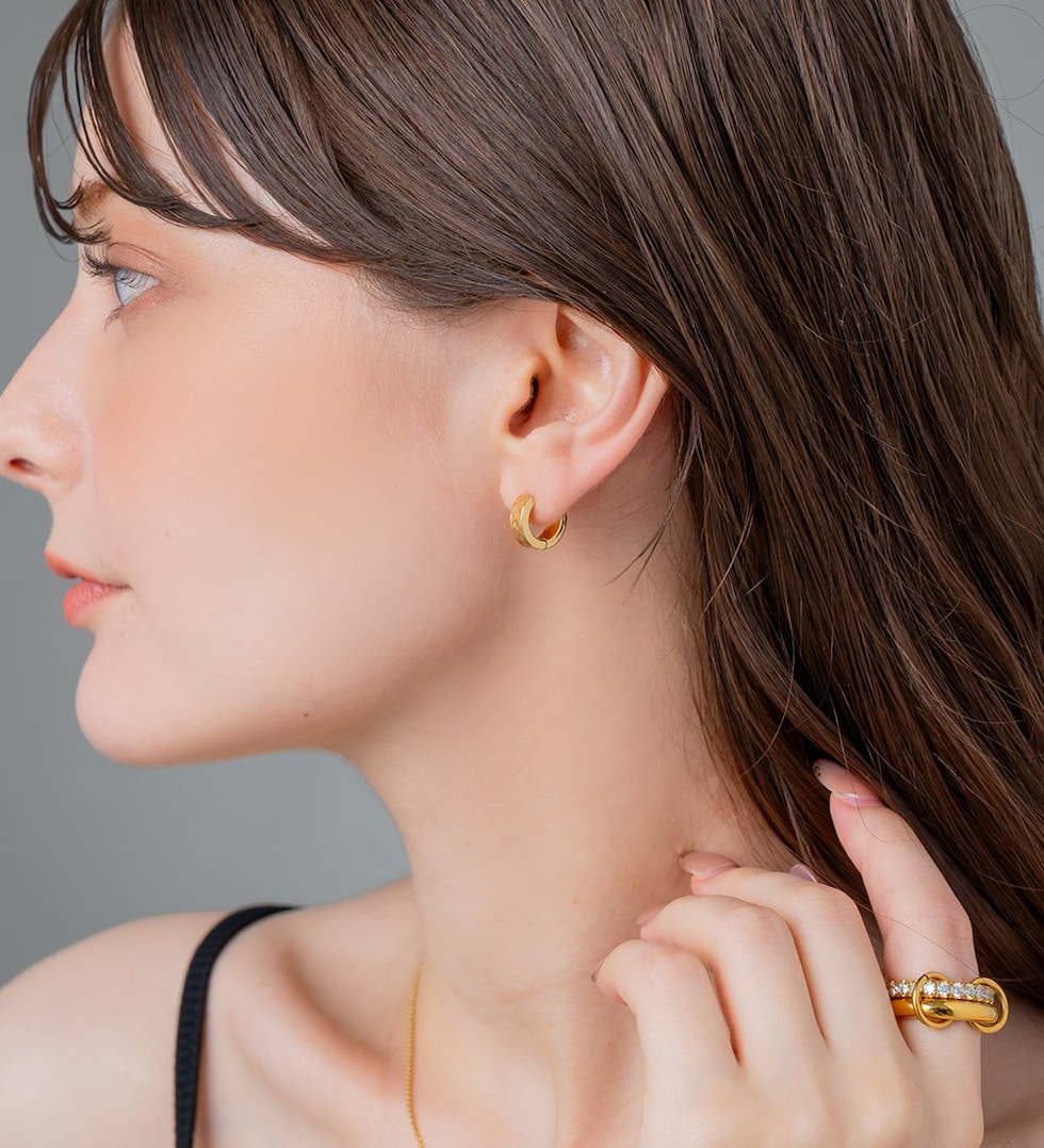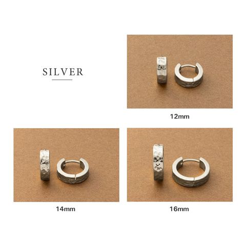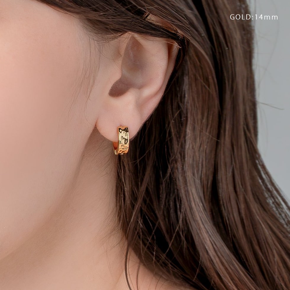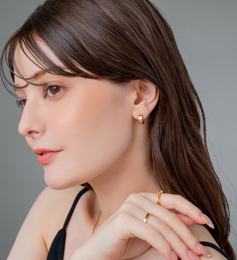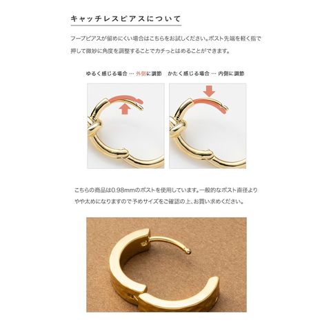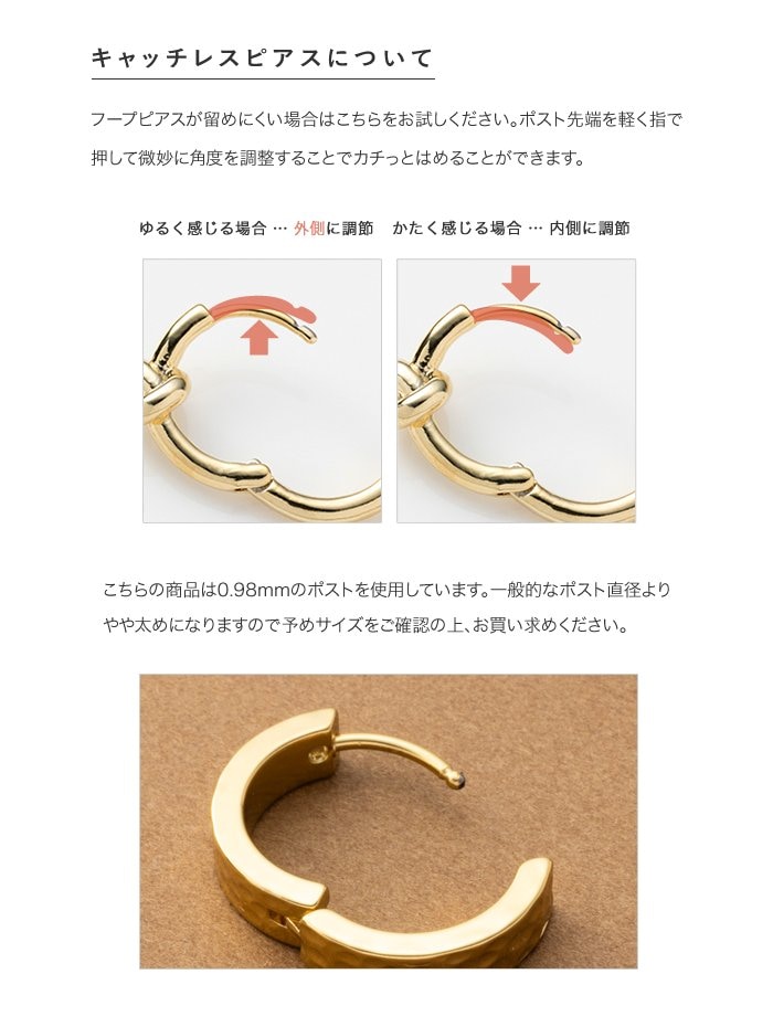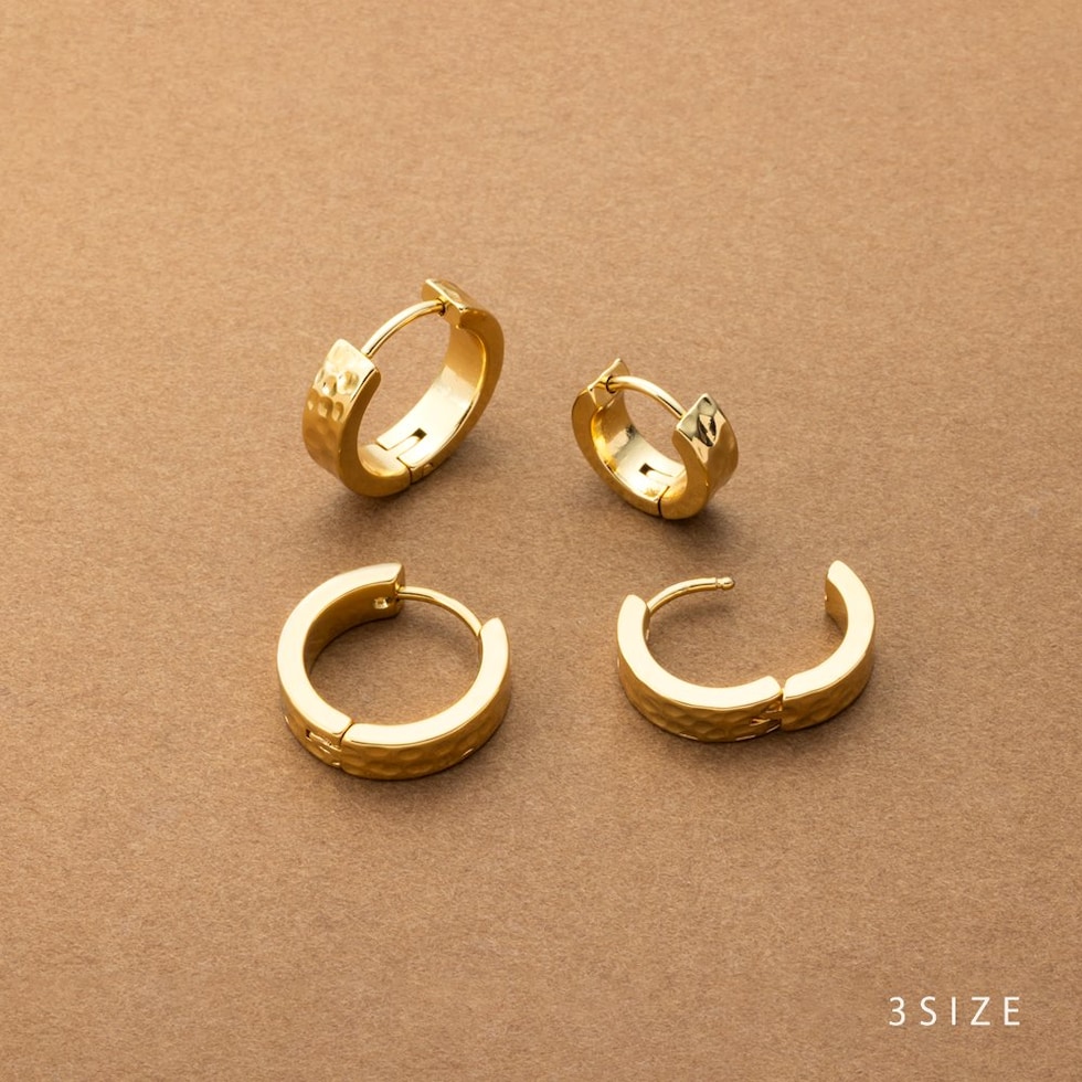 シンプルなフープにたたき加工を施したキャッチレスピアス。ほどよく個性を添えたデザインが、さりげなくも目を惹くひと品。錆びにくく傷に強いステンレス製で、デイリー使いにぴったりのアイテムです。