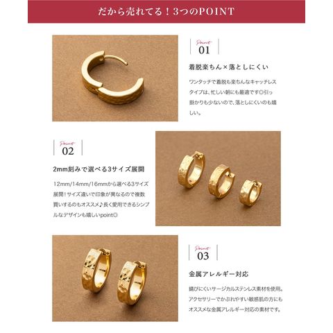 ピアス ステンレス 金属アレルギー サージカルステンレス レディース つけっぱなし キャッチレス 中折れ 開閉式 ワンタッチ たたき加工 フープ 3サイズ メタル cream dot ゆうパケット [ゴールド_16mm]