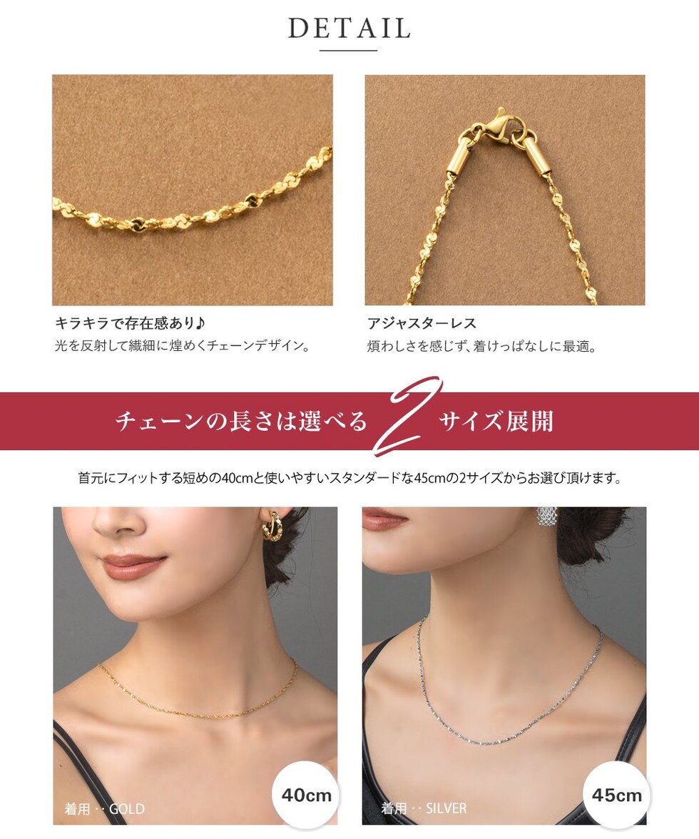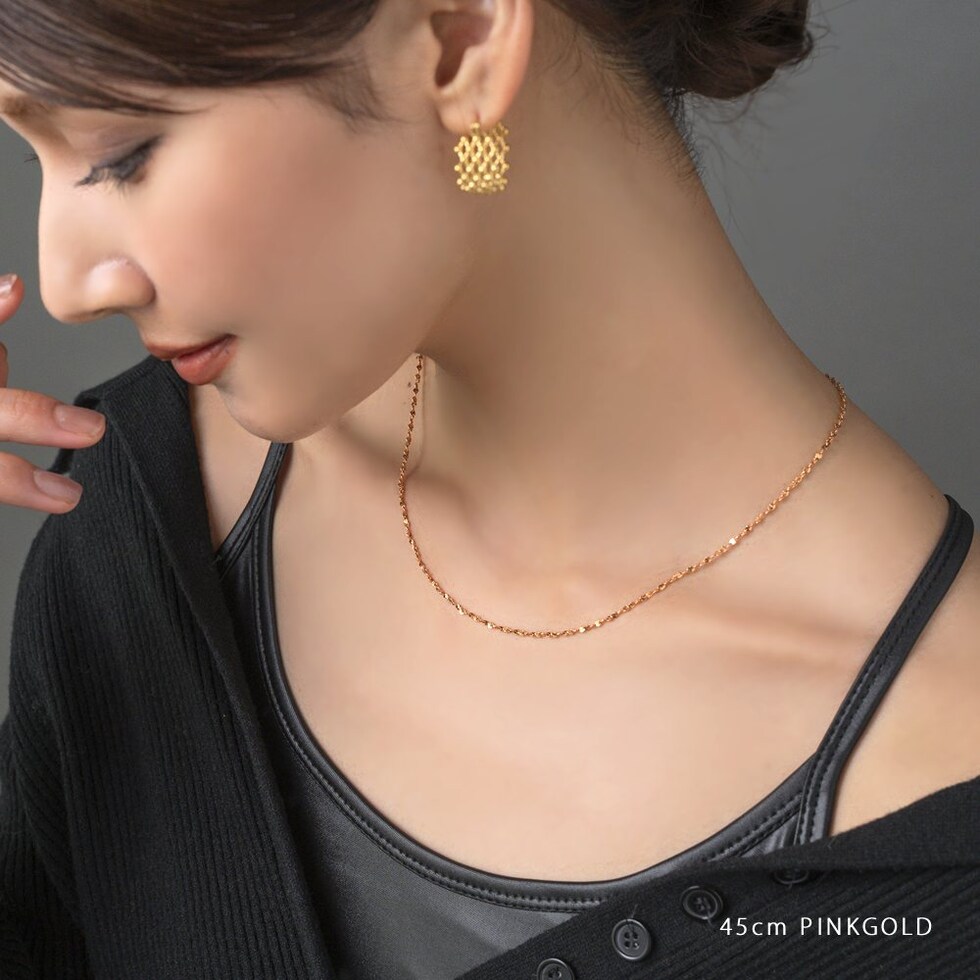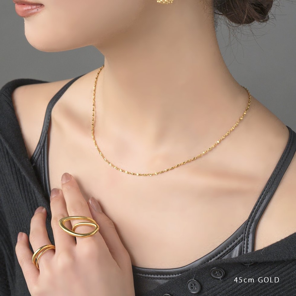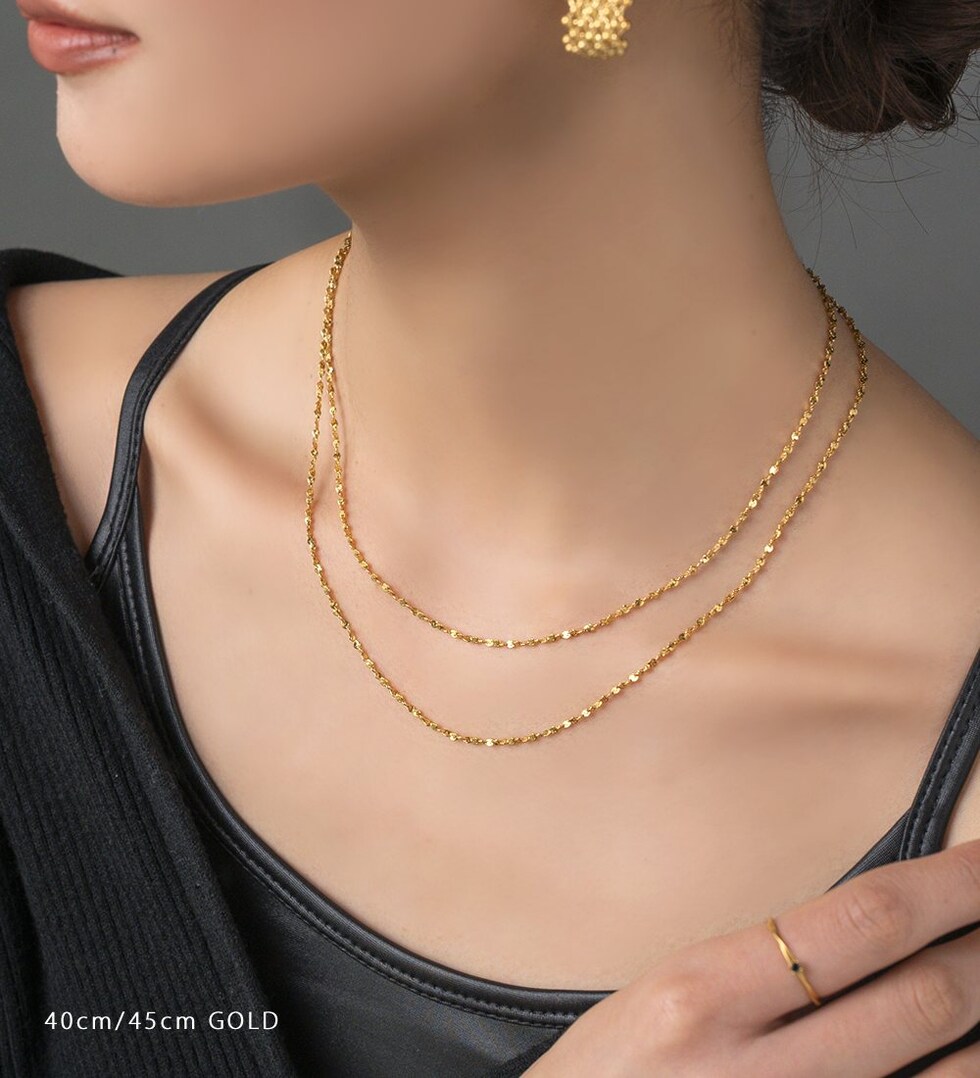角度が変わるたびにキラキラと繊細に煌くチェーンネックレス。コーデに合わせて使い回せる40cm/45cm展開です。一本でも存在感があり、重ねづけにも活躍しそう◎