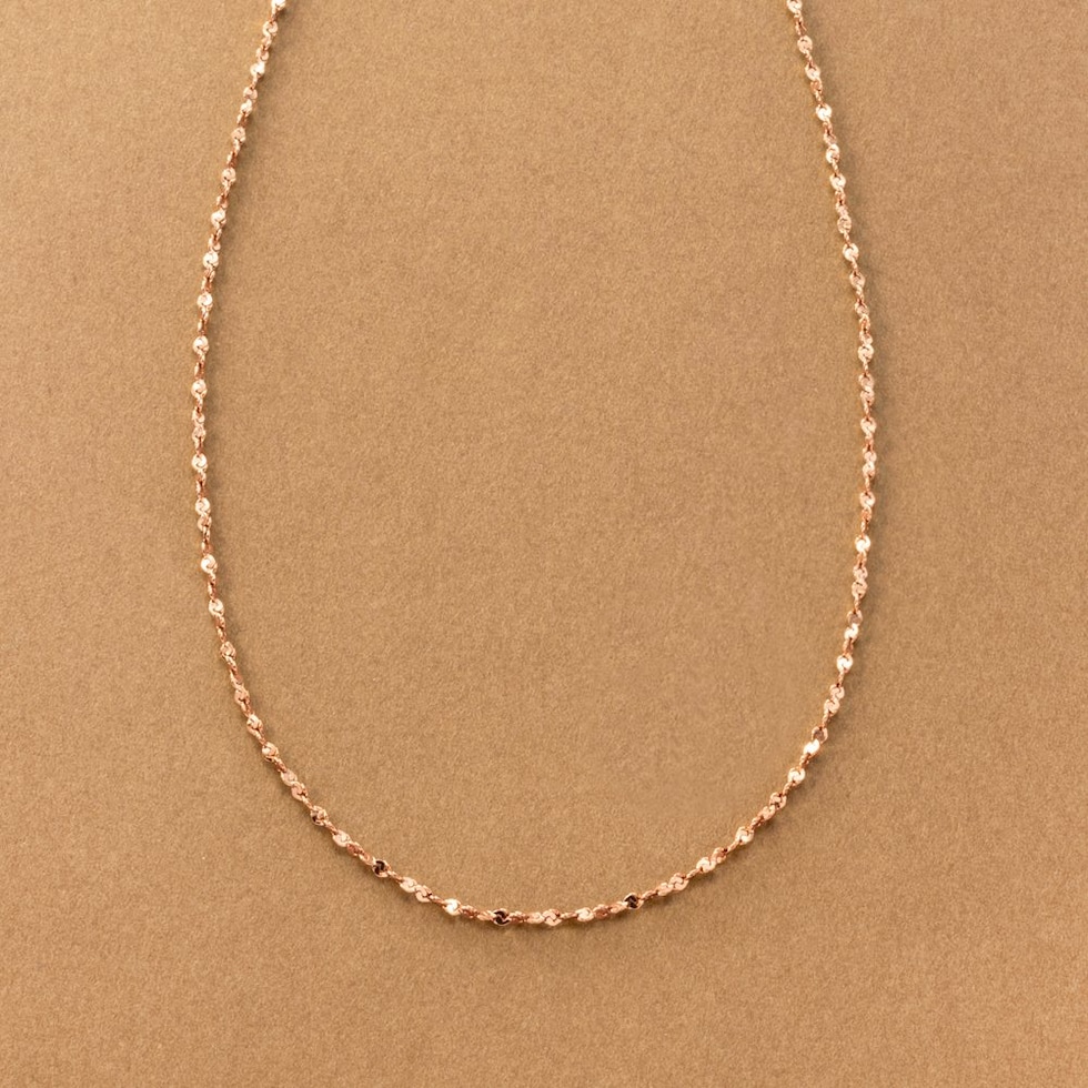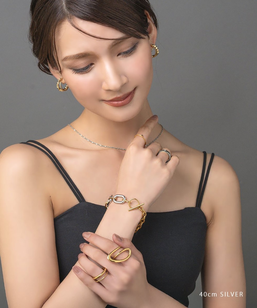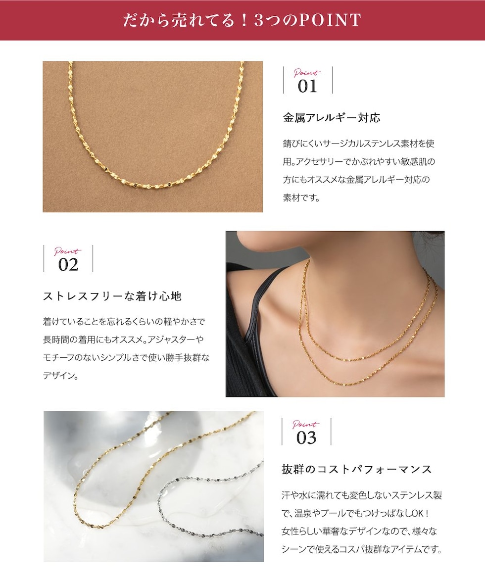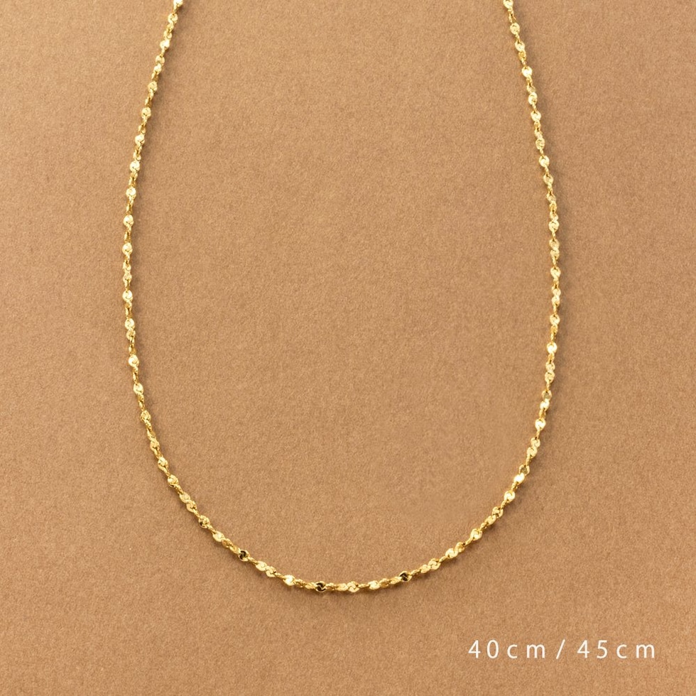 角度が変わるたびにキラキラと繊細に煌くチェーンネックレス。コーデに合わせて使い回せる40cm/45cm展開です。一本でも存在感があり、重ねづけにも活躍しそう◎