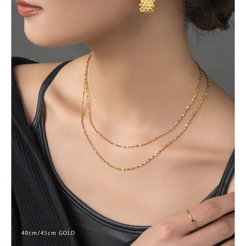 角度が変わるたびにキラキラと繊細に煌くチェーンネックレス。コーデに合わせて使い回せる40cm/45cm展開です。一本でも存在感があり、重ねづけにも活躍しそう◎