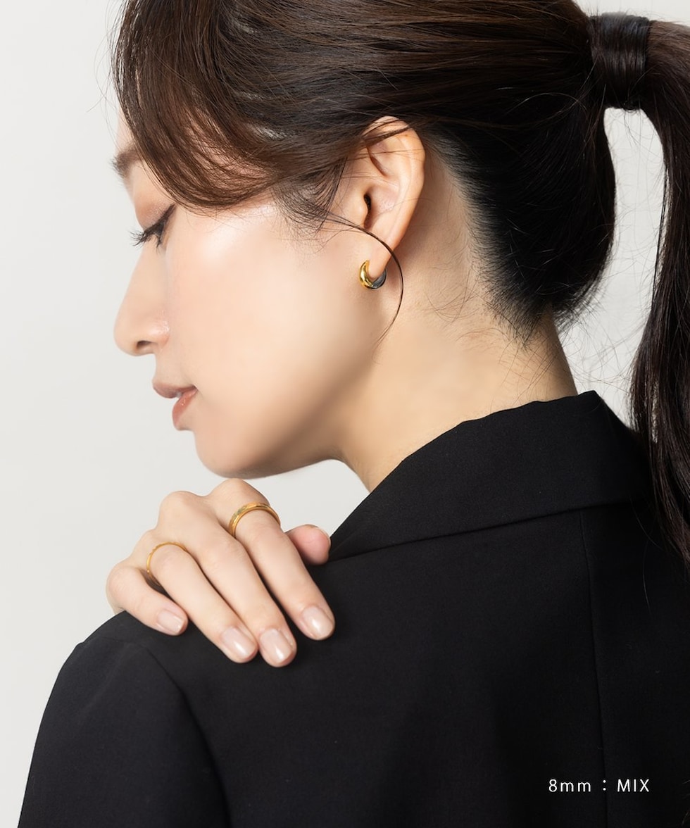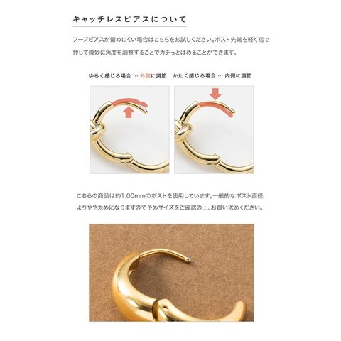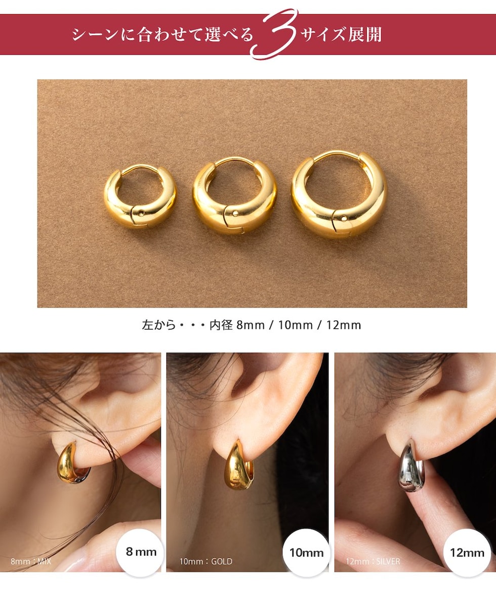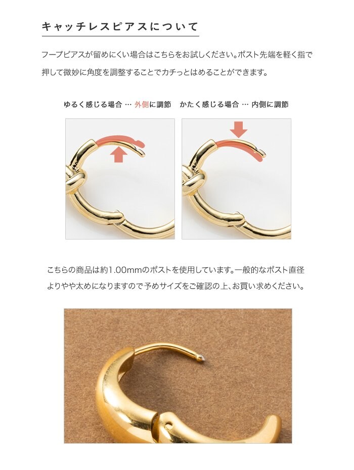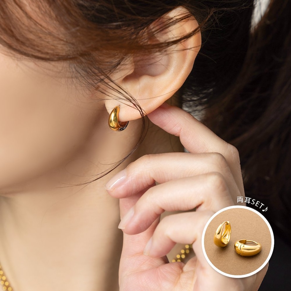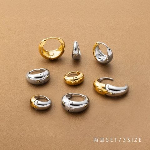 丸みのあるぷっくりシルエットで使い勝手の抜群なフープピアス。シンプルで使い勝手の良いデザインはどの角度から見てもスッキリとキレイ見えするデザインです。