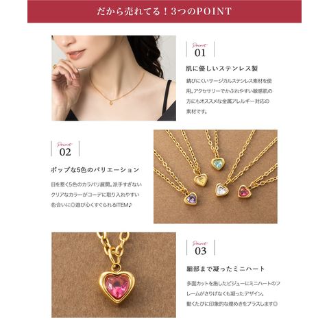 小ぶりなサイズ感が大人可愛いミニハートネックレス。一粒ビジューをハート型のフレームで飾った遊び心あるひと品。重ね付けにもオススメなさりげなさが普段使いにもオススメなアイテムです。