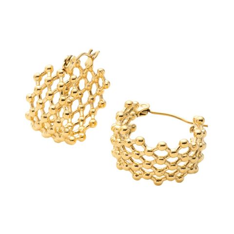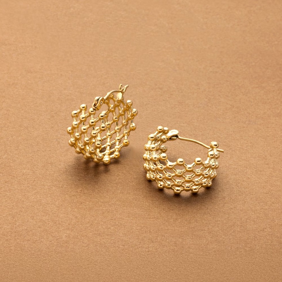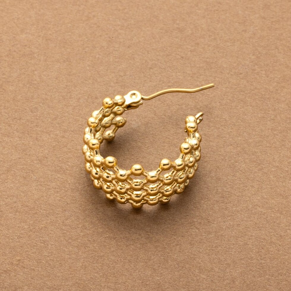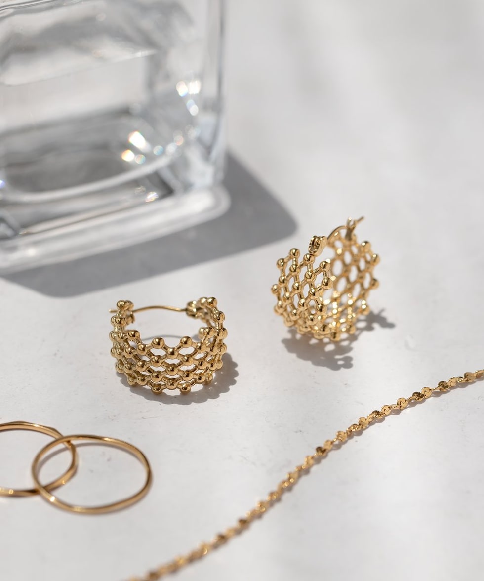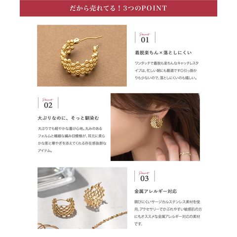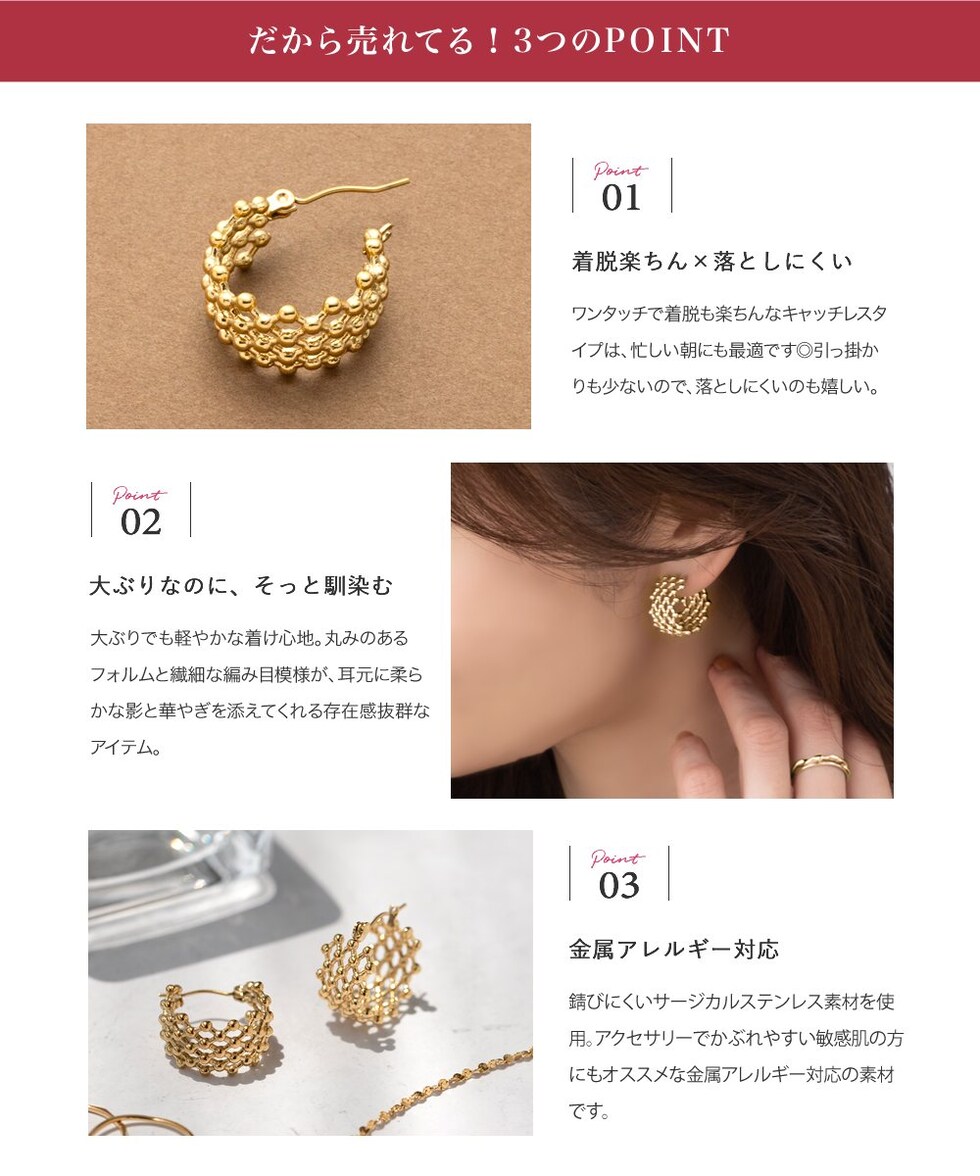 立体感のあるドット模様が華やかな印象のキャッチレスフープピアス。透け感あるデザインがお顔周りに抜け感を演出してくれます。錆びにくく傷に強いステンレス製で、長時間の着用も安心の低アレルギー素材です。