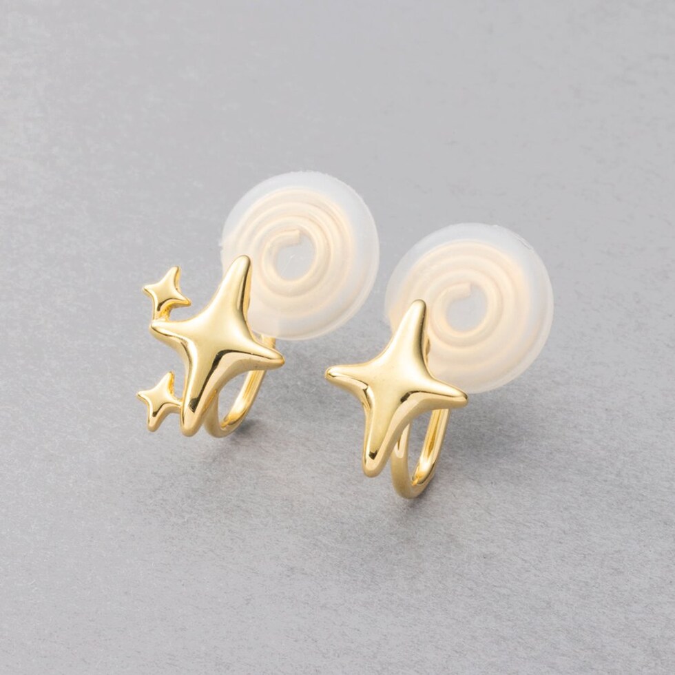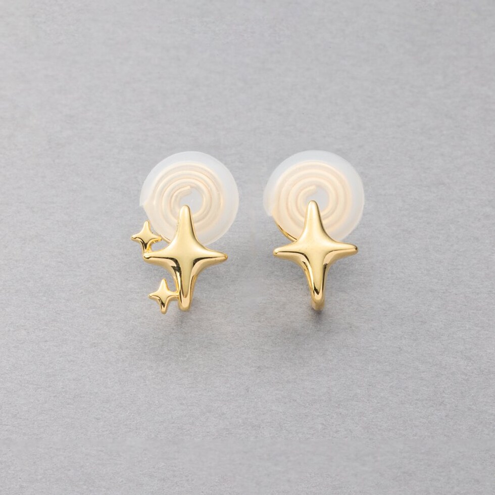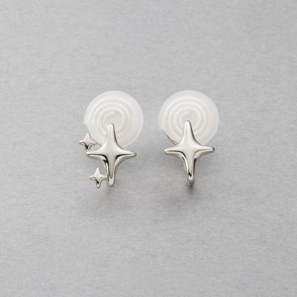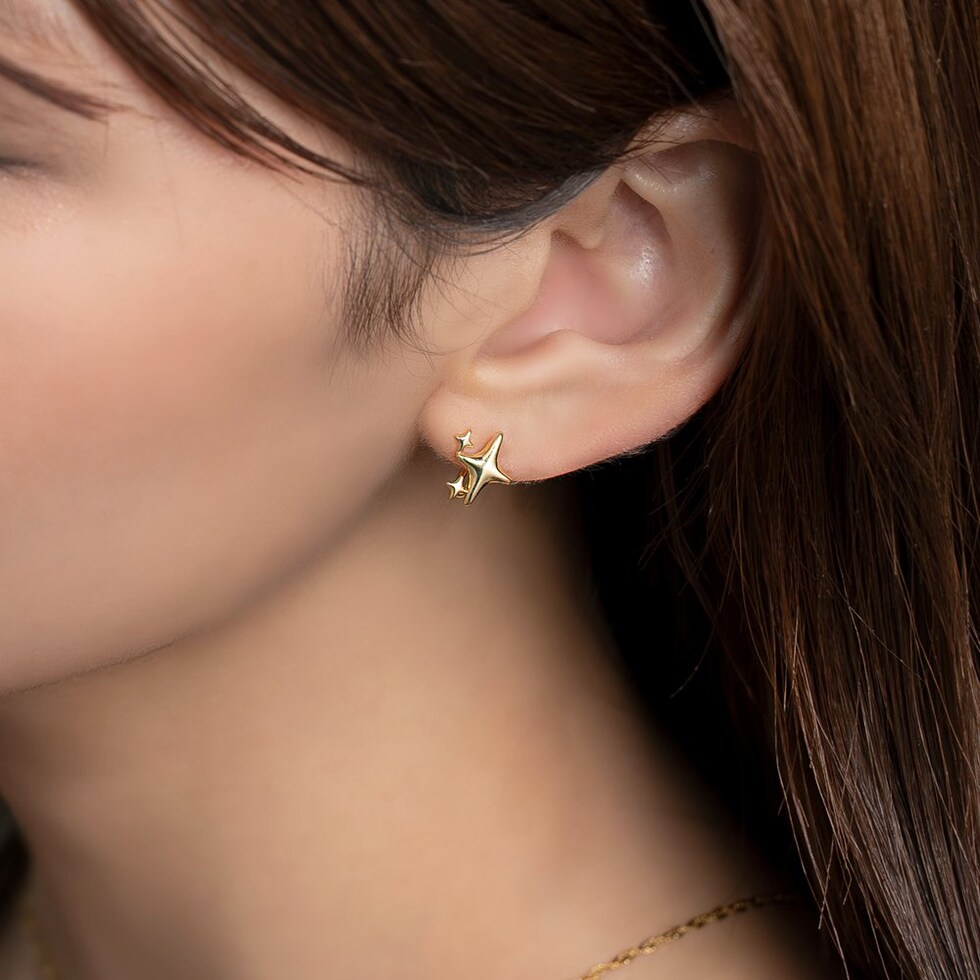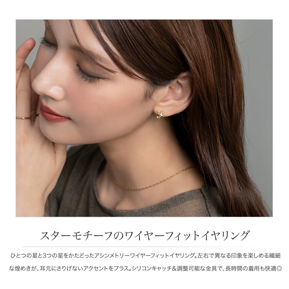 ひとつの星と3つの星をかたどったアシンメトリーワイヤーフィットイヤリング。左右で異なる印象を楽しめる繊細な煌めきが、耳元にさりげないアクセントを添えてくれる。シリコンキャッチ&調整可能な金具で、長時間の着用も快適◎