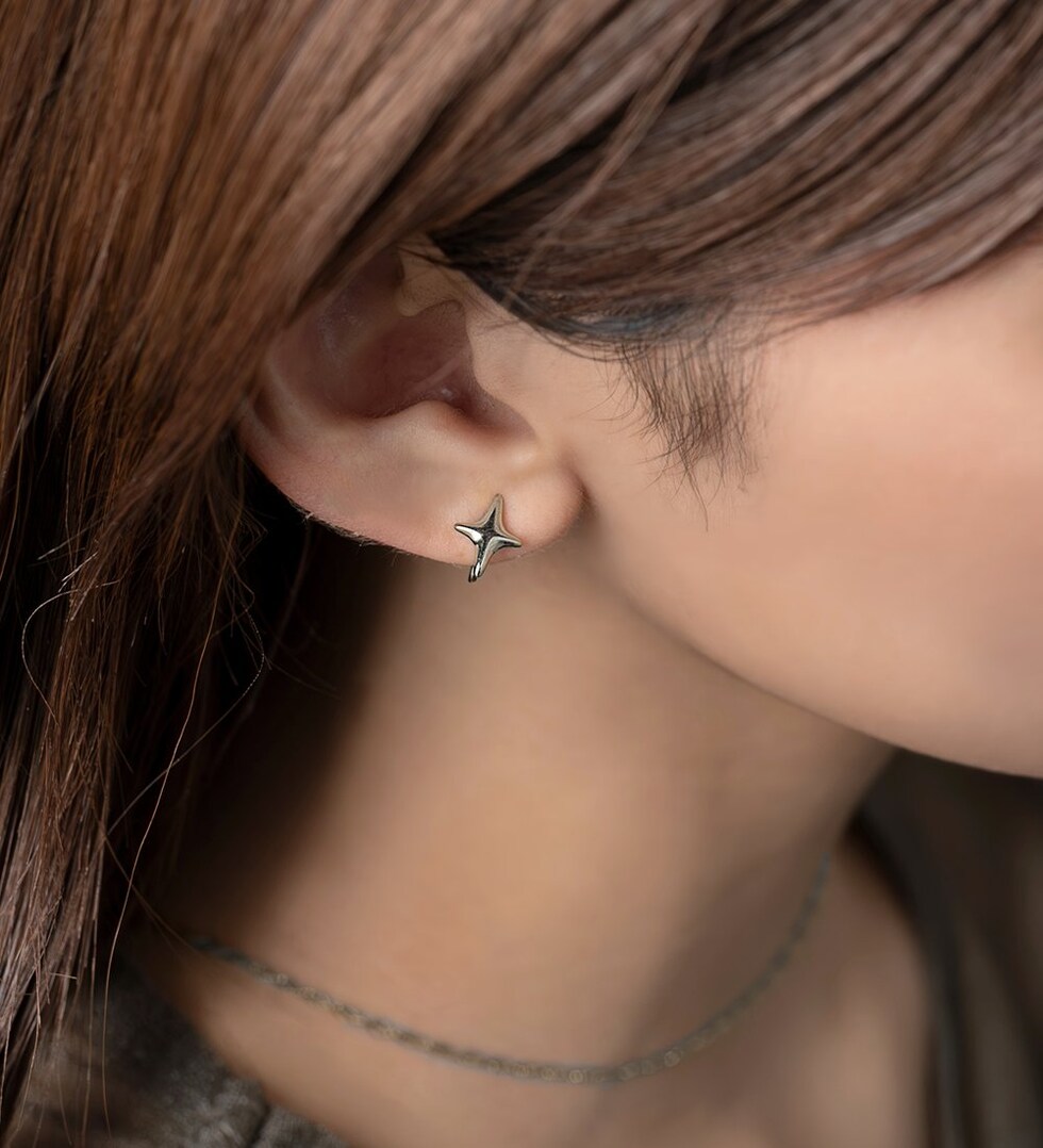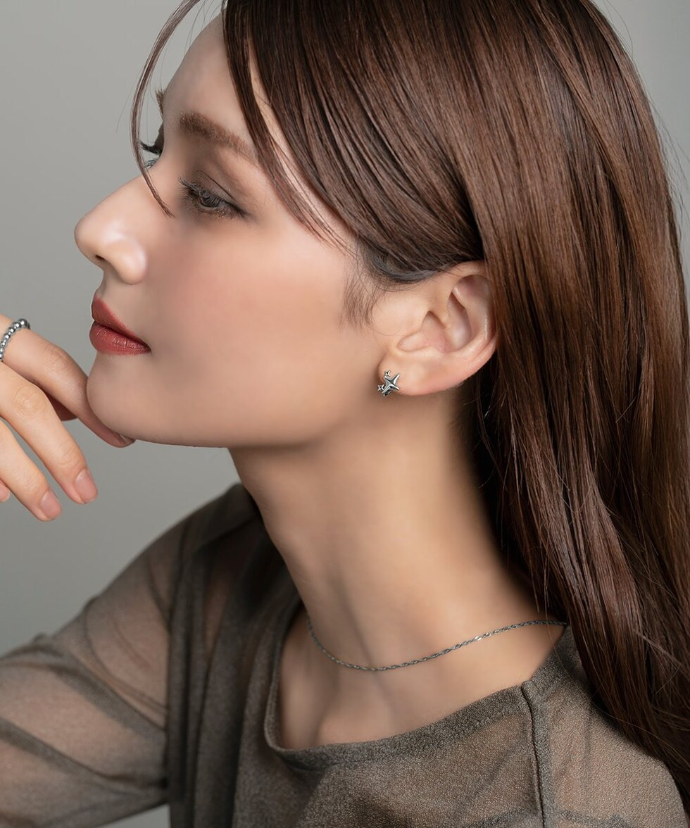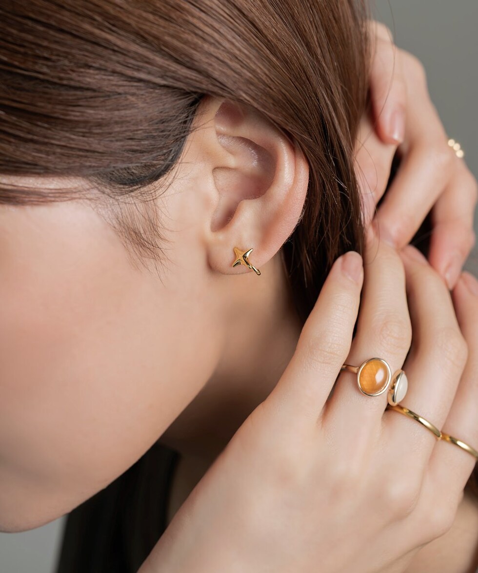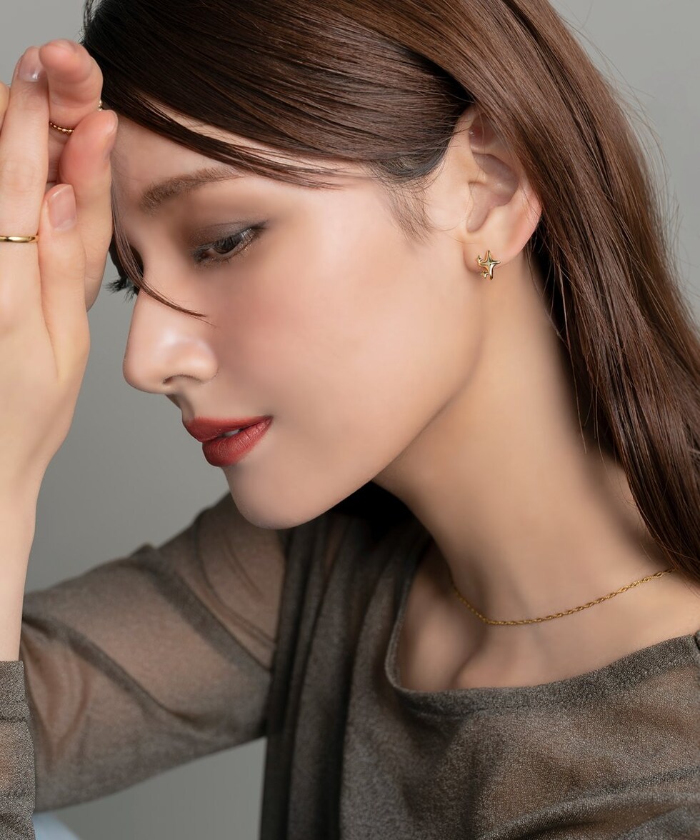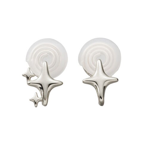ひとつの星と3つの星をかたどったアシンメトリーワイヤーフィットイヤリング。左右で異なる印象を楽しめる繊細な煌めきが、耳元にさりげないアクセントを添えてくれる。シリコンキャッチ&調整可能な金具で、長時間の着用も快適◎