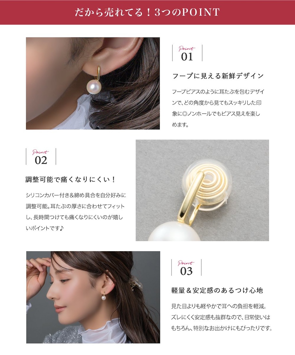 フープピアスのように耳たぶを包むデザインで、どの角度から見てもスッキリした印象に◎ノンホールでもピアス見えを楽しめます。
