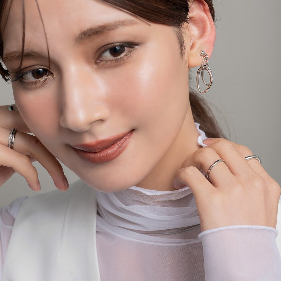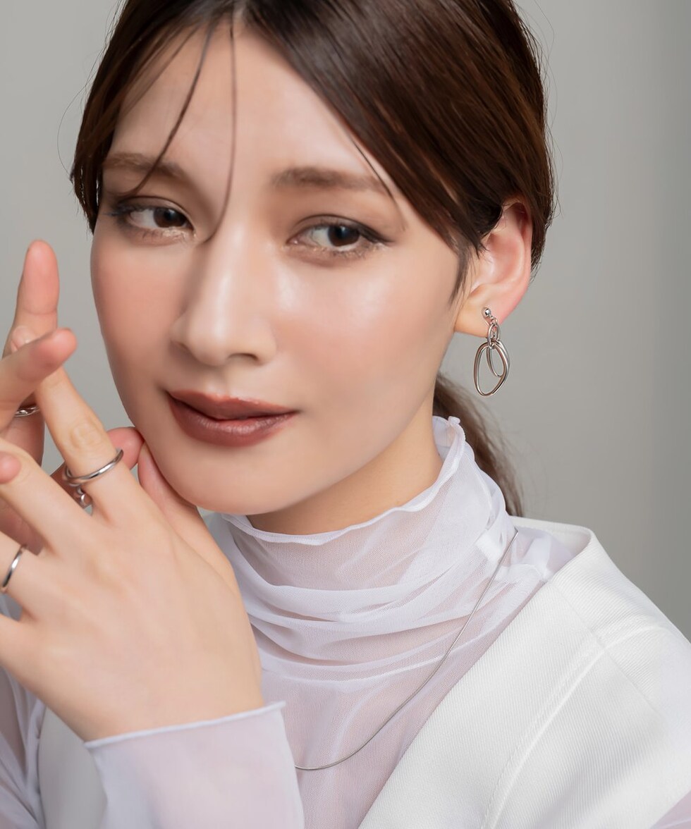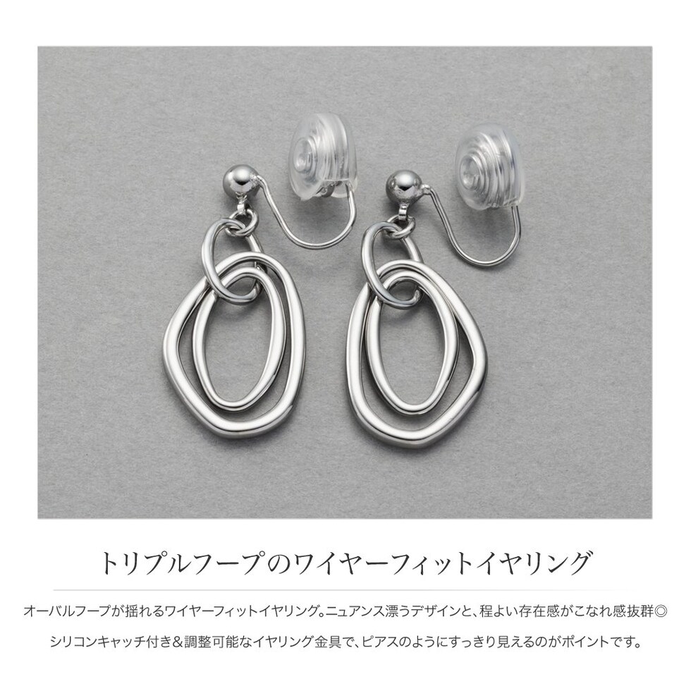 オーバルフープが揺れるワイヤーフィットのイヤリング。ニュアンス漂うデザインと、程よい存在感がこなれ感抜群◎シリコンキャッチ付き&調整可能なイヤリング金具で、ピアスのようにすっきり見えるのがポイント。長時間の着用も痛くなりにくく快適です。