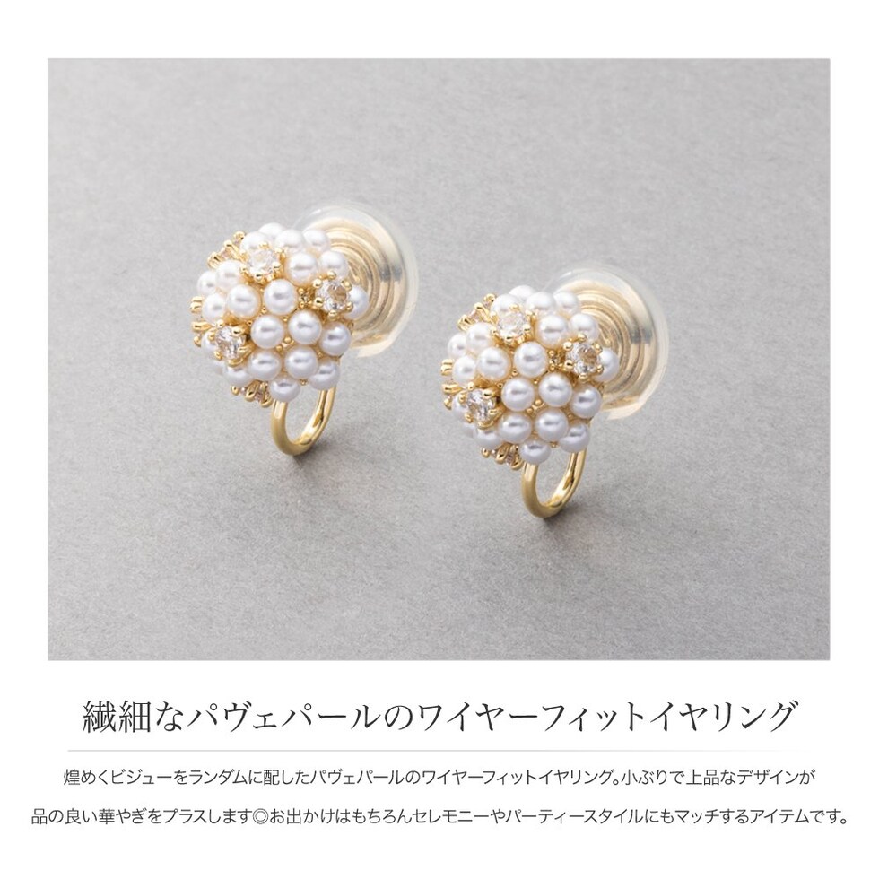 煌めくビジューをランダムに配したパヴェパールのワイヤーフィットイヤリング。小ぶりで上品なデザインが品の良い華やぎをプラスします◎お出かけはもちろんセレモニーやパーティースタイルにもマッチするアイテムです。