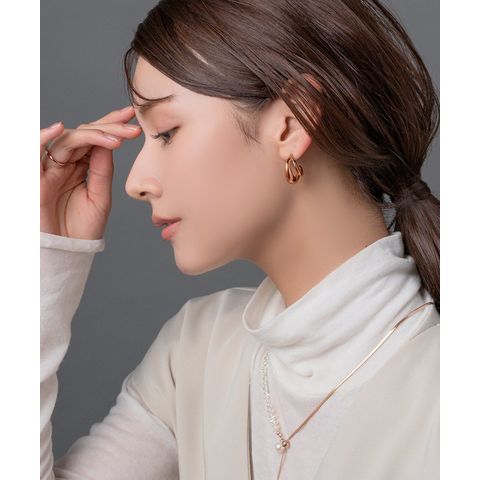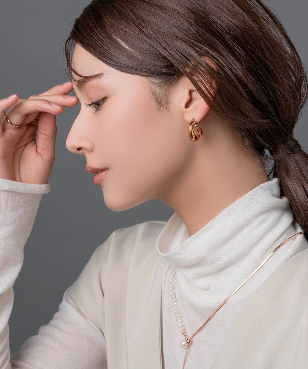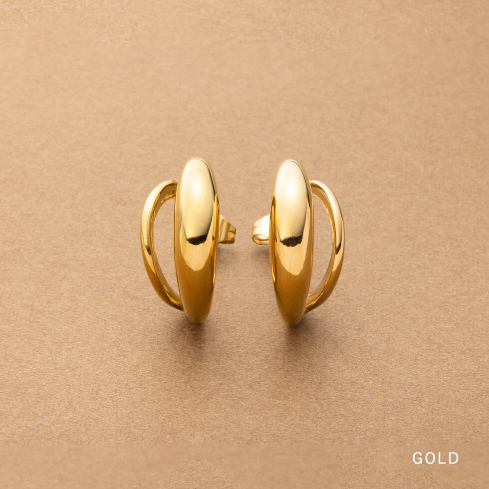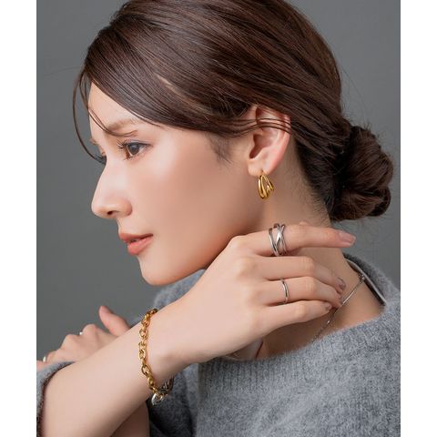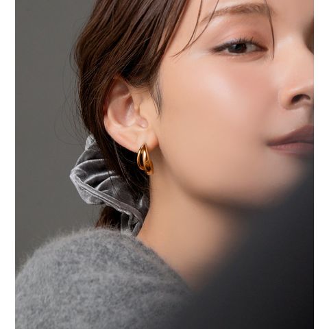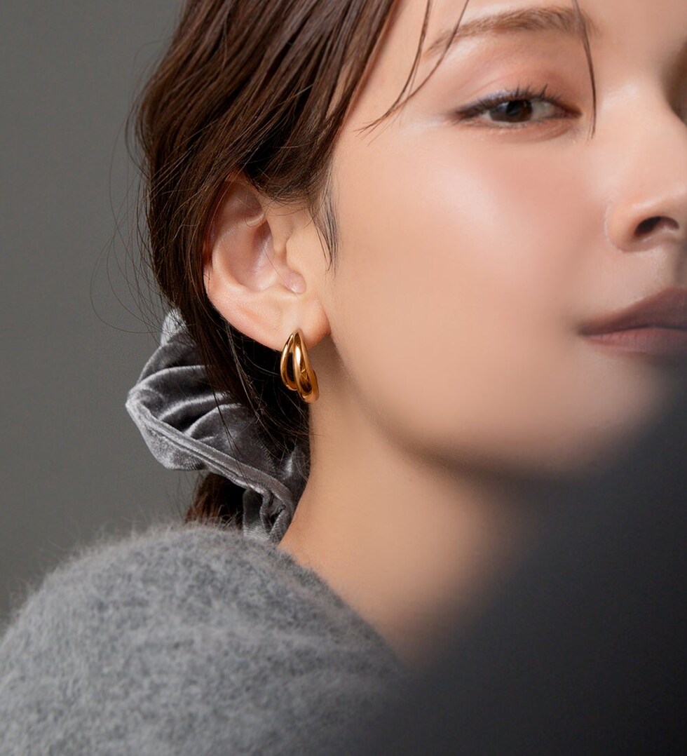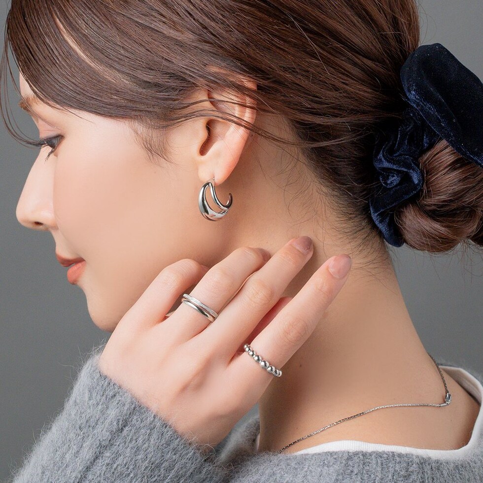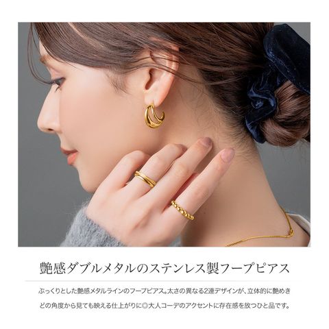 ぷっくりとした艶感メタルラインのフープピアス。太さの異なる2連デザインが、立体的に艶めきどの角度から見ても映える仕上がりに◎大人コーデのアクセントに存在感を放つひと品です。
