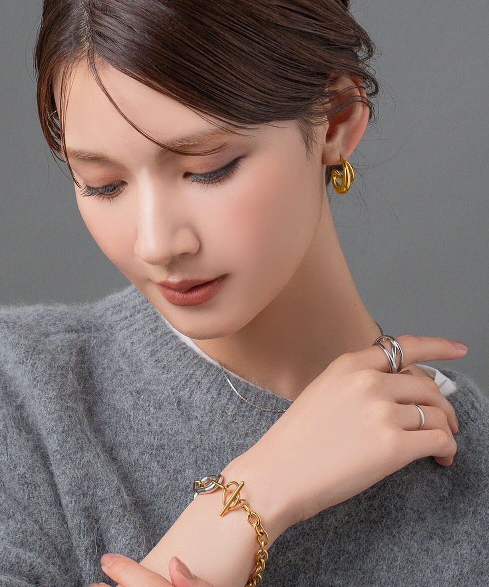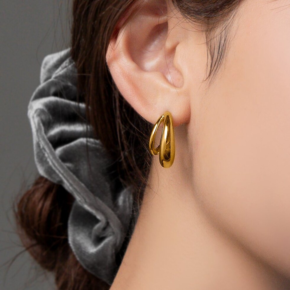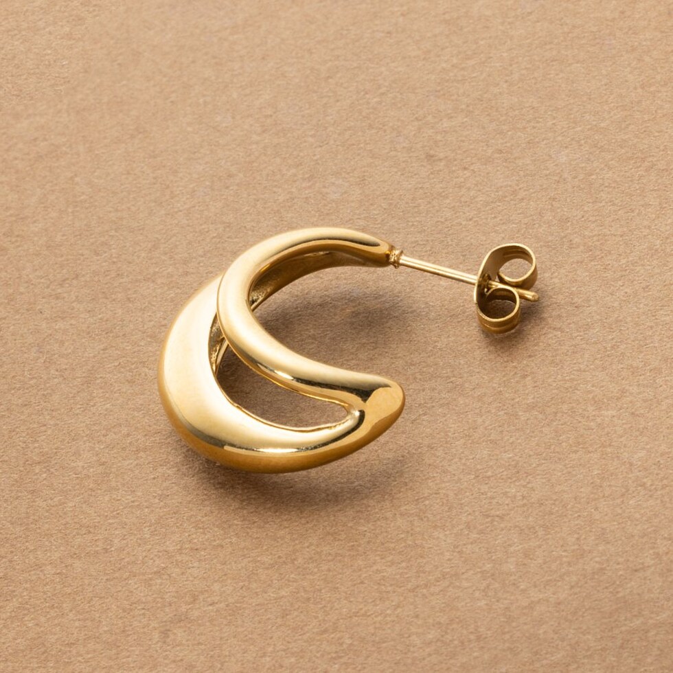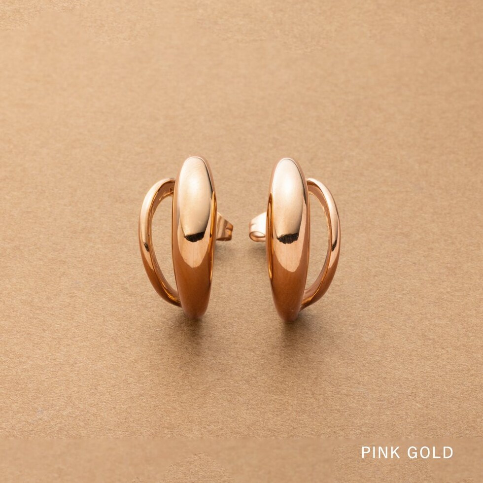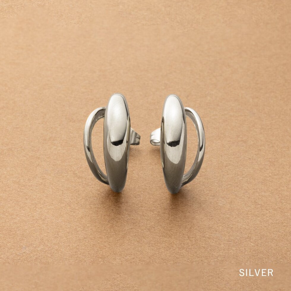 ぷっくりとした艶感メタルラインのフープピアス。太さの異なる2連デザインが、立体的に艶めきどの角度から見ても映える仕上がりに◎大人コーデのアクセントに存在感を放つひと品です。