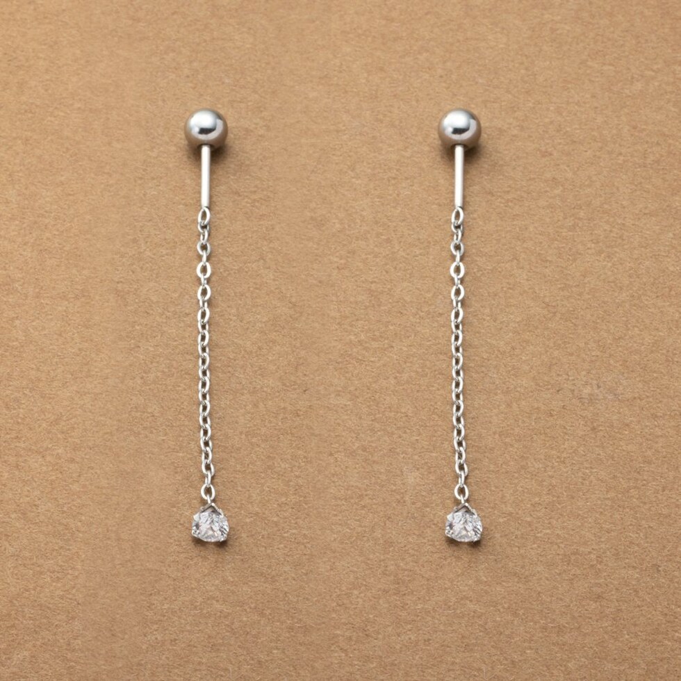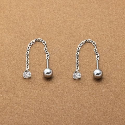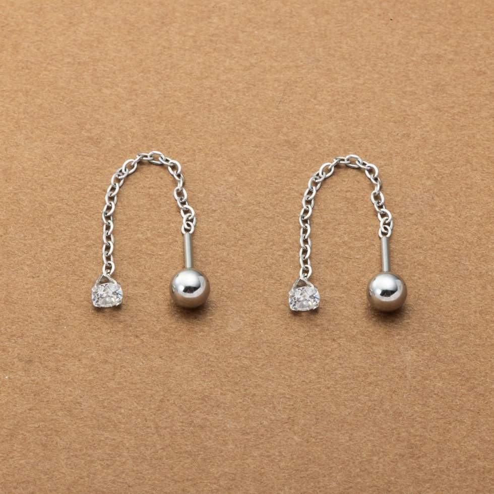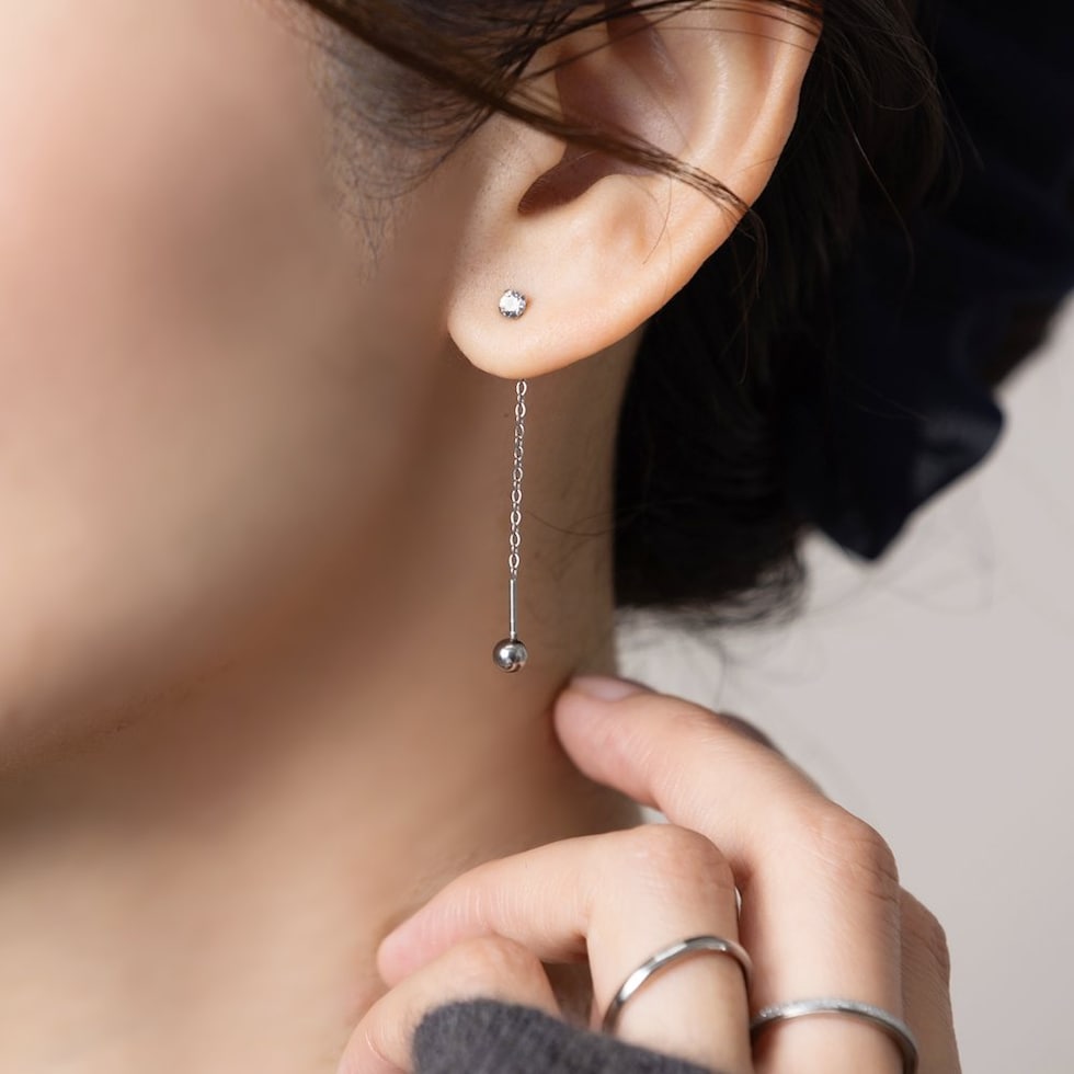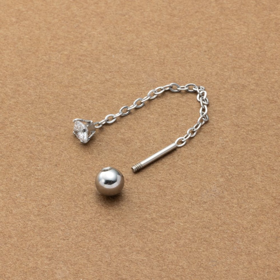 ネジロック式のステンレス製アメリカンピアス。ダイヤモンドカットを施したつめ付きのビジューがラグジュアリーに煌めく上品な逸品。チェーンの先で揺らめくネジロック式のメタルボールが抜け感を演出。
