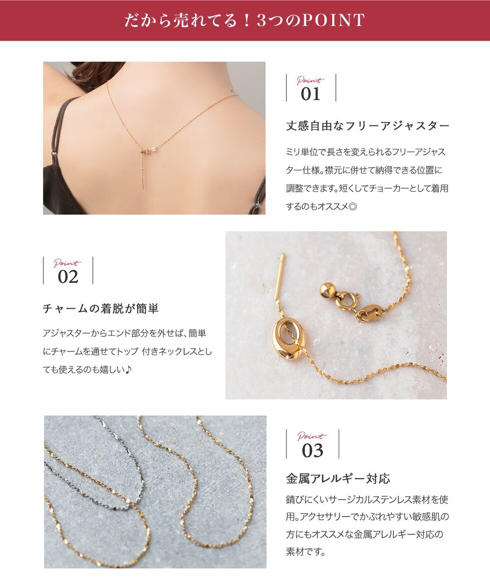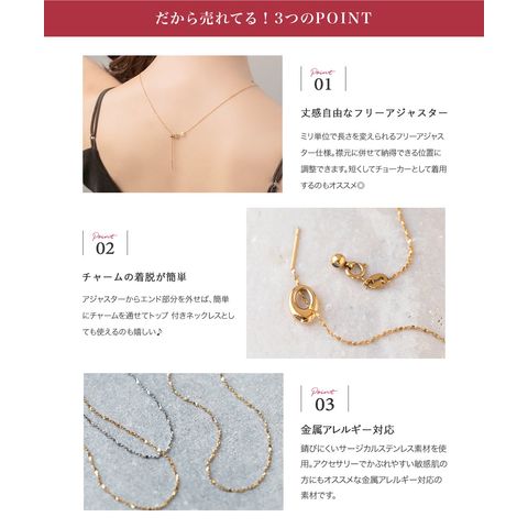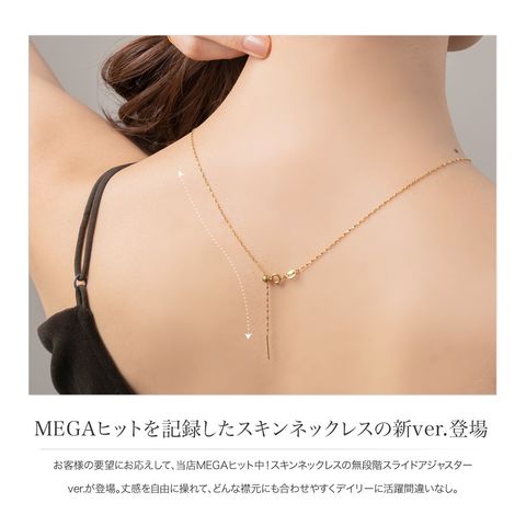 お客様の要望にお応えして、当店MEGAヒット中!スキンネックレスの無段階スライドアジャスターver.が登場。丈感を自由に操れて、どんな襟元にも合わせやすくデイリーに活躍間違いなし。