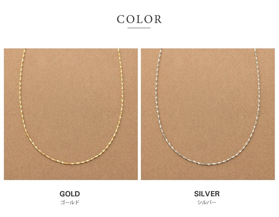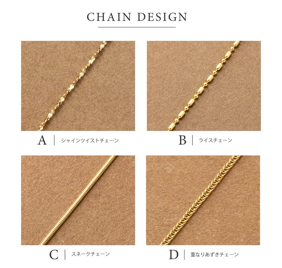 4種類のデザインから選べるネックレスチェーン。金具がなくスッキリとしたピンタイプなので、お手持ちのペンダントトップと組み合わせて印象チェンジするのもオススメ◎