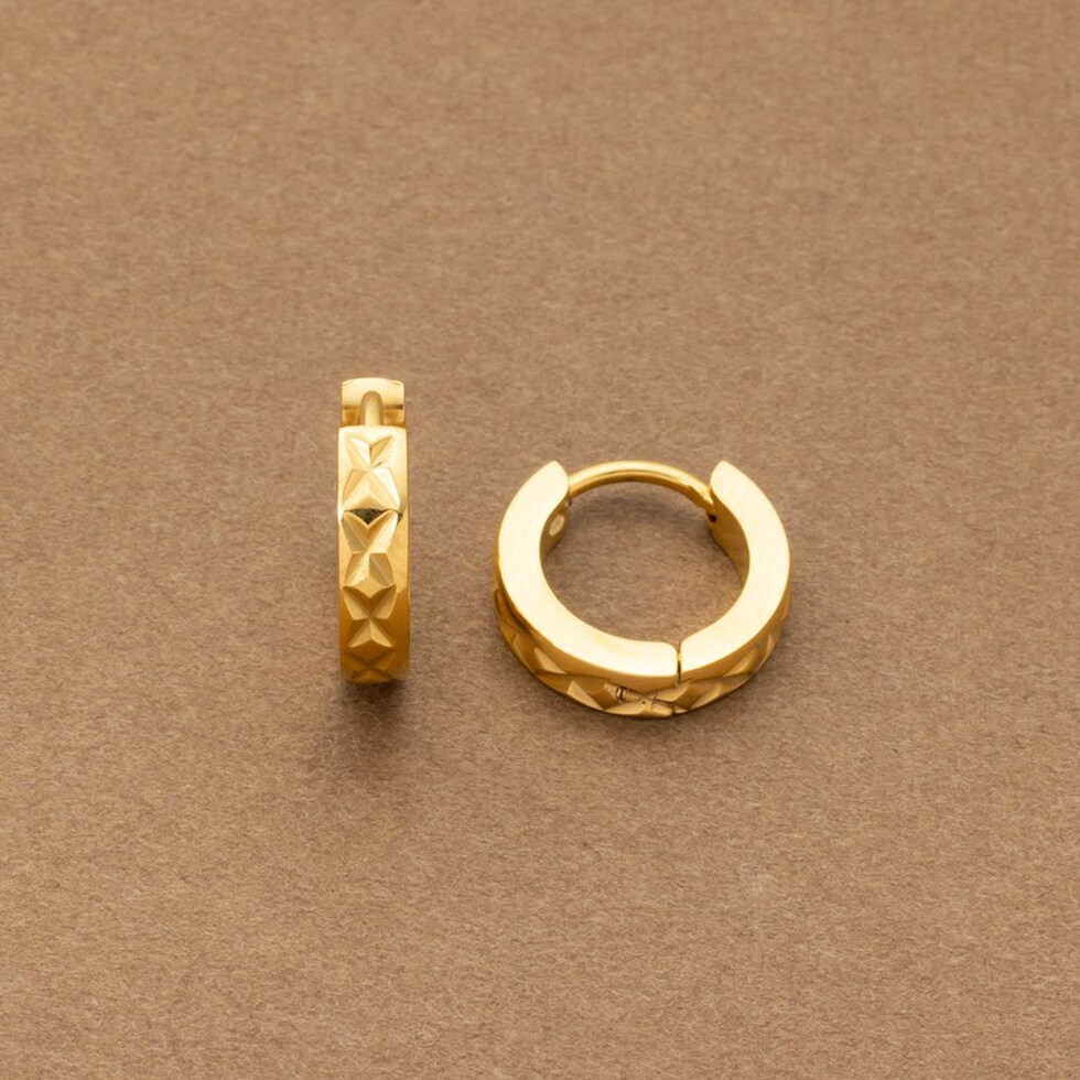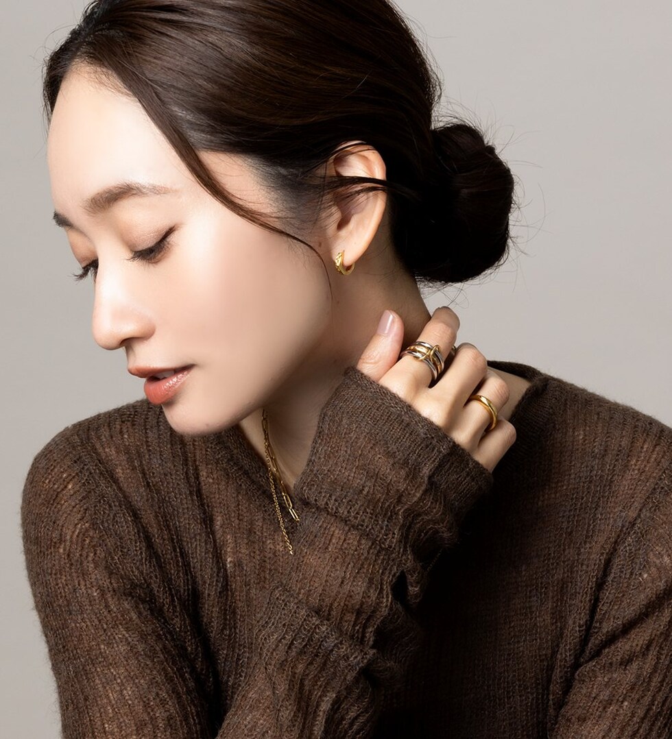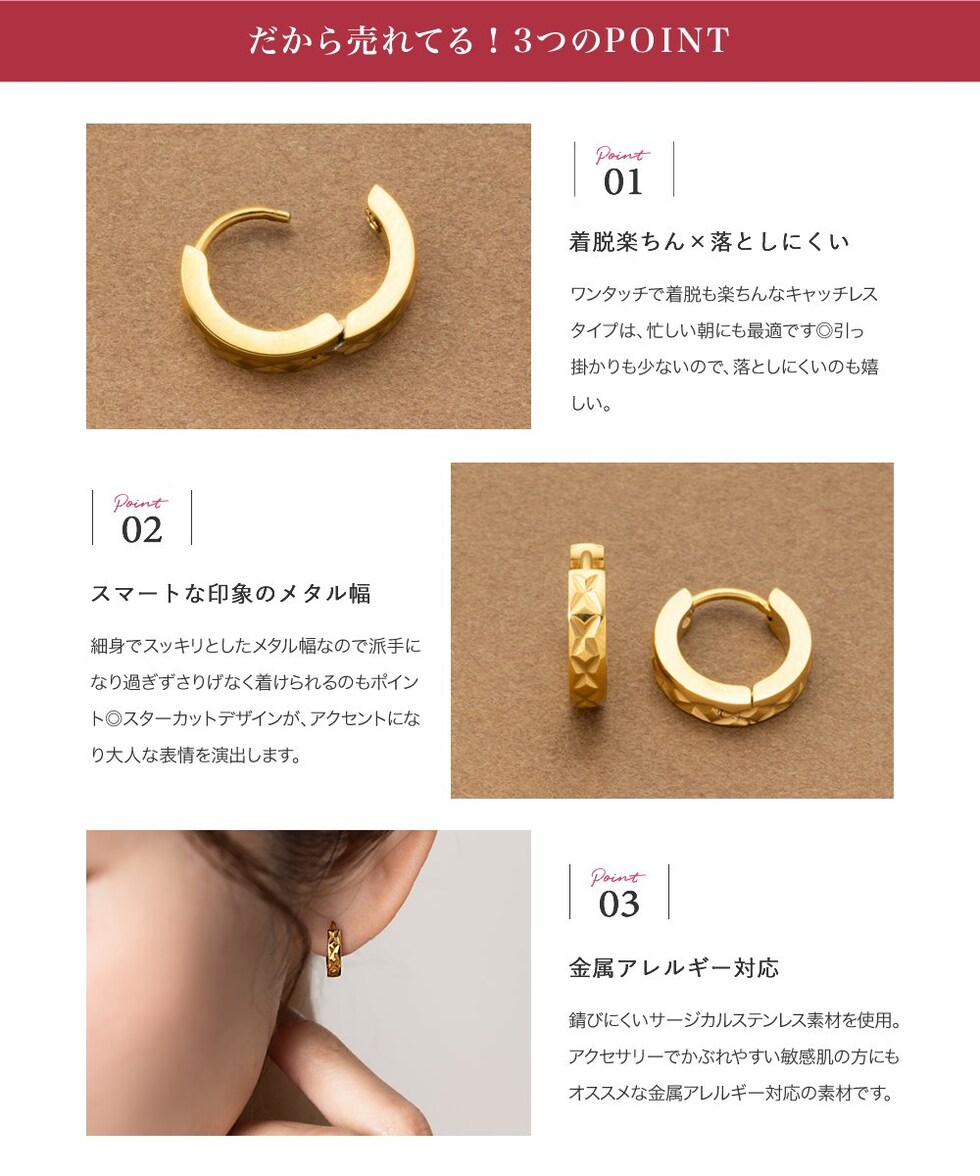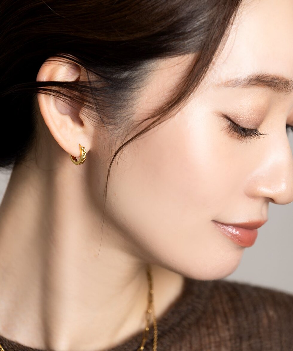 切り込みを入れたメタルが目を惹くキャッチレスフープピアス。さりげないメタル幅と高見えするデザインでこなれた印象をプラスします。長時間の着用にもオススメなステンレス製で、デイリーに活躍してくれるアイテム◎