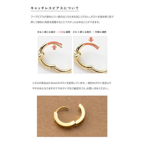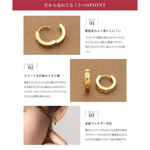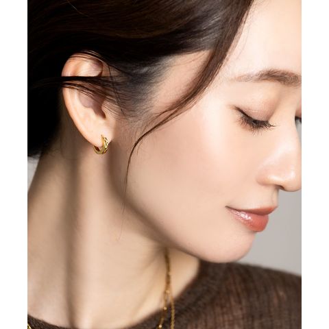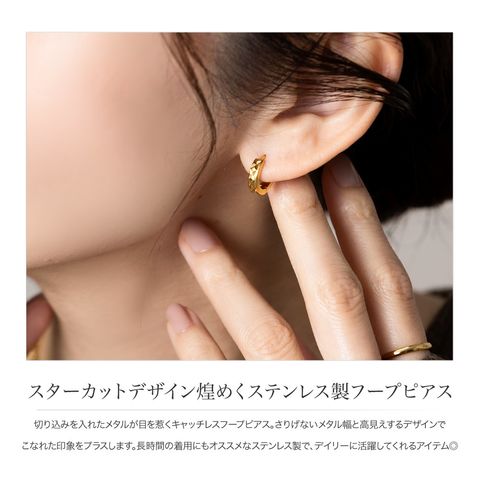 切り込みを入れたメタルが目を惹くキャッチレスフープピアス。さりげないメタル幅と高見えするデザインでこなれた印象をプラスします。長時間の着用にもオススメなステンレス製で、デイリーに活躍してくれるアイテム◎