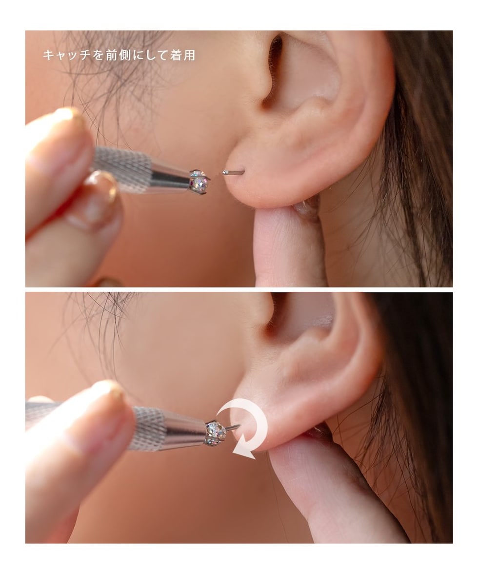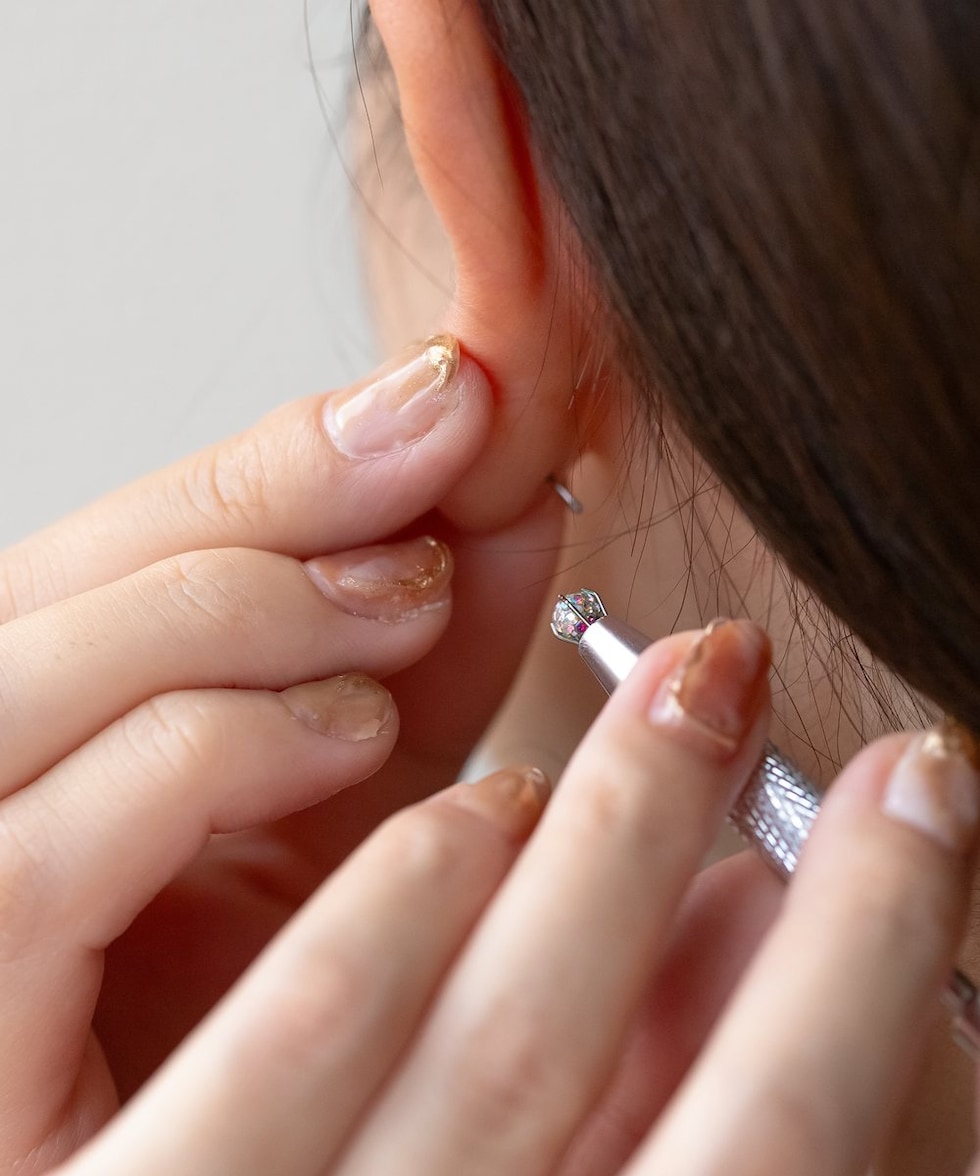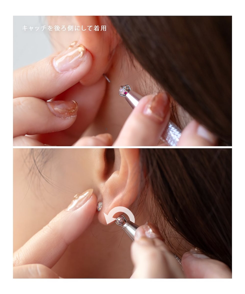 長めのネイルだとつかみにくいボール型のキャッチも着脱が簡単に◎ストレスなくスムーズに装着できて、煩わしさも解消。