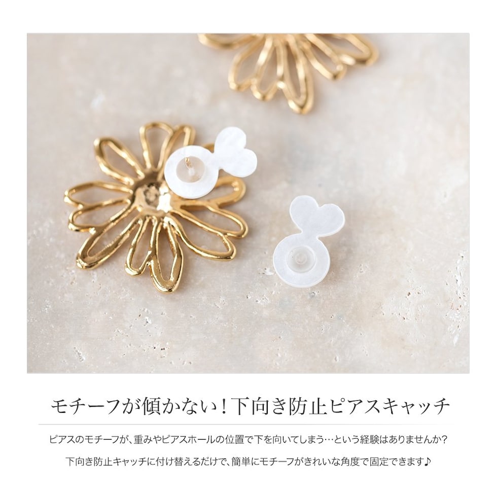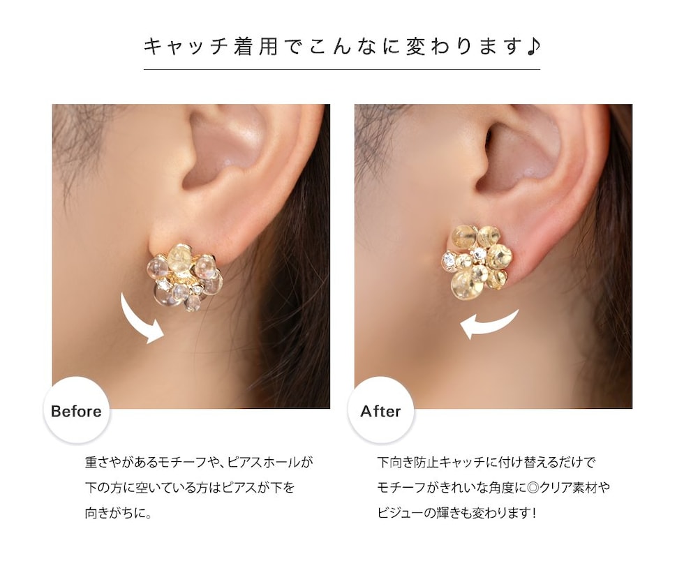 ピアスのモチーフが、重みやピアスホールの位置で下を向いてしまう…という経験はありませんか?下向き防止キャッチに付け替えるだけで、簡単にモチーフがきれいな角度で固定できます♪