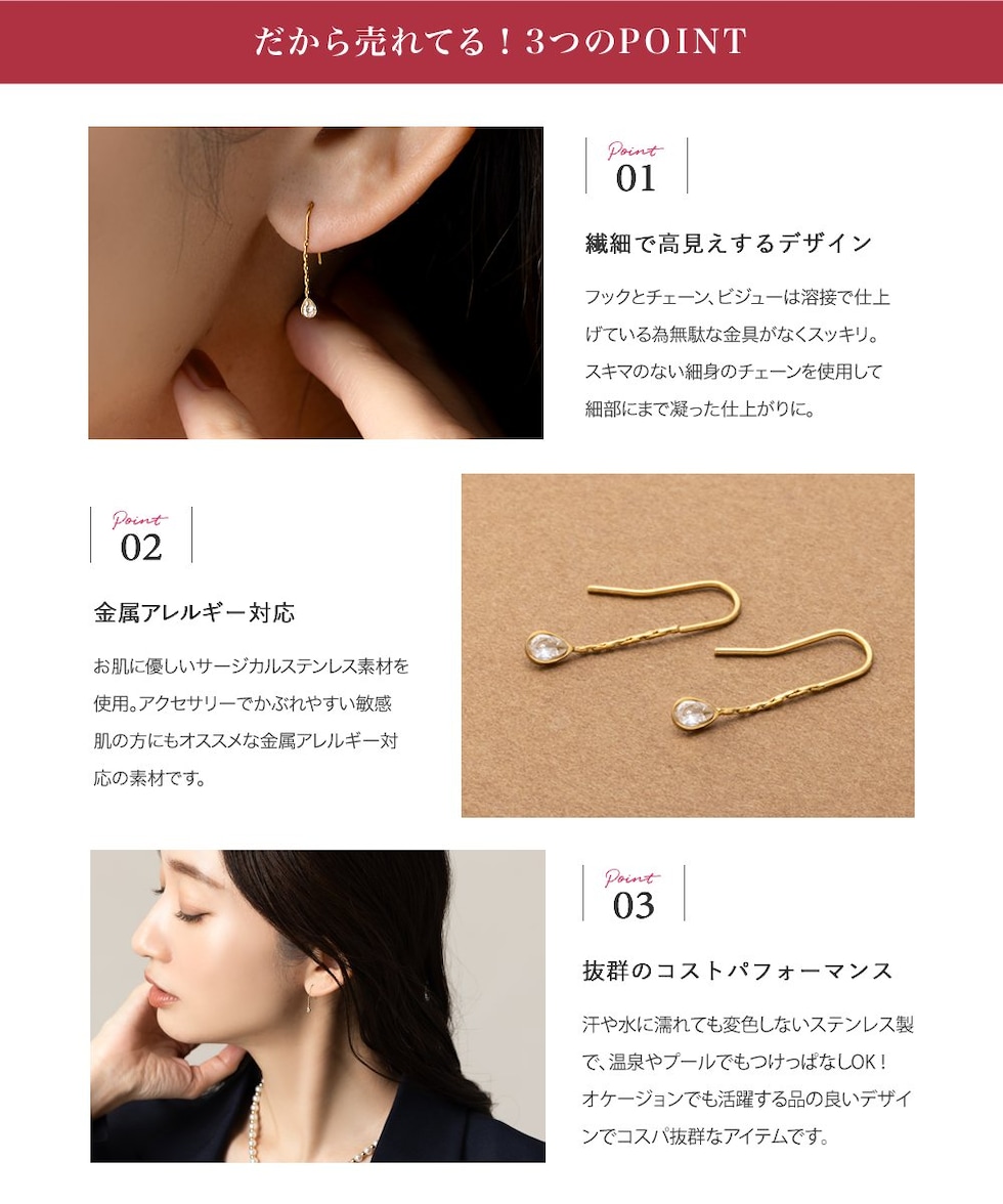 ピアス ステンレス 金属アレルギー サージカルステンレス レディース つけっぱなし フック ドロップ ビジュー チェーン しずくミニ 小粒 揺れる cream dot ゆうパケット [ピンクゴールド_ピアス]
