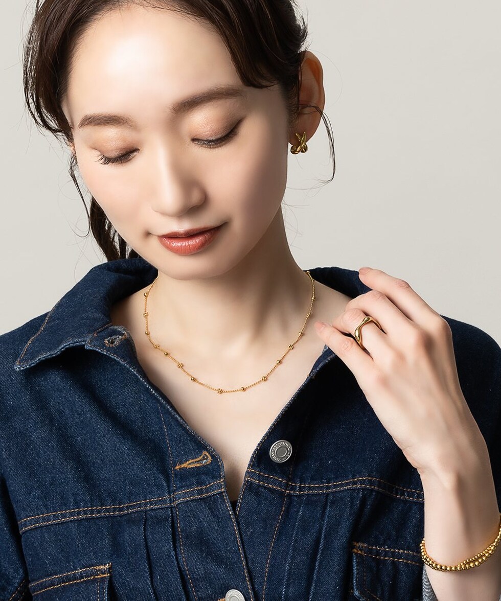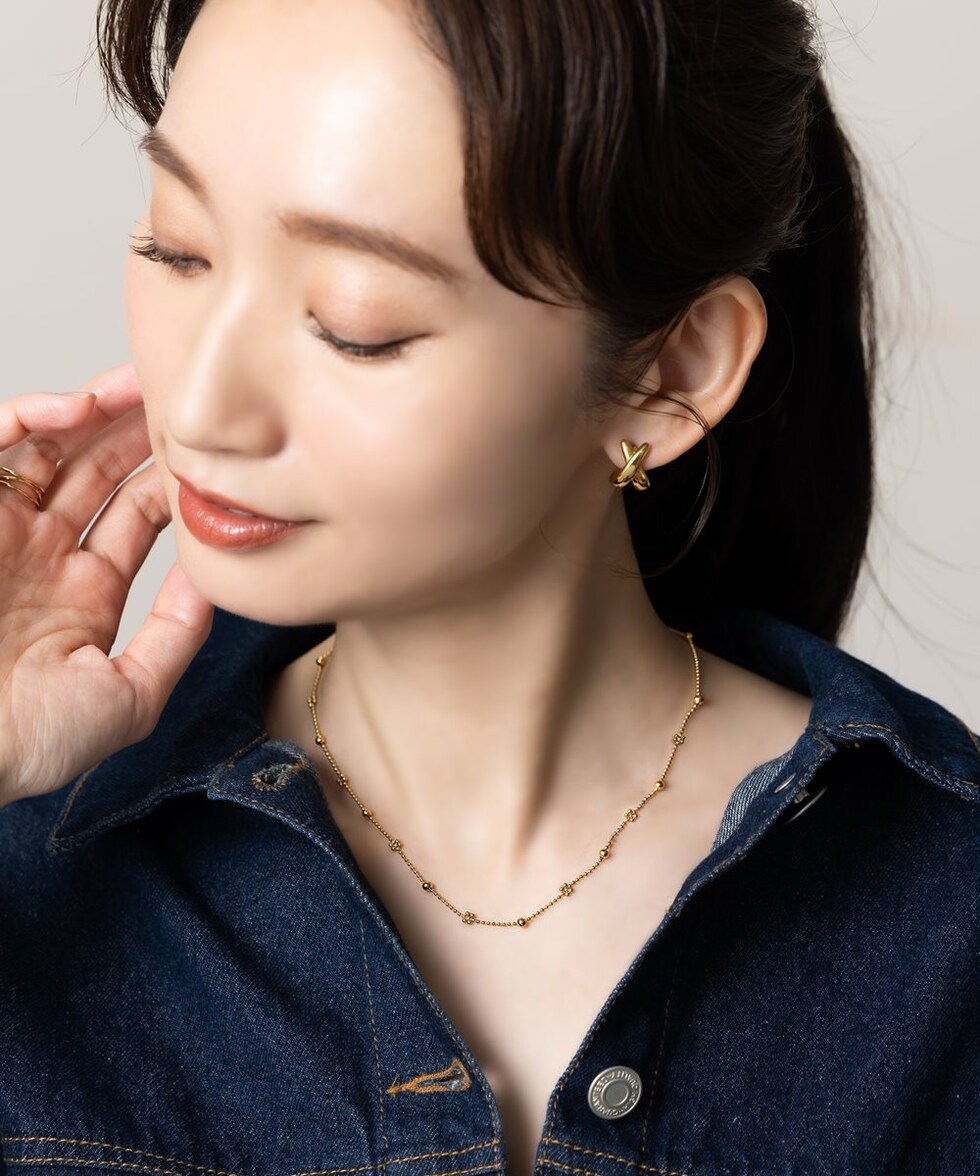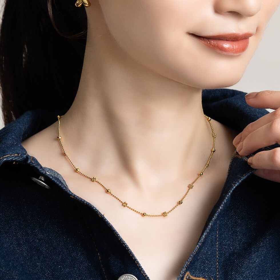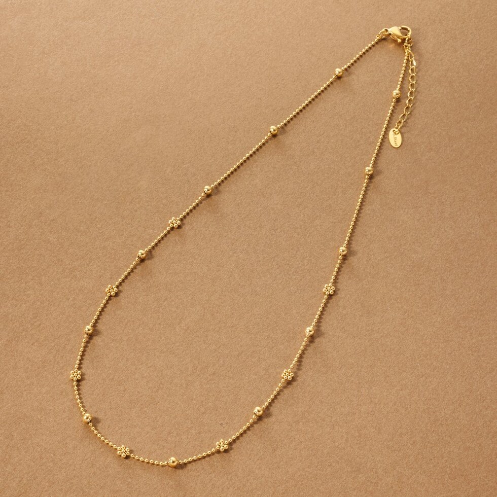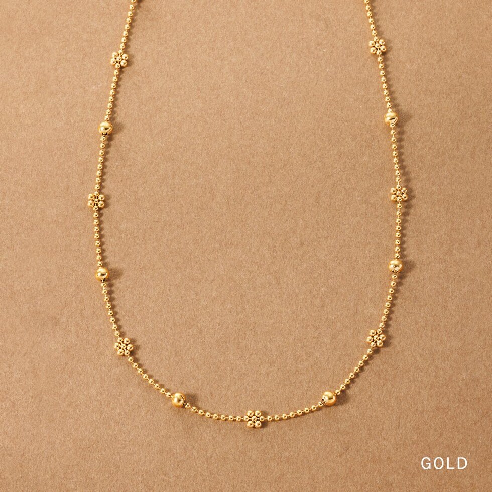 小さなフラワー×メタルボールが等間隔に連なったステーションネックレス。さりげない装飾が品よく艶めいて、デコルテを美しく魅せてくれる◎カジュアルにもキレイめにも合わせやすいオススメのアイテムです。