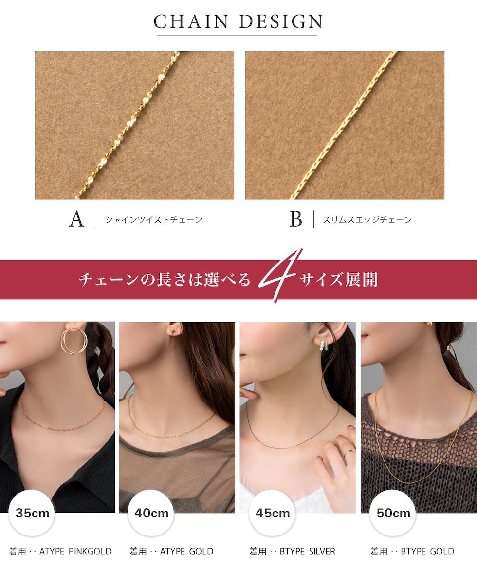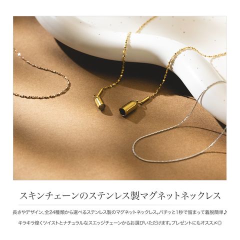 長さやデザイン、全24種類から選べるステンレス製のマグネットネックレス。パチッと1秒で留まって着脱簡単♪キラキラ煌くツイストとナチュラルなスエッジチェーンからお選びいただけます。プレゼントにもオススメ◎