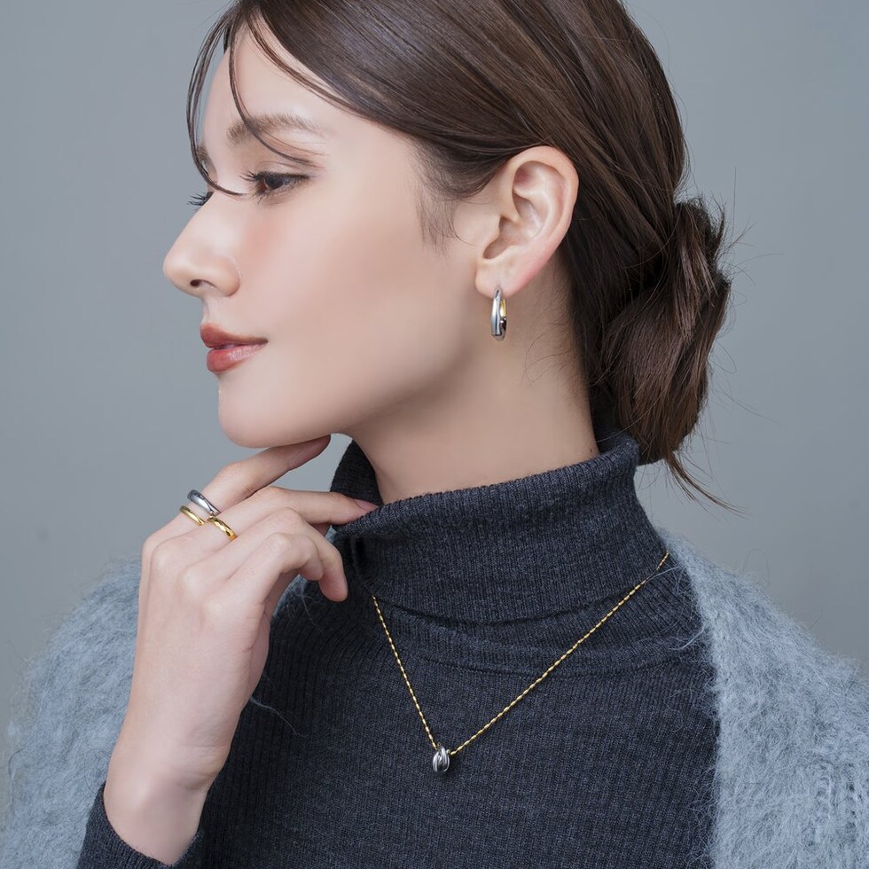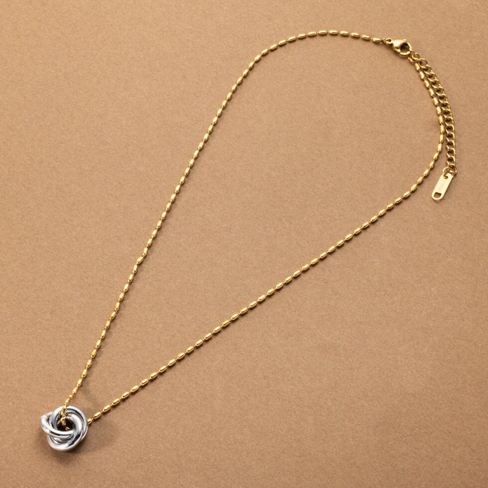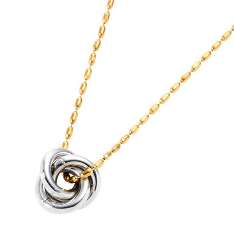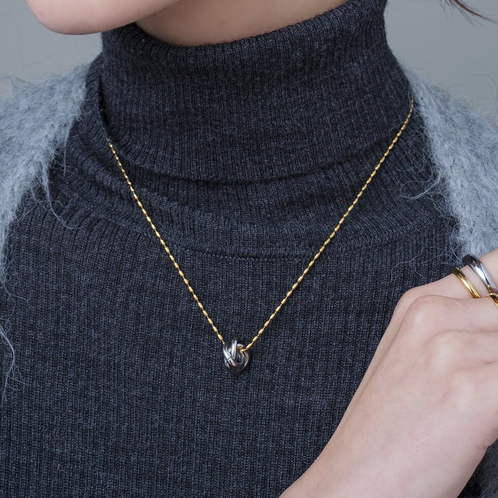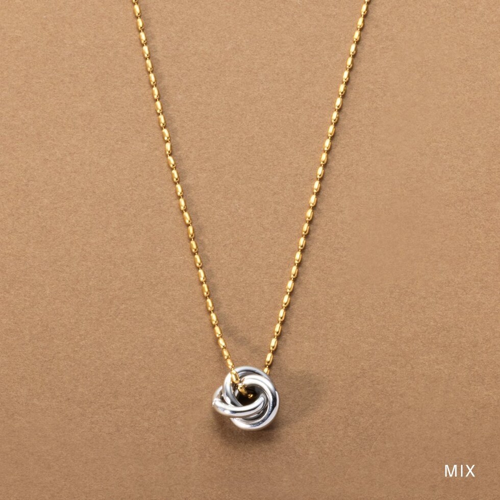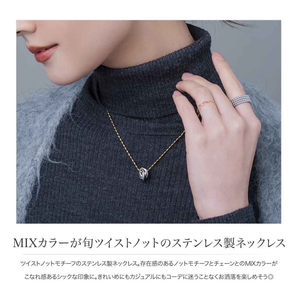 ツイストノットモチーフのステンレス製ネックレス。存在感のあるノットモチーフとチェーンとのMIXカラーがこなれ感あるシックな印象に。きれいめにもカジュアルにもコーデに迷うことなくお洒落を楽しめそう◎