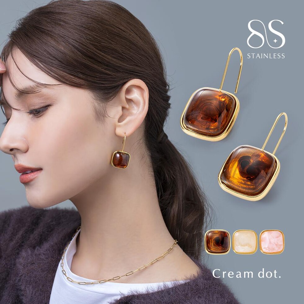 ピアス ステンレス 金属アレルギー サージカルステンレス レディース つけっぱなし フック マーブル スクエアストーン 四角 ぷっくり 大きめ フレーム cream dot ゆうパケット [ナチュラル_ピアス]