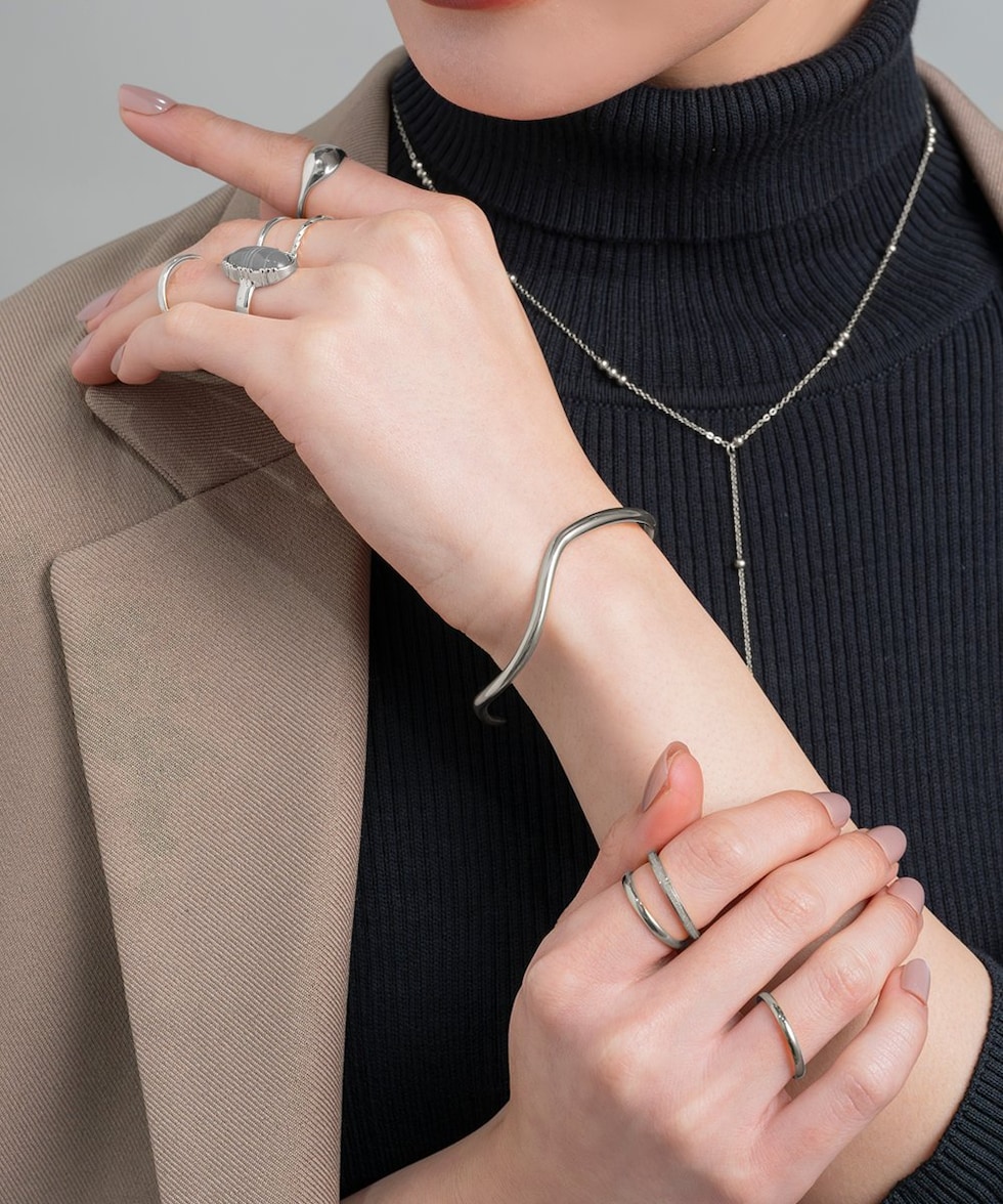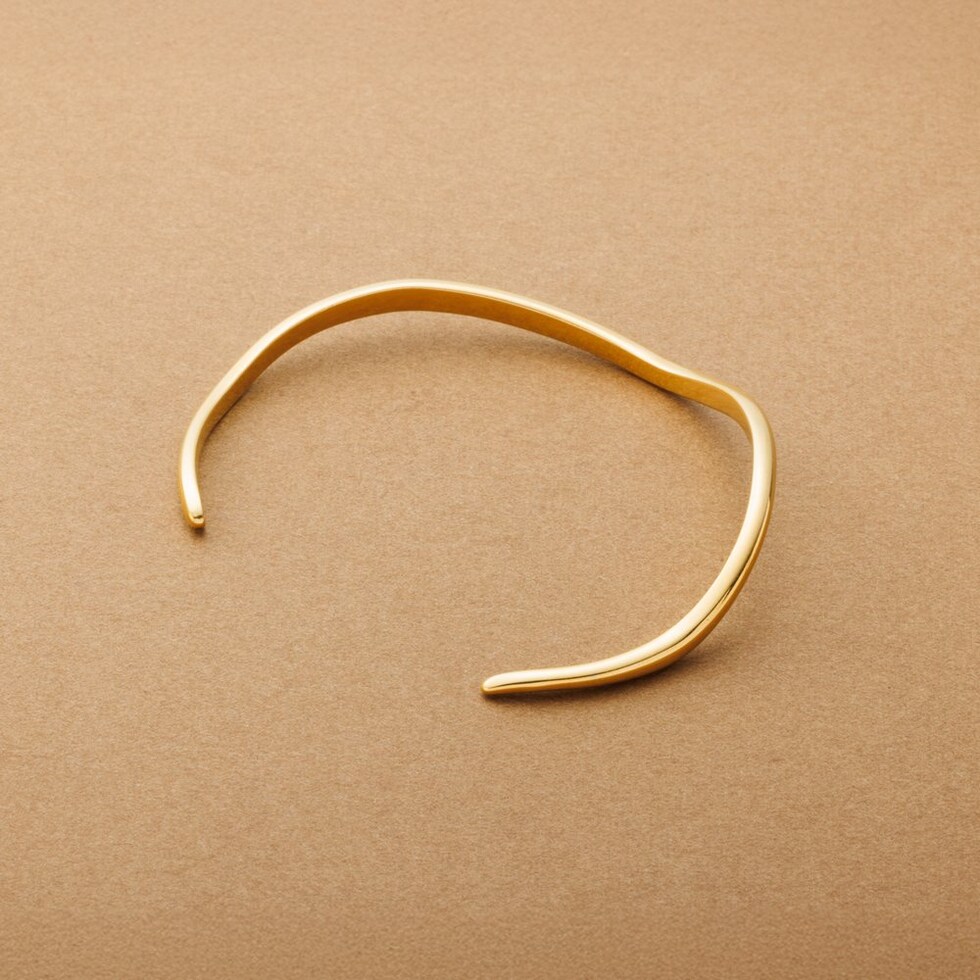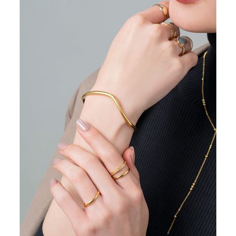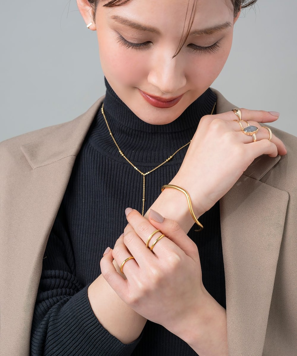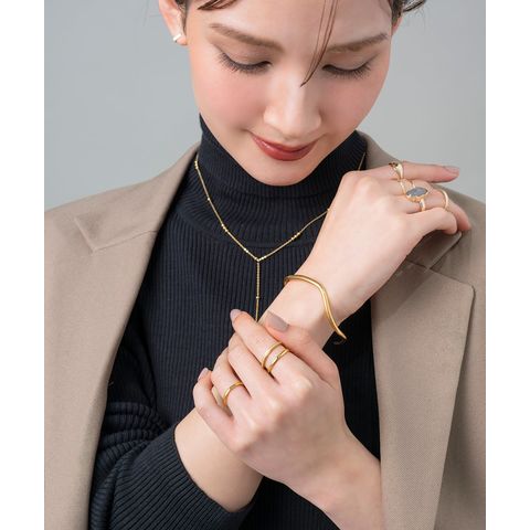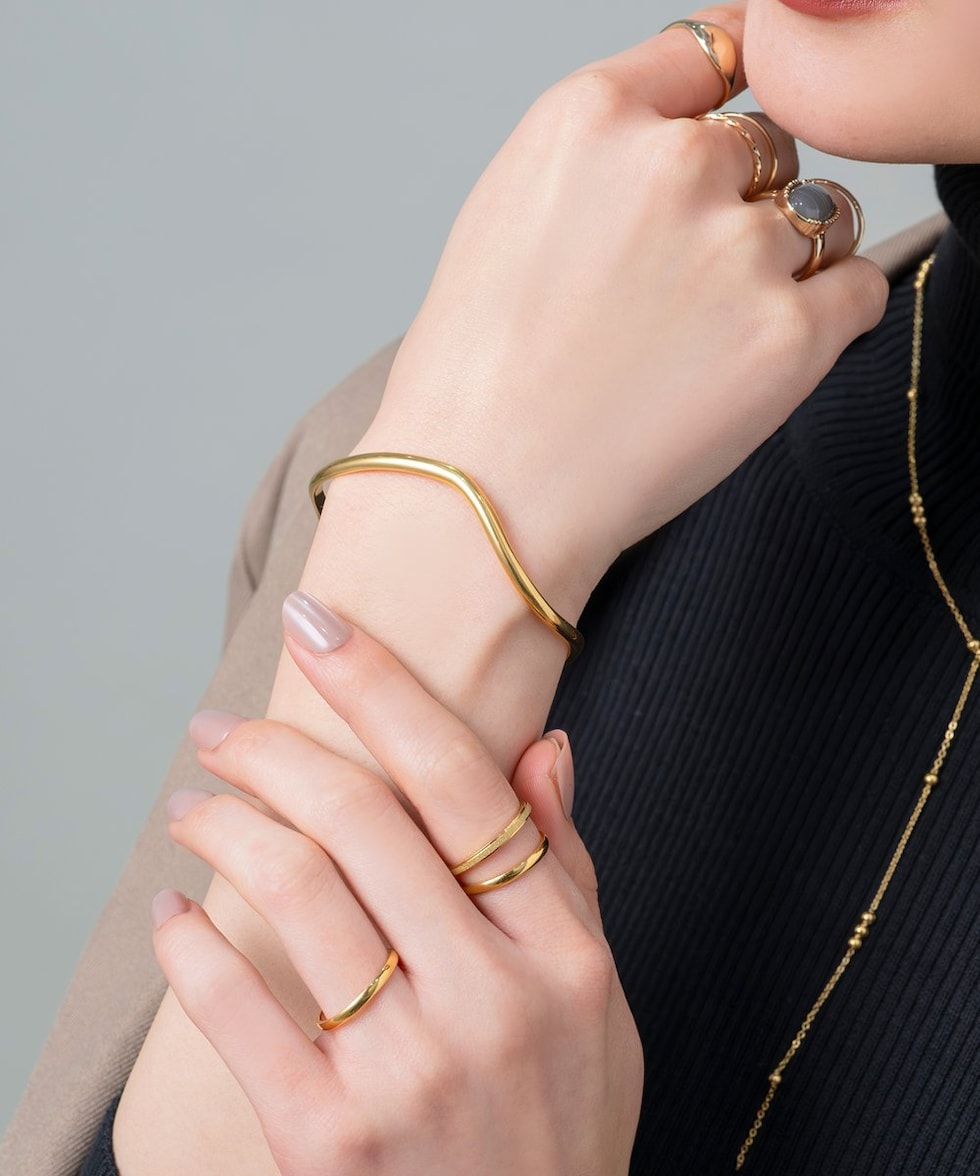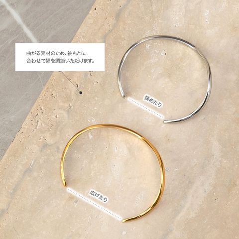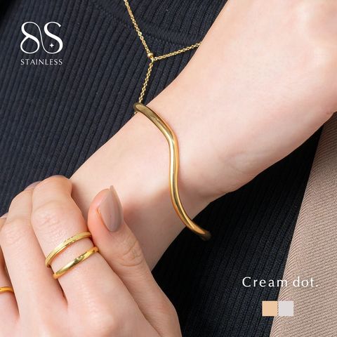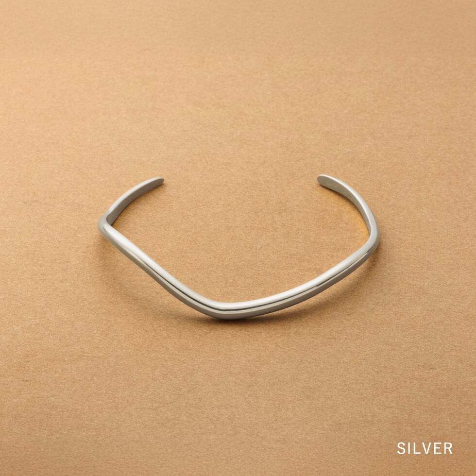 緩やかなウェーブがニュアンスたっぷりなオープンバングル。ありそうでない、ちょうど良い太さと微調節できるオープンタイプで手元コーデに活躍しそう◎錆びにくく傷に強いステンレス素材です。