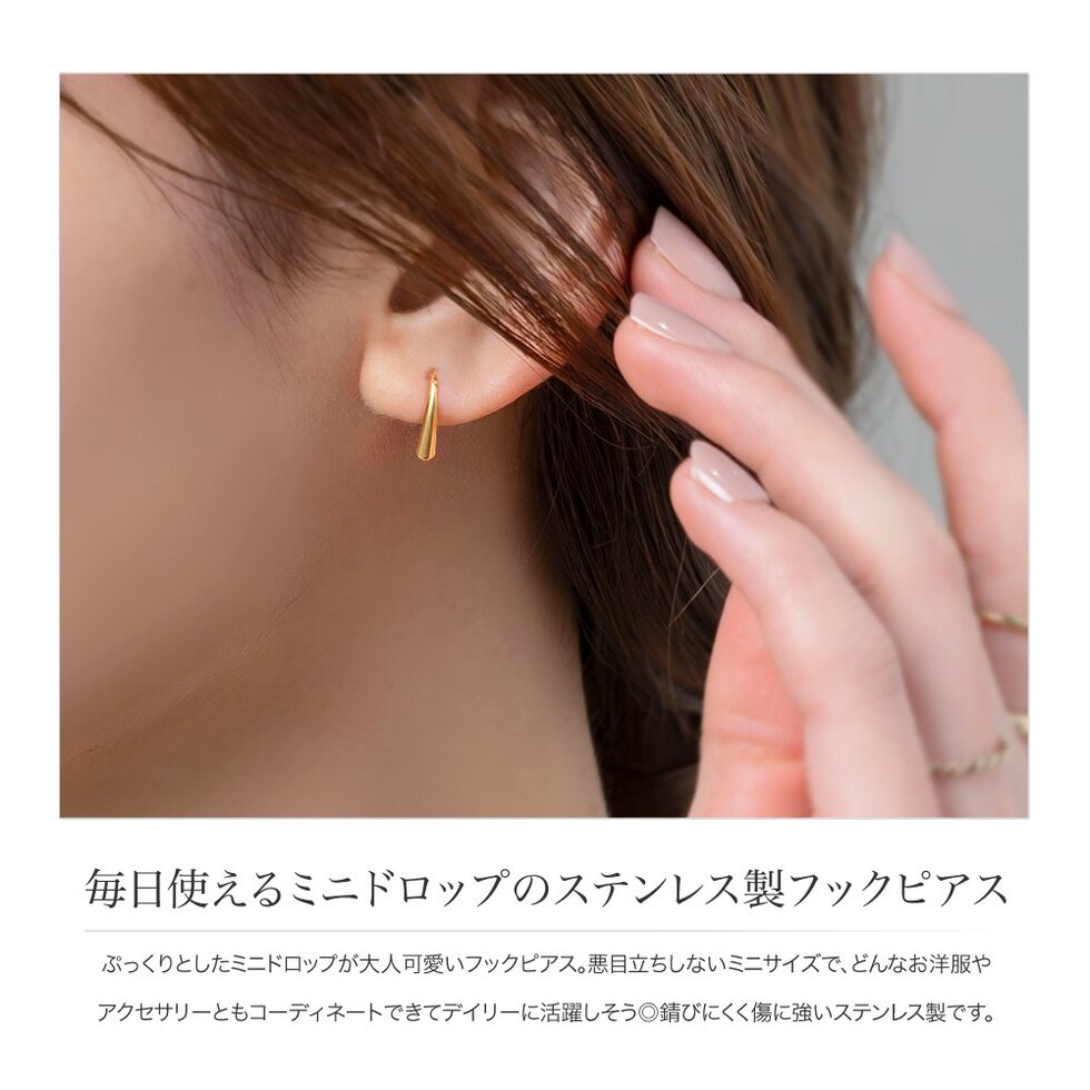 ぷっくりとしたミニドロップが大人可愛いフックピアス。悪目立ちしないミニサイズで、どんなお洋服やアクセサリーともコーディネートできてデイリーに活躍しそう◎錆びにくく傷に強いステンレス製です。