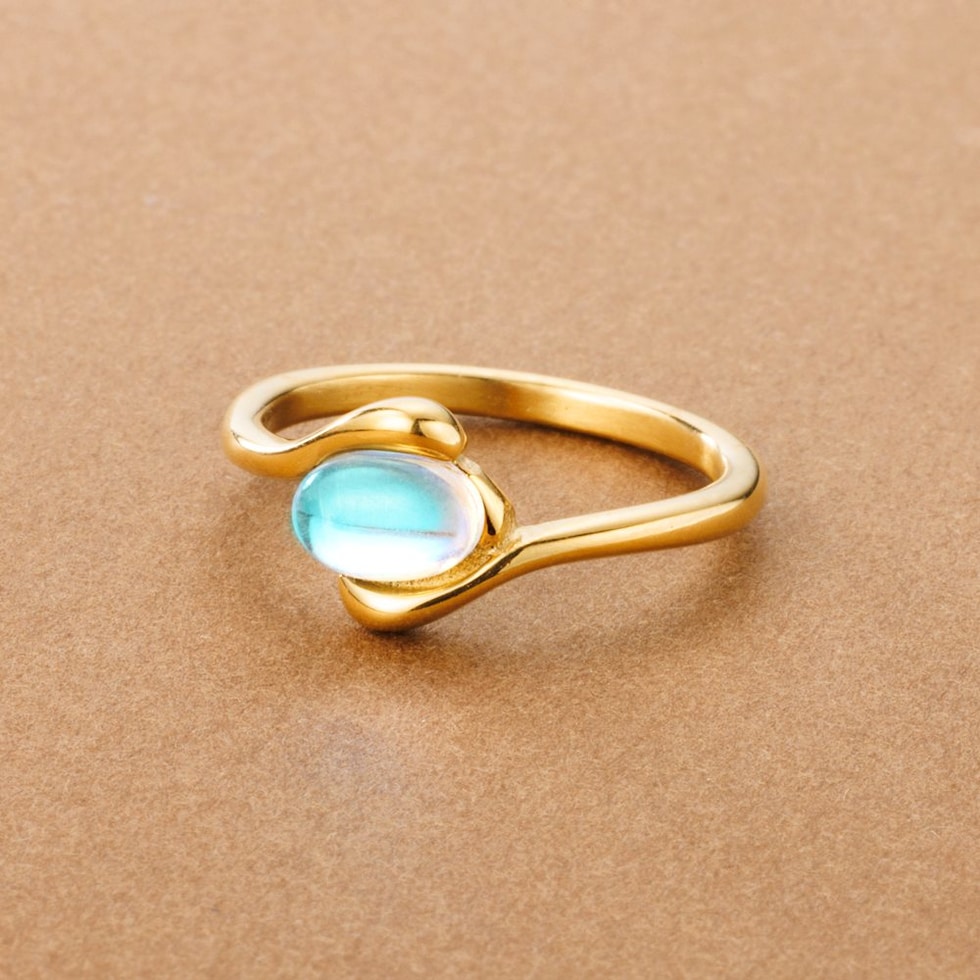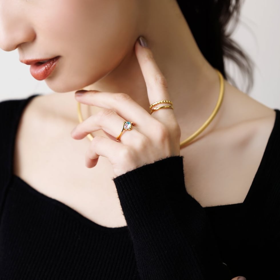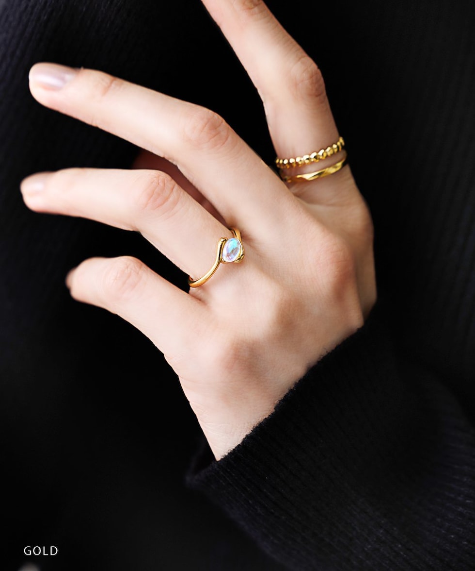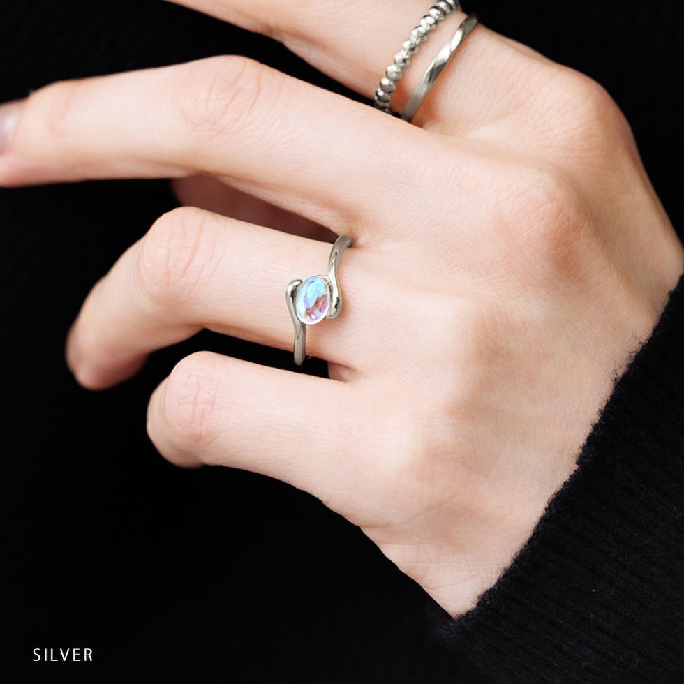 神秘的な輝きを放つ、オーバル天然石のステンレス製リング。見る角度によって表情を変える月光石が、透明感あふれる淡い色合いで、手元にそっと洗練された煌めきを添えます。毎日身につけたくなる一品です。