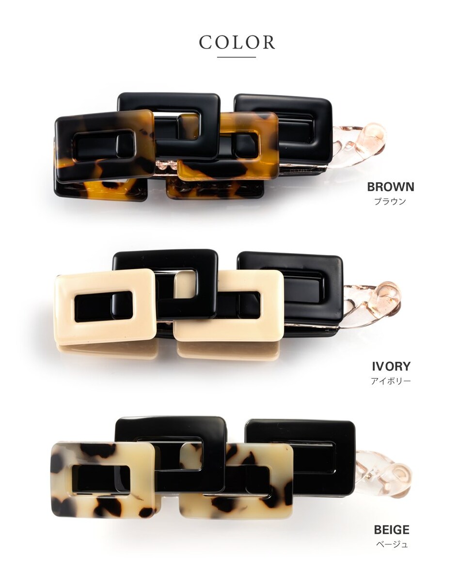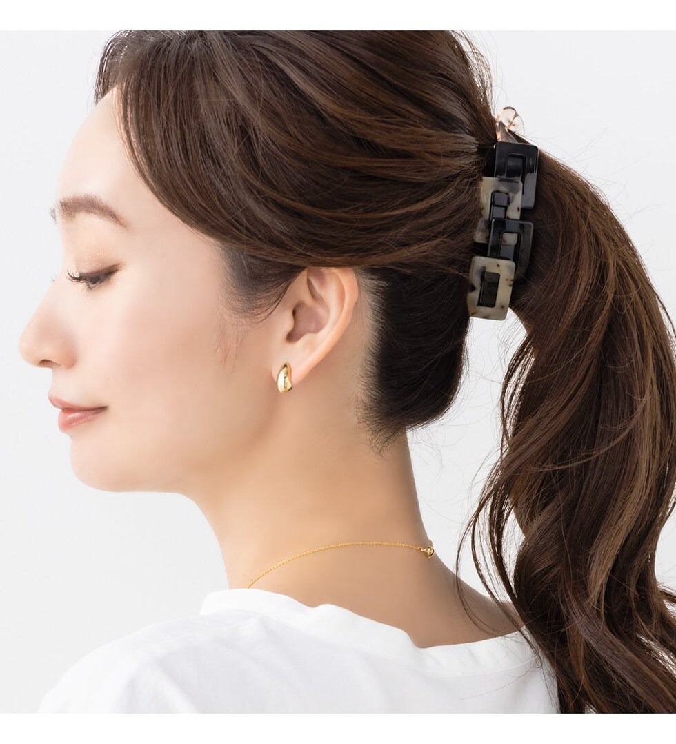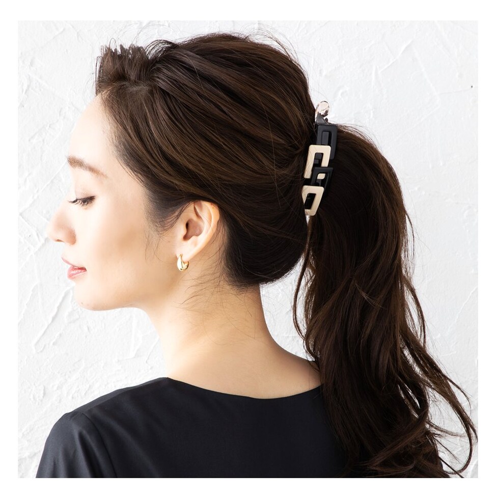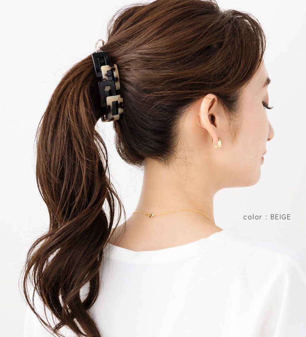 スクエアパーツがアクセントのバナナクリップ。程よいボリューム感でヘアスタイルに華やかさをプラスします。落ち着いたカラーリングとクリアベージュのクリップのコンビで大人っぽく身につけられます◎