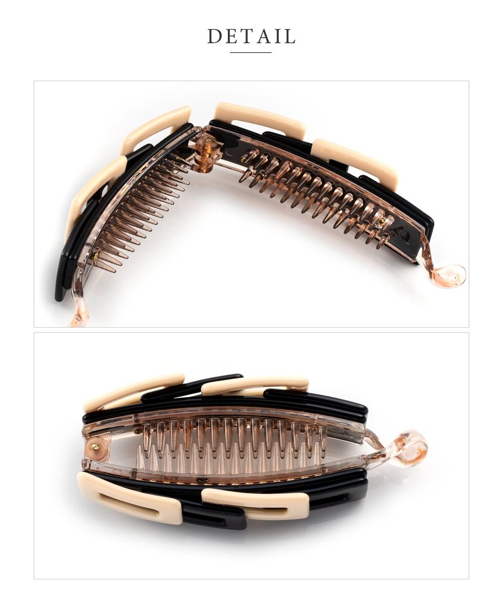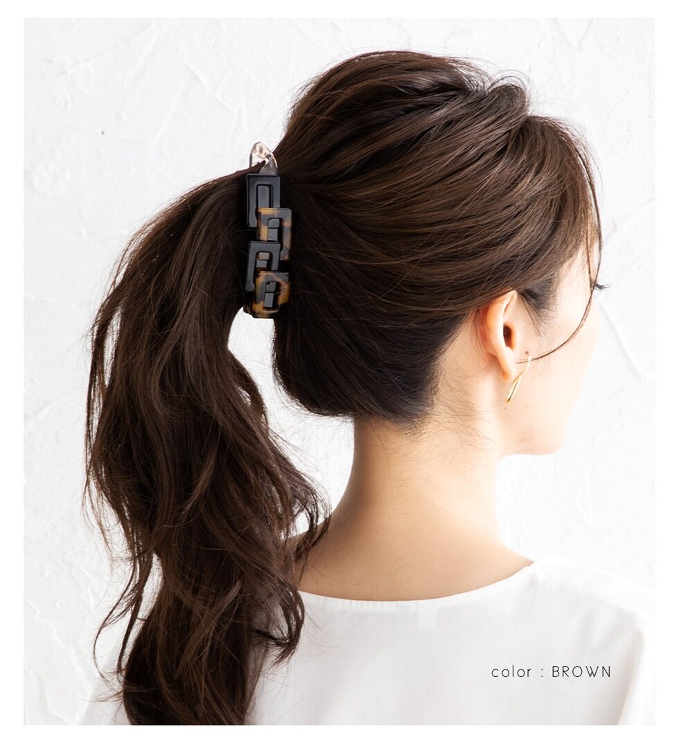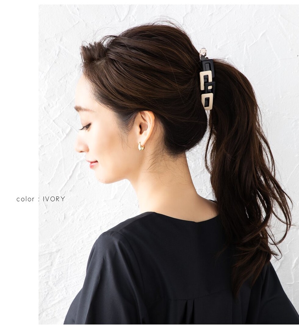 スクエアパーツがアクセントのバナナクリップ。程よいボリューム感でヘアスタイルに華やかさをプラスします。落ち着いたカラーリングとクリアベージュのクリップのコンビで大人っぽく身につけられます◎