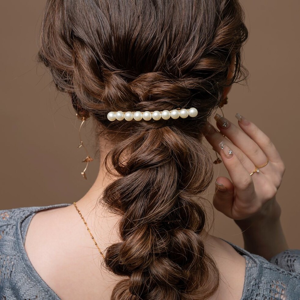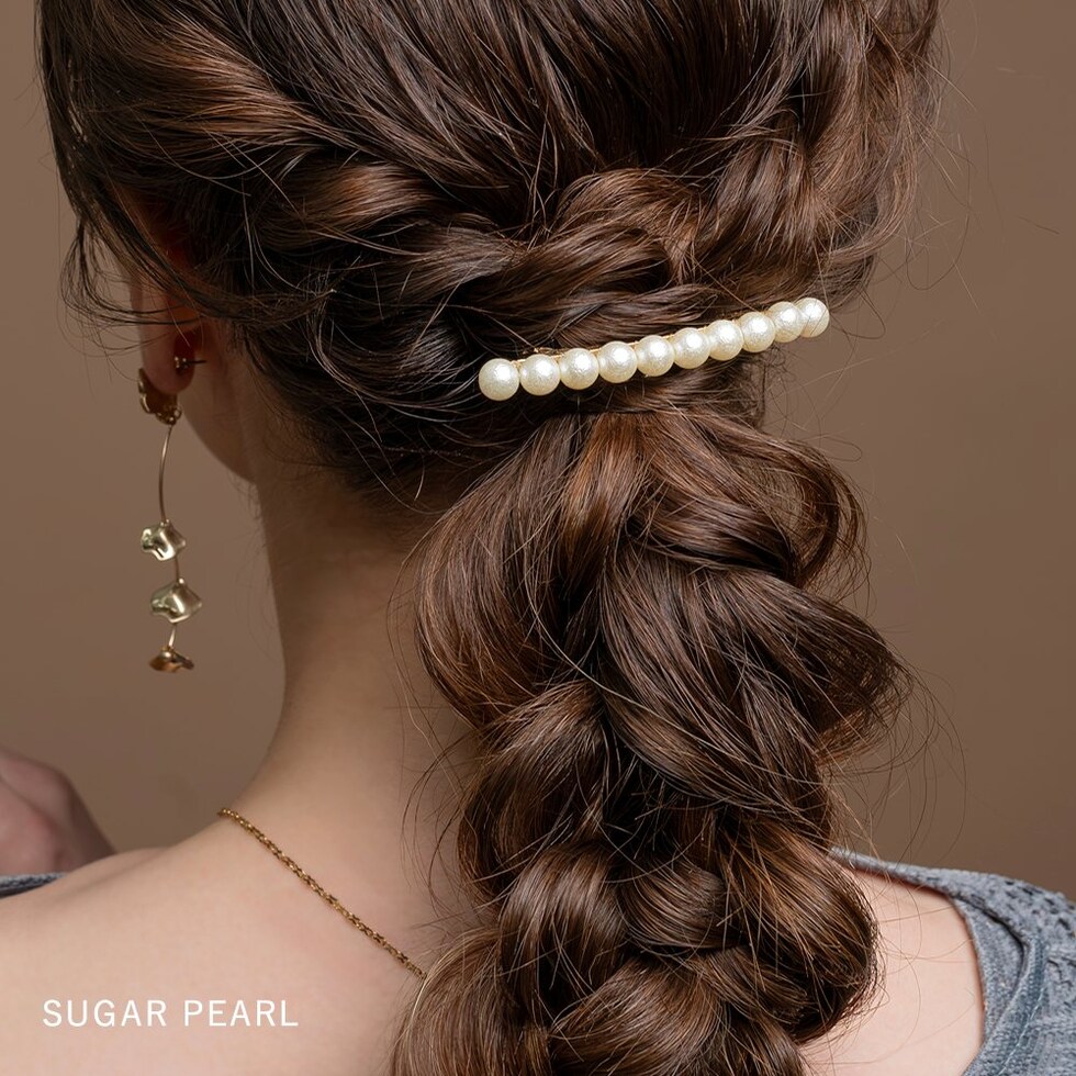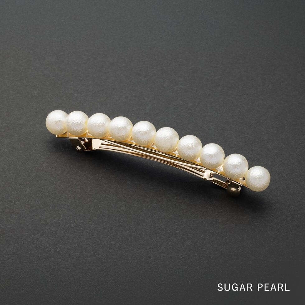 パールが連なったシュガー/ノーマルのバレッタ。細めなフォルムと淡く艶めく上品なデザインが、さりげない華やかさをプラス。普段使いからオケージョンにマッチする存在感あるアイテムです。