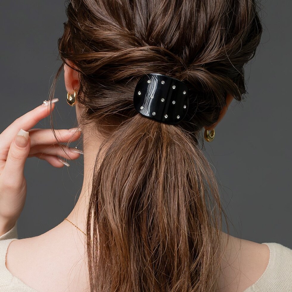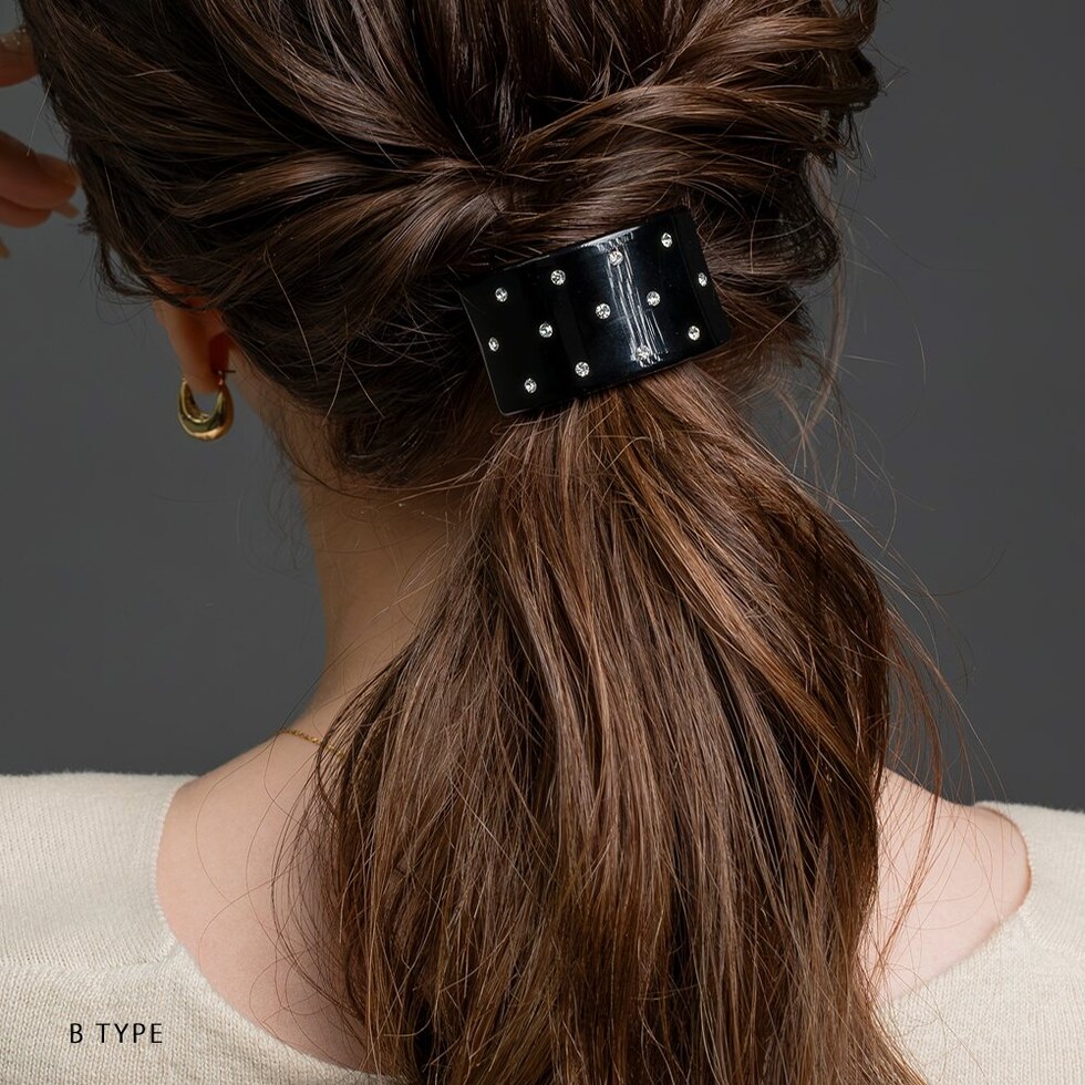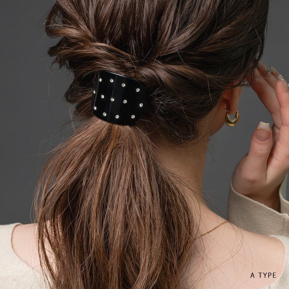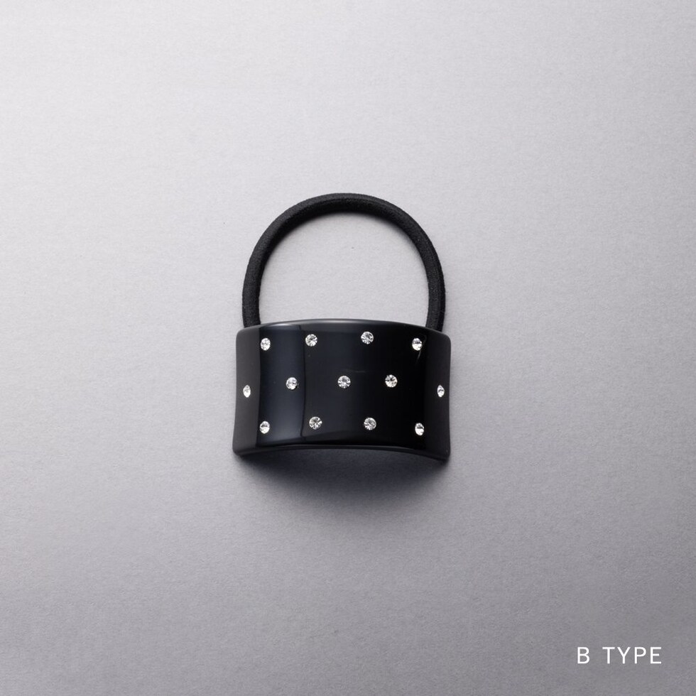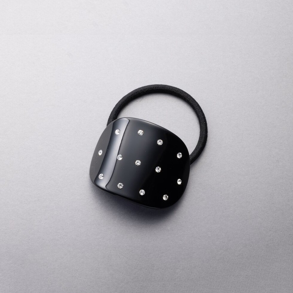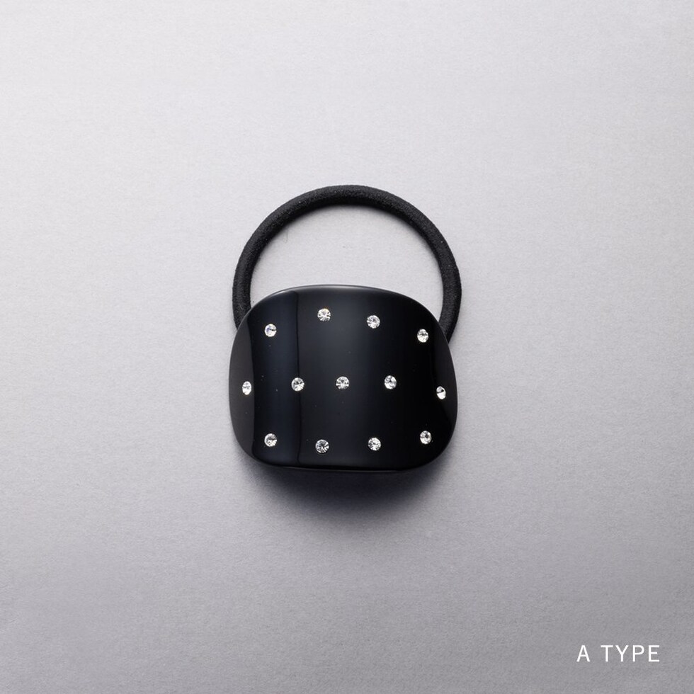 ドットビジューの2TYPEブラックプレートヘアゴム。緩やかにカーブするブラックプレートに極小ジルコニアを散りばめたドットデザインが大人っぽ可愛い逸品。お好みで選べるオーバルorスクエアの2タイプご用意。