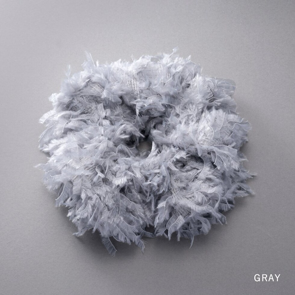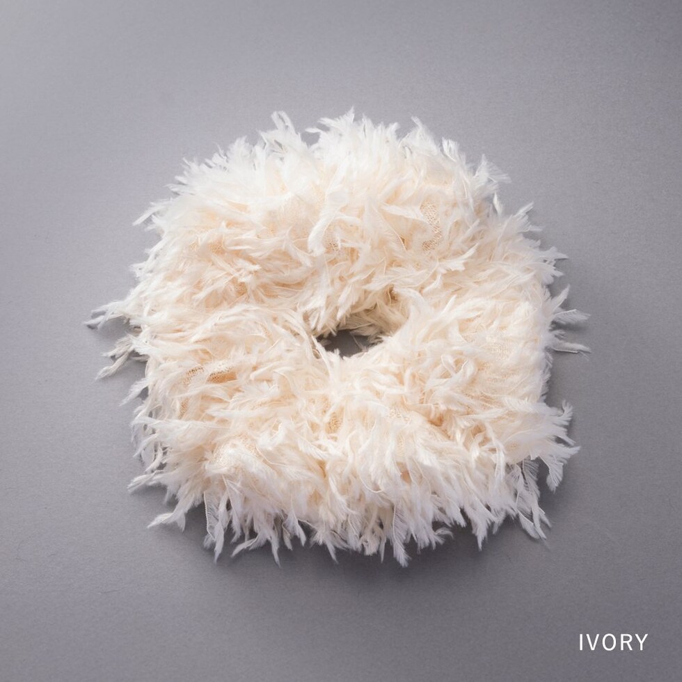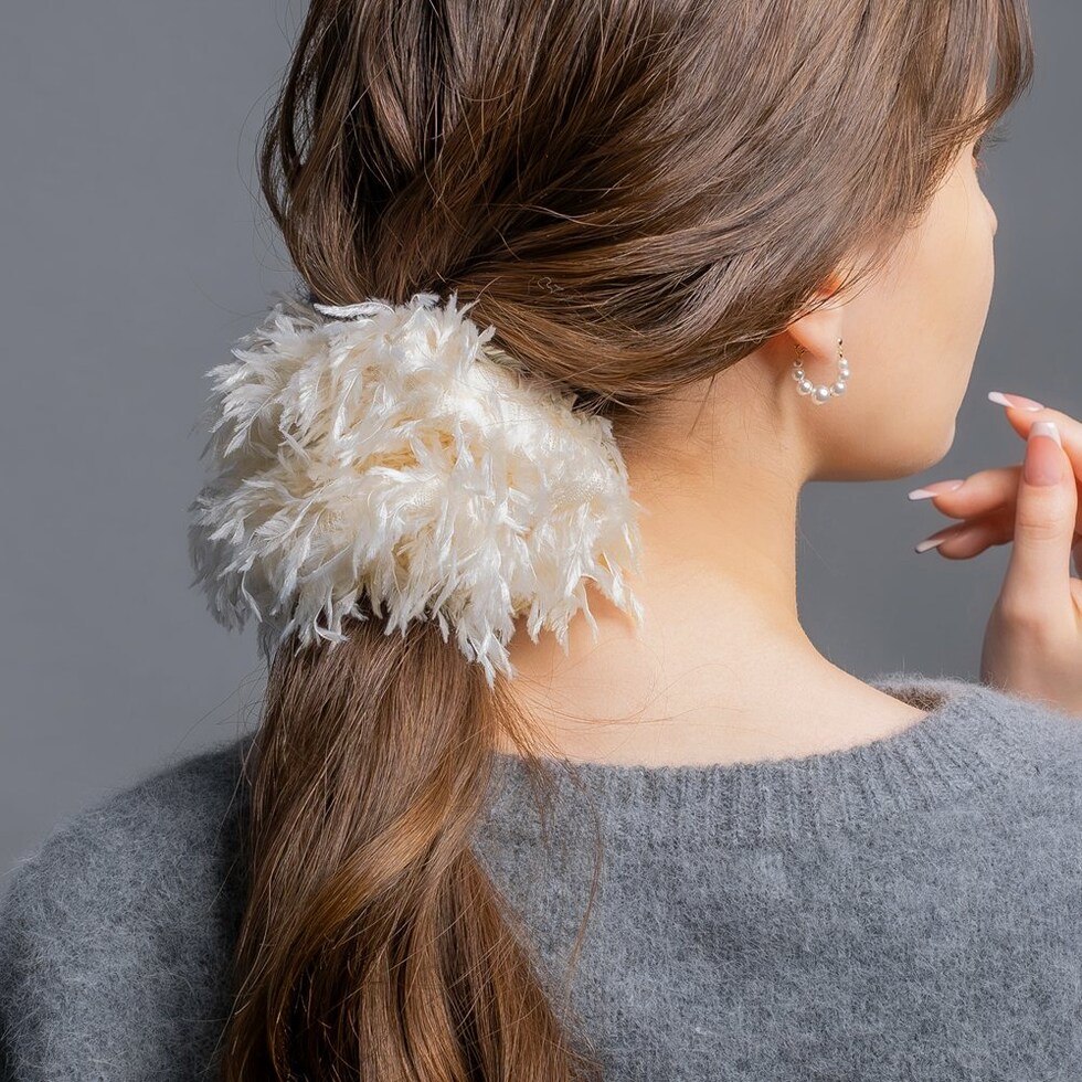 羽根のような質感、フェザー生地のシュシュ。高見えする素材感で可愛らしくなりすぎず、大人ヘアにぴったりなアイテム。存在感もありつつ、後ろ姿に女性らしい柔らかなアクセントを添えてくれます。さっと結ぶだけで目を惹くアレンジが完成します◎
