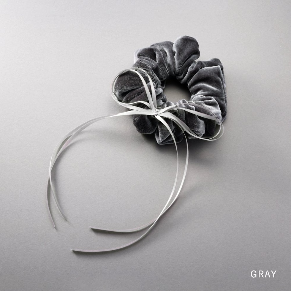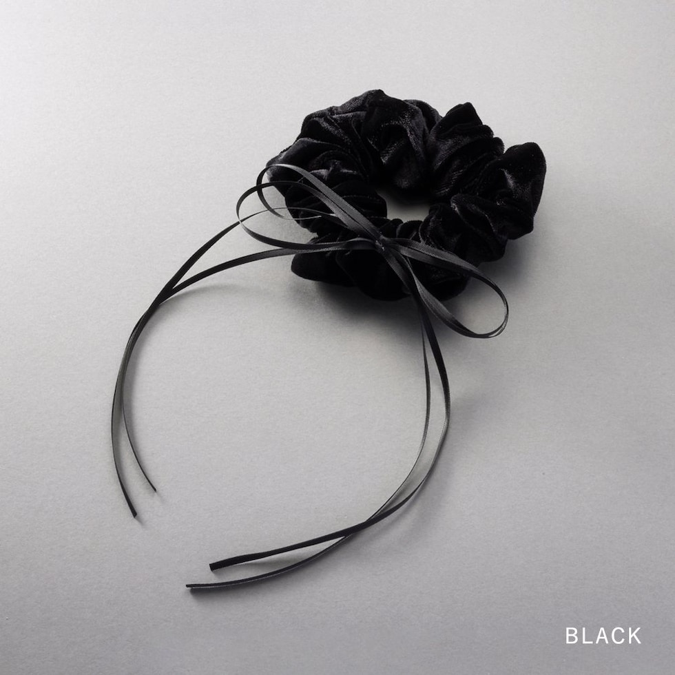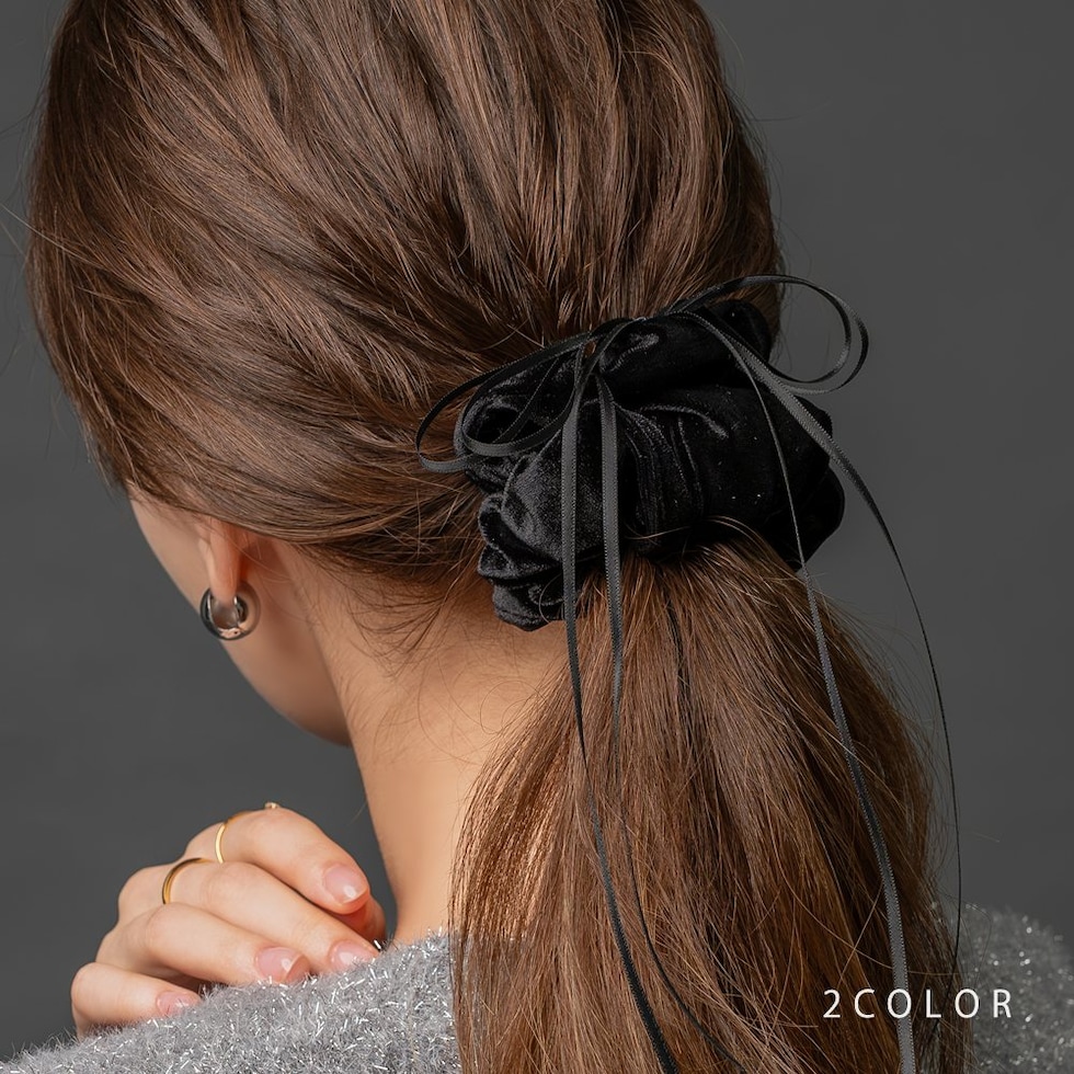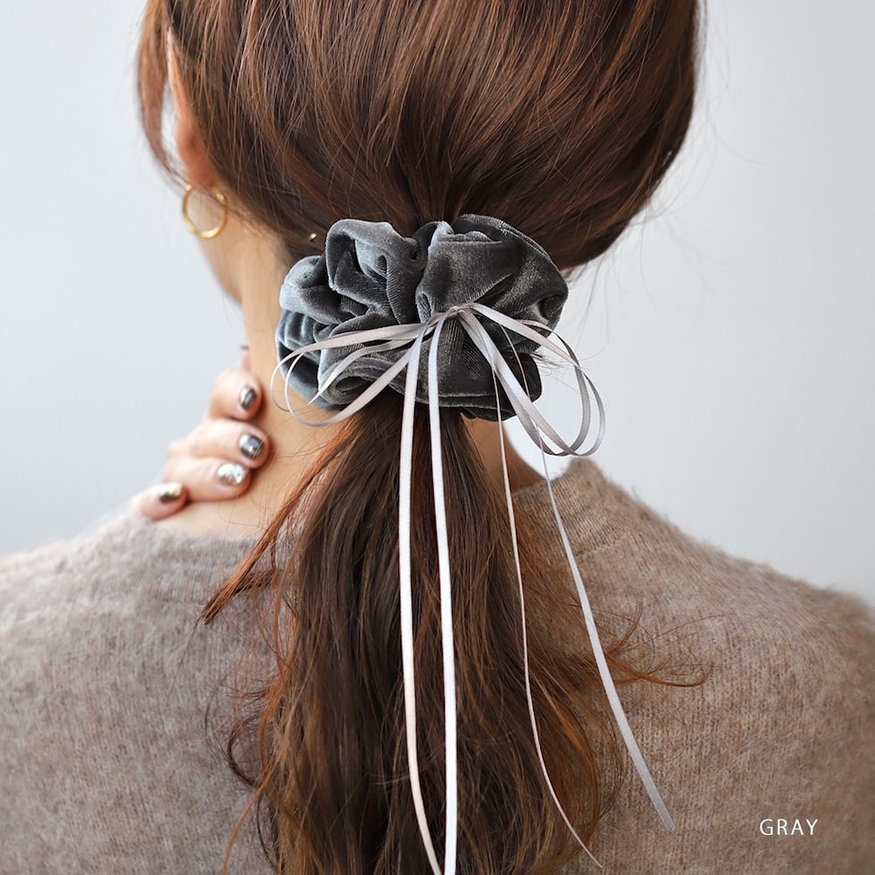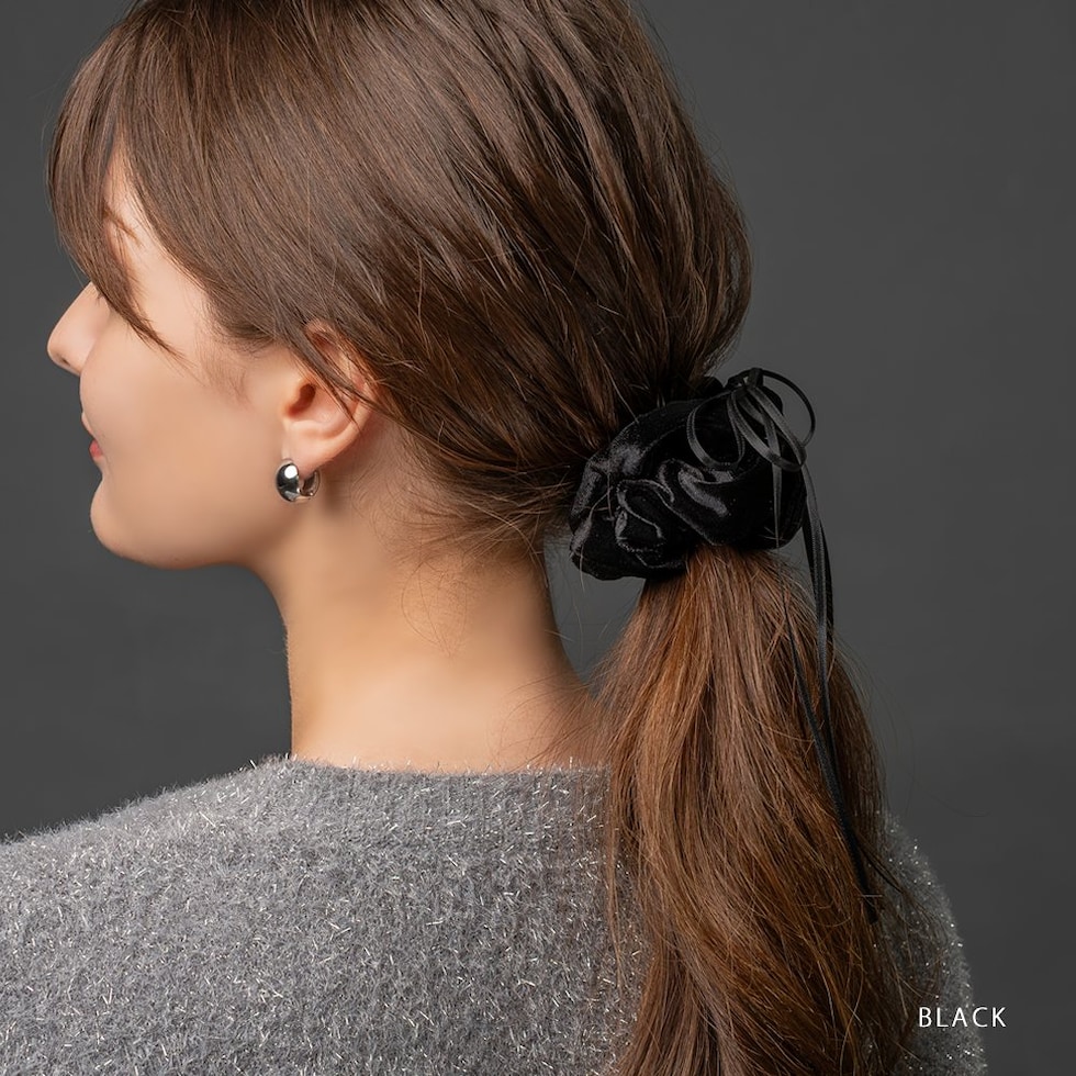 華奢なサテンリボンコードがアクセントのベロアシュシュ。微光沢で高級感のあるしっかりとしたベロア生地を採用しました。程よいボリューム感でさっと簡単にまとめるだけでおしゃれな仕上がりに◎