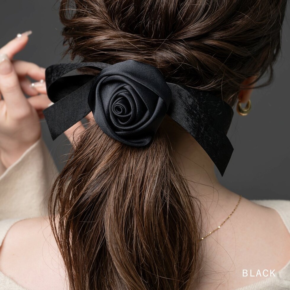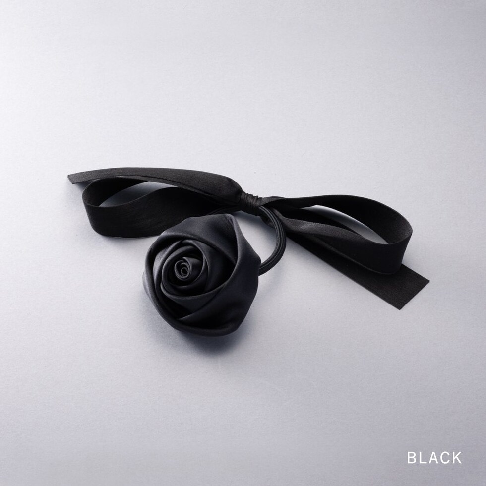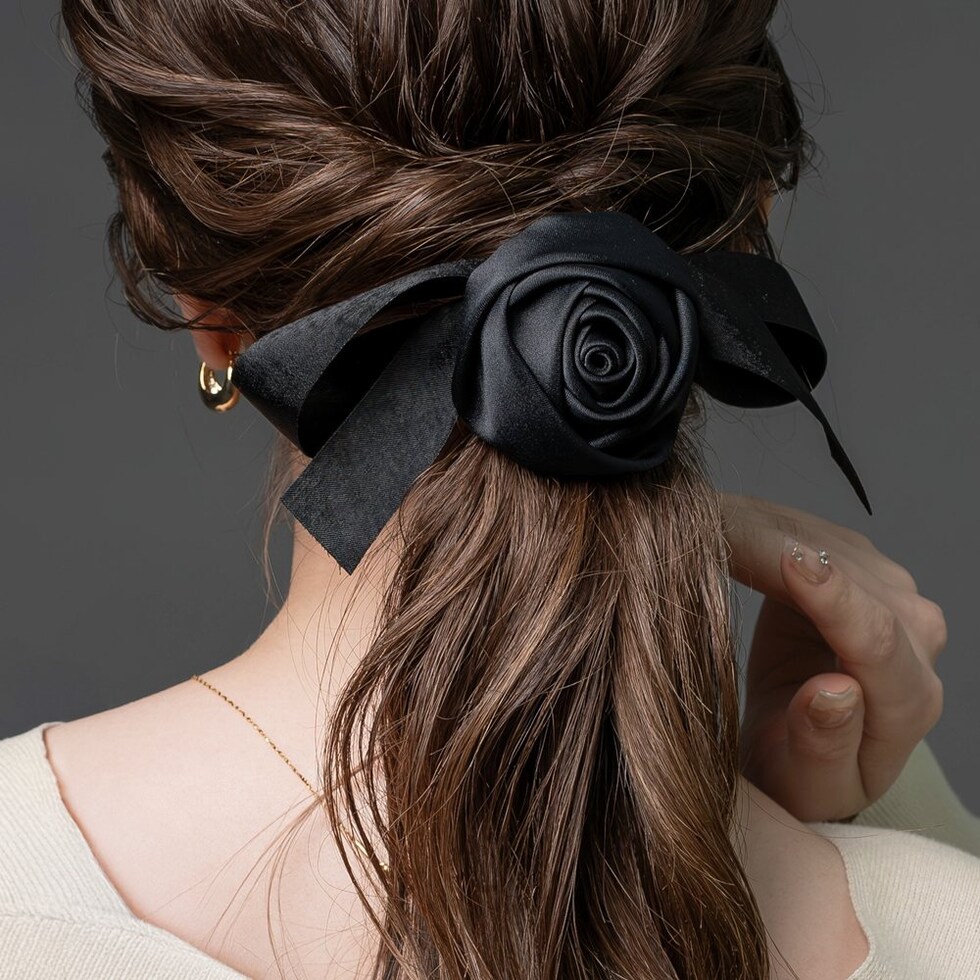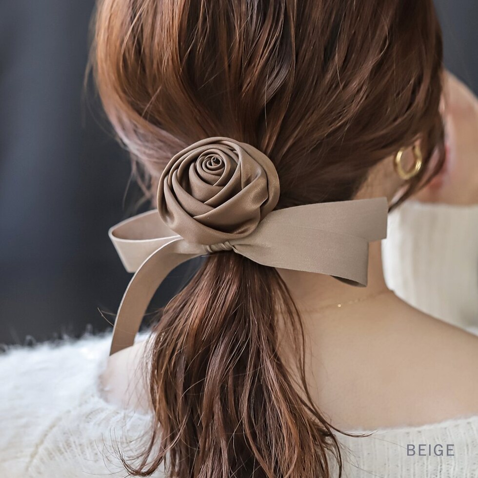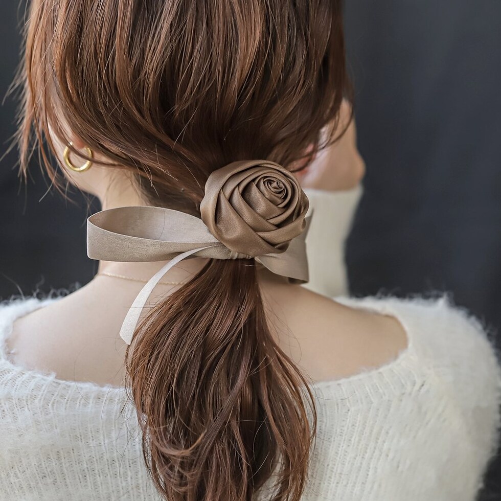 トレンド艶ローズポニーの大人色リボンヘアゴム。艶感のあるサテン生地のローズモチーフがトレンドで、落ち着いた大人色のリボンと合わせて高見えしそう◎ラフなまとめ髪にサッと結ぶだけで華やかなヘアスタイルに仕上げてくれます。