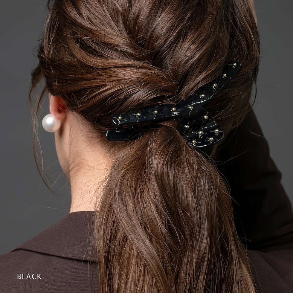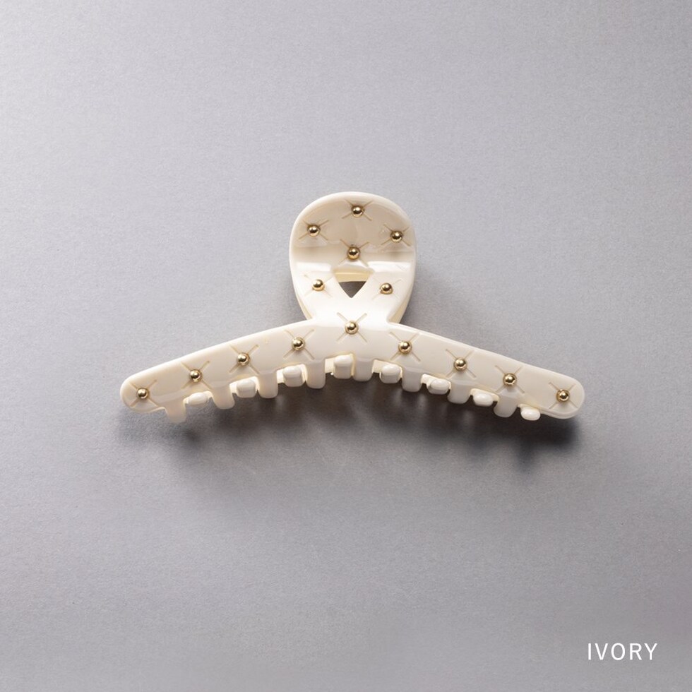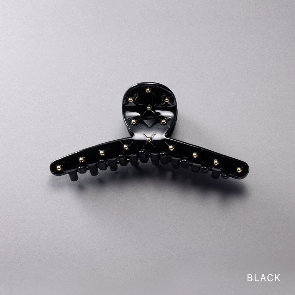 ドットメタル×キルティングデザインのヘアクリップ。キルティングテイストの艶カラークリップに小さなメタルを散りばめたドットデザインが大人っぽい逸品。ビッグサイズで存在感抜群だから、これひとつでまとめ髪をグッと格上げしてくれます◎