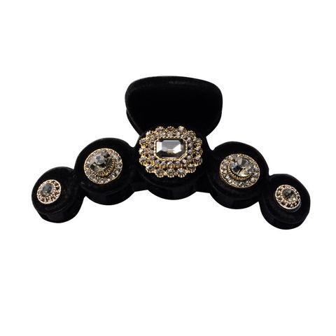 大きさ・形の異なるビジューやミル打ちデザインなど贅沢に飾ったデコラティブなバンスクリップ。ベロア調生地をベースにすることで、華やかすぎずシックで大人な雰囲気に◎ラフなまとめ髪もさっと挟むだけでこなれたアクセントを添えてくれます。デイリーからパーティーまで幅広く活躍するデザインです。