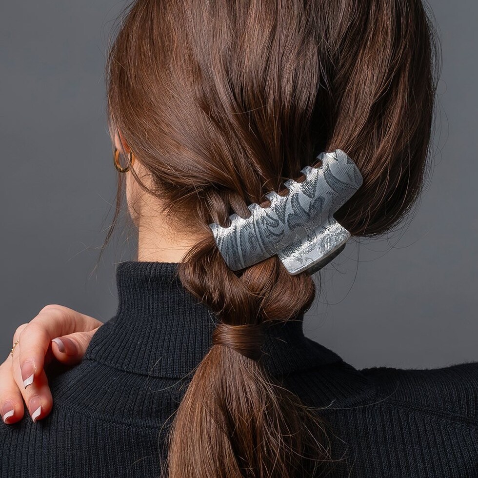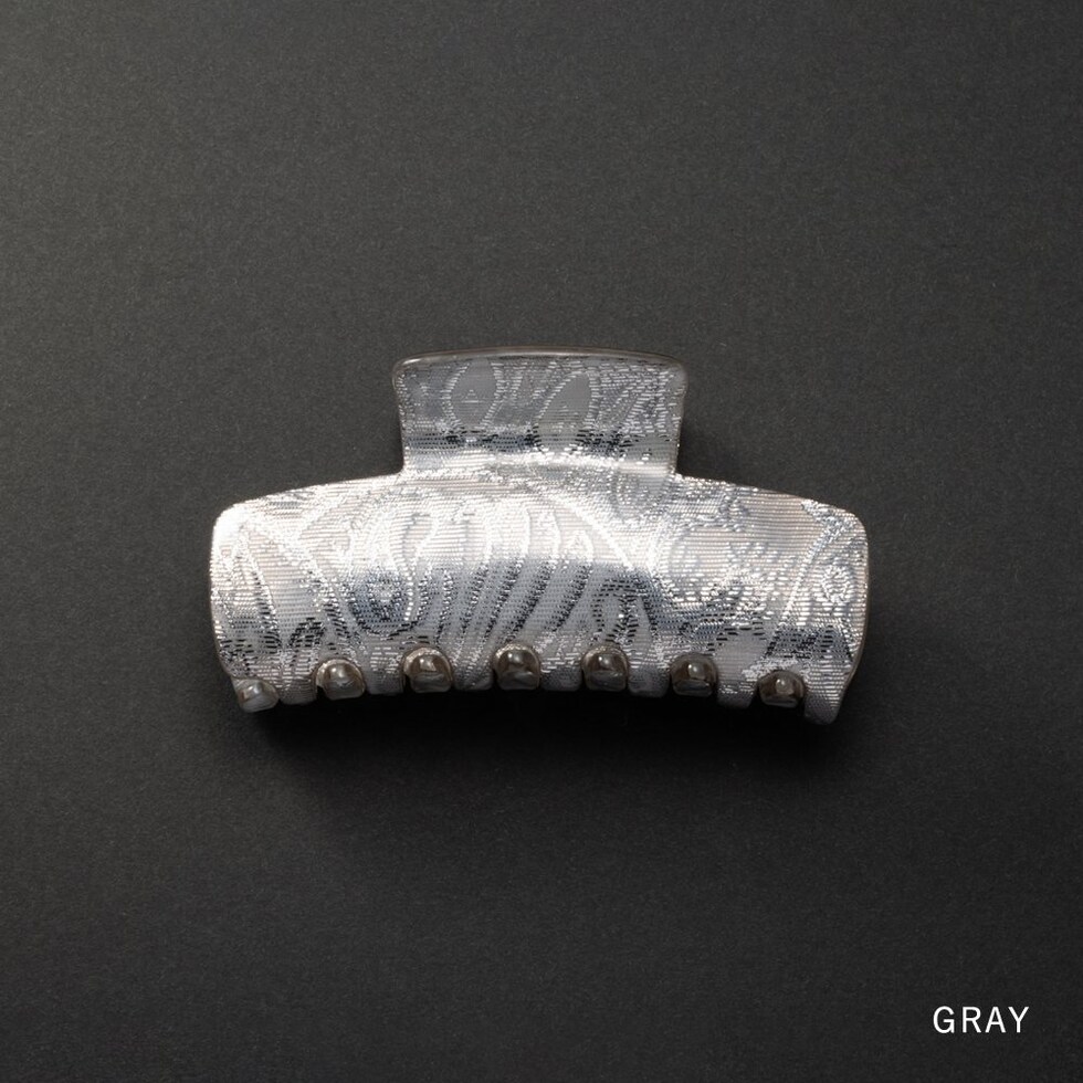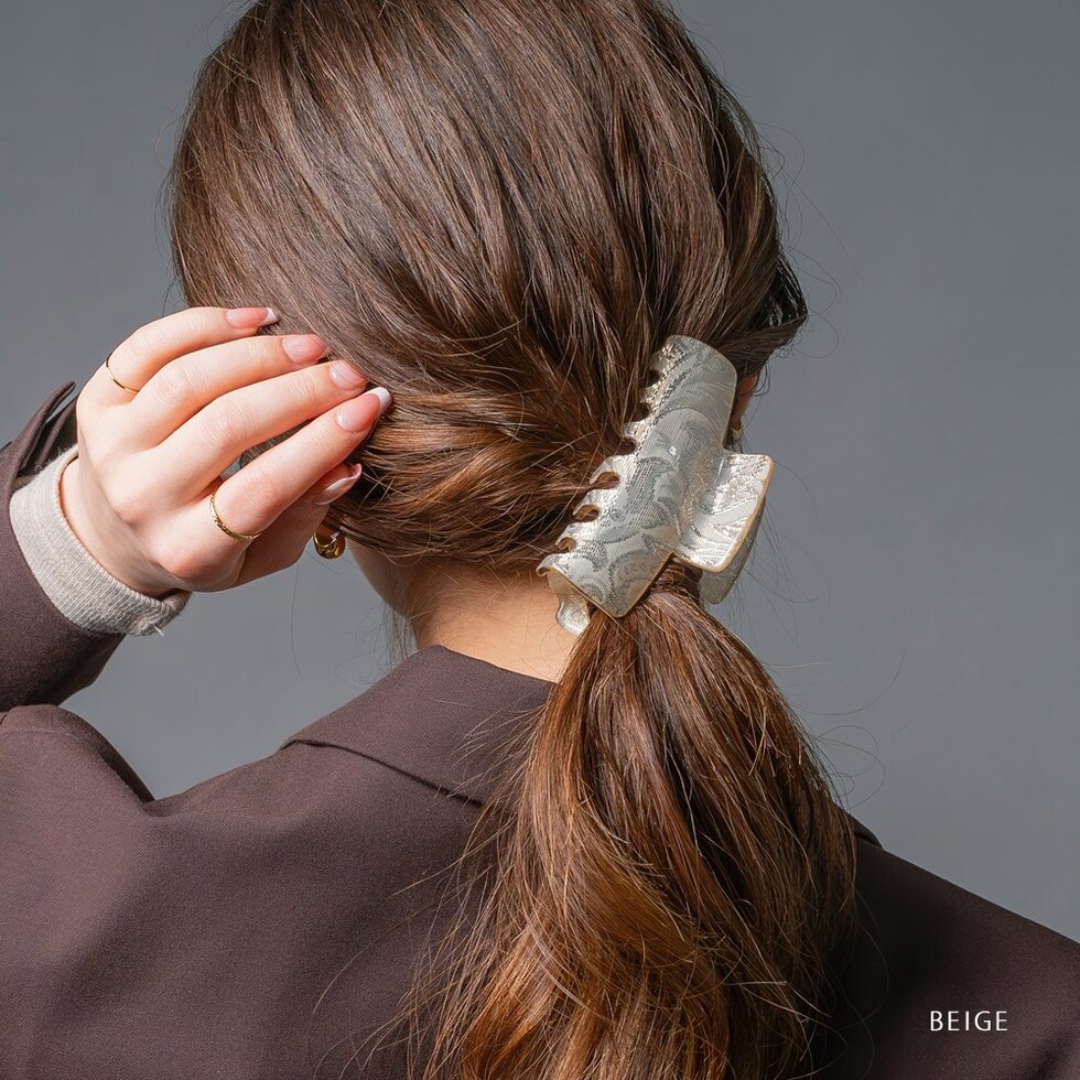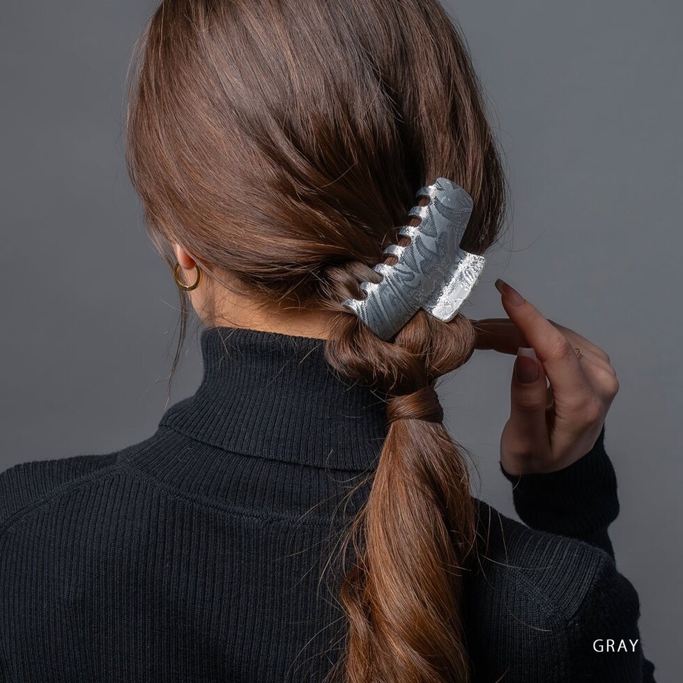 個性的で美しいジャガード模様のバンスクリップ 。コーデに馴染むカラーリングとジャガード模様が上品さと華やかさを演出◎ラフなまとめ髪にさっと挟むだけでこなれたアクセントを添えてくれます。