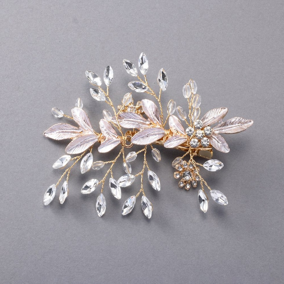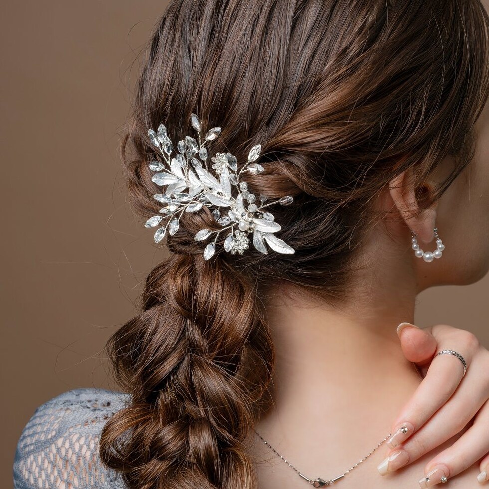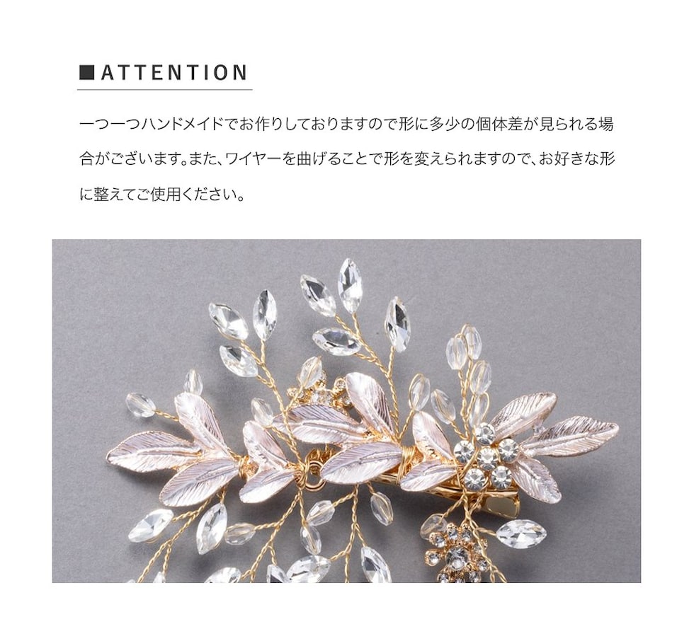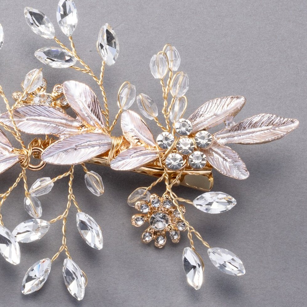存在感を放つデコラティブなボタニカルモチーフのヘアクリップ。マーキスカットビジューやリーフモチーフメタルなど、繊細なデザインと煌めくモチーフが女性らしい華やかな印象を演出します。ヘアアレンジを即エレガントに仕上げる、お呼ばれシーンにぴったりなアイテムです。