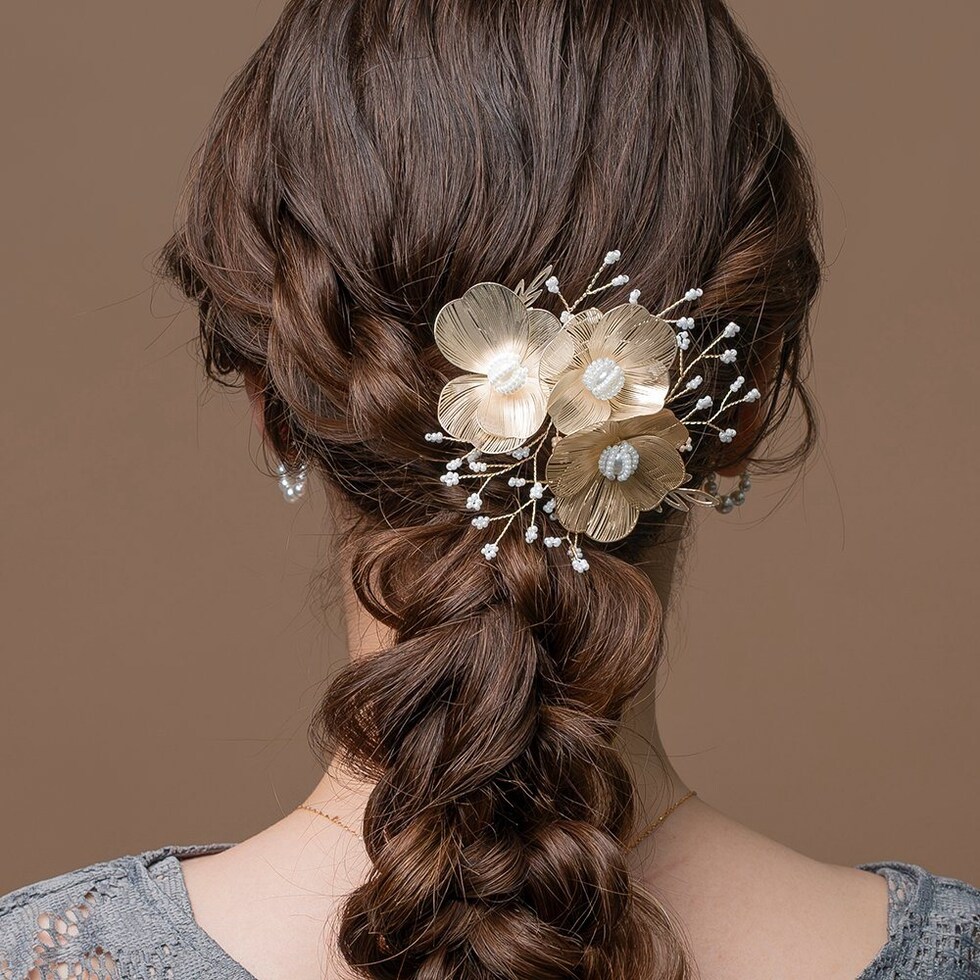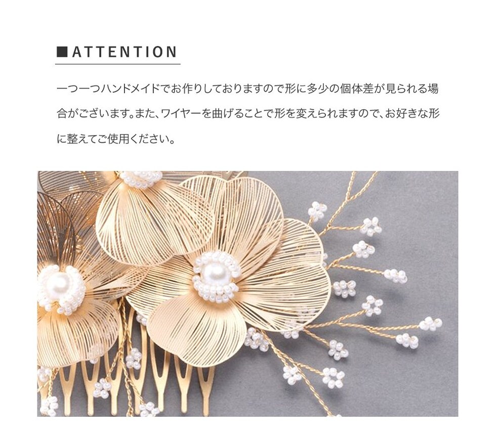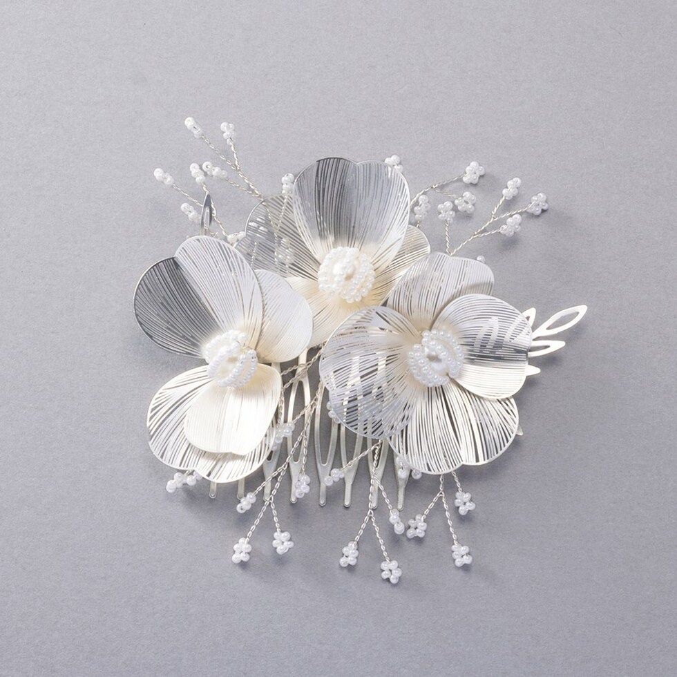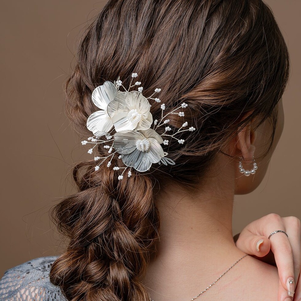 存在感を放つデコラティブなフラワーコーム。透かしフラワーや小枝ワイヤーにあしらわれた小粒パールなど、繊細なデザインと煌めくモチーフが女性らしい華やかな印象を演出します。ヘアアレンジを即エレガントに仕上げる、お呼ばれシーンにぴったりなアイテムです。