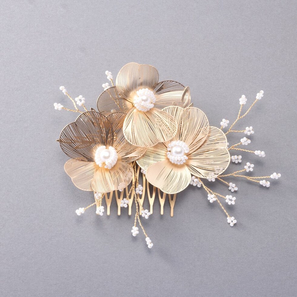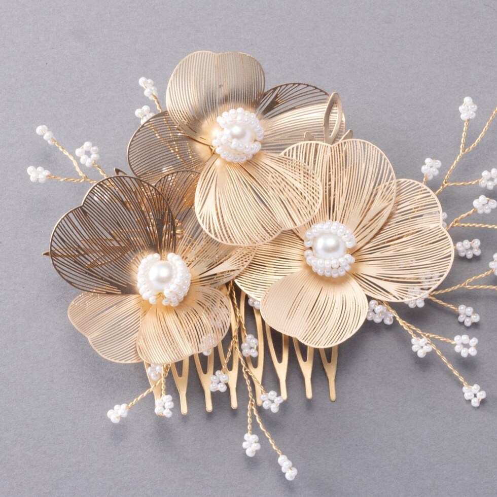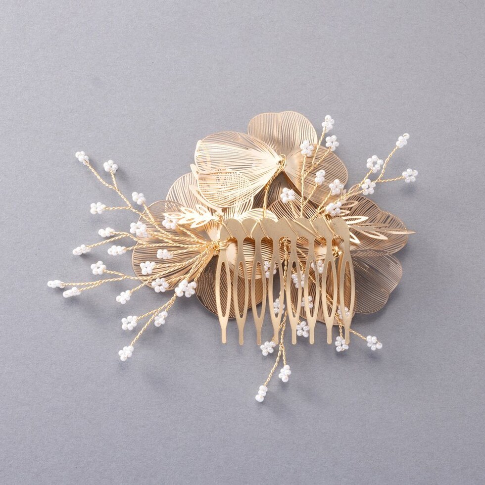 存在感を放つデコラティブなフラワーコーム。透かしフラワーや小枝ワイヤーにあしらわれた小粒パールなど、繊細なデザインと煌めくモチーフが女性らしい華やかな印象を演出します。ヘアアレンジを即エレガントに仕上げる、お呼ばれシーンにぴったりなアイテムです。